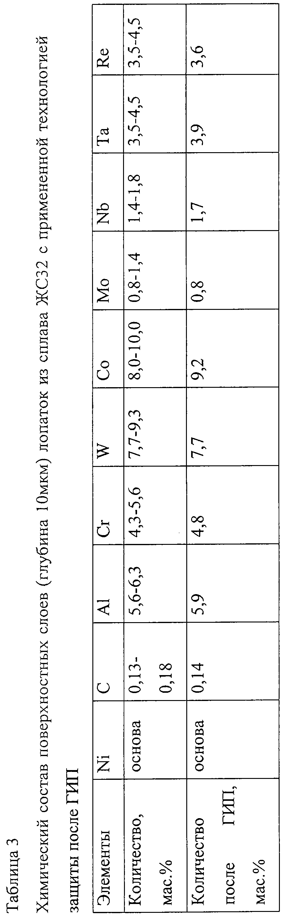 лопатки без защиты увеличилась на 550 МПа, а у лопатки с примененной защитой изменений микротвердости в поверхностном слое по сравнению с основным металлом нет (фиг.6). Пример 2. В течение 3 ч проводили ГИП при давлении 160 МПа и температуре 1250°С двух охлаждаемых лопаток из сплава ЖС32, одна лопатка имела защиту замка порошком Аl2O3 с