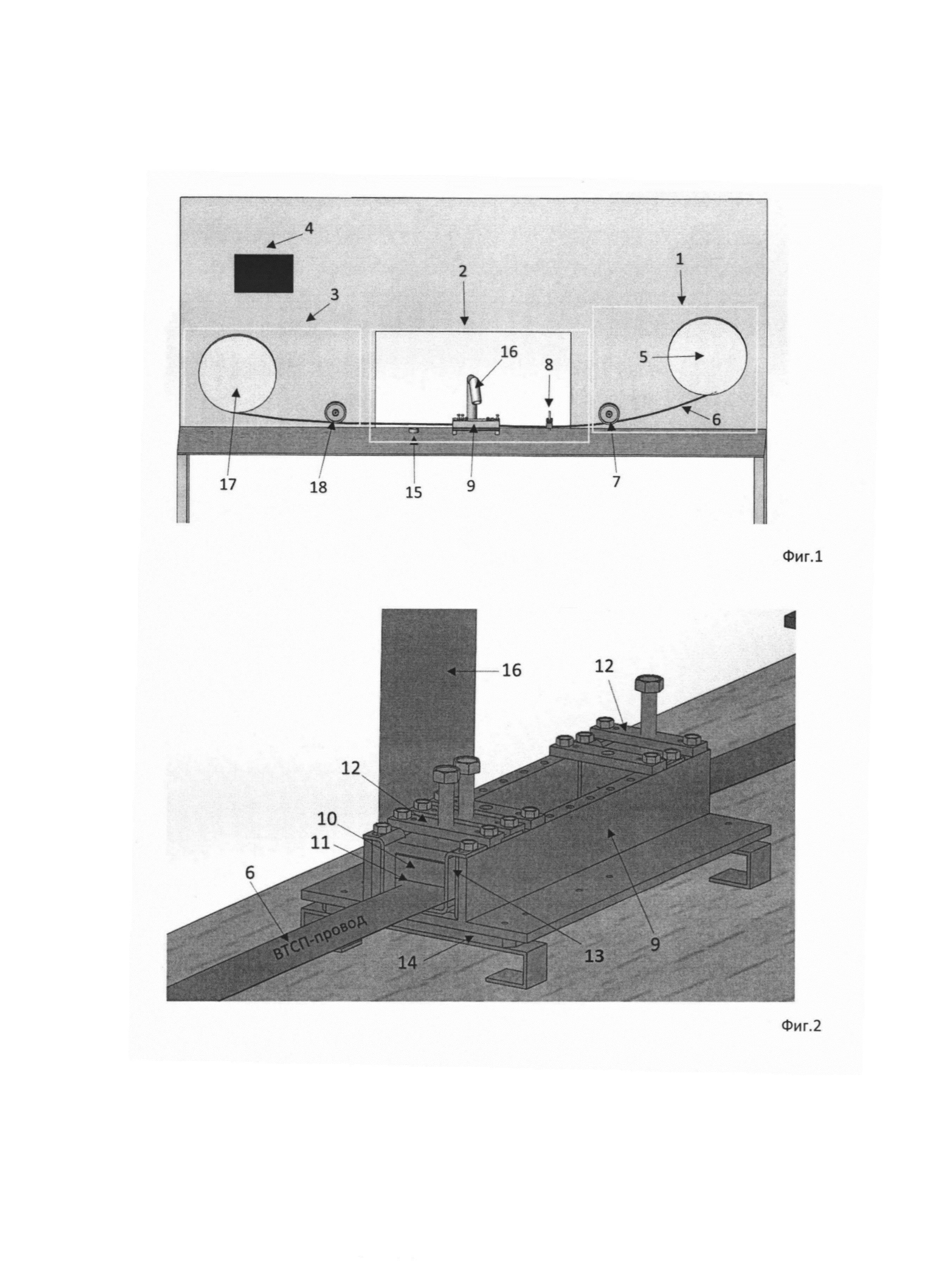 1. Установка для лужения высокотемпературных сверхпроводников (ВТСП-ленты), содержащая узел подачи ВТСП-ленты, узел лужения, узел приема луженой ВТСП-ленты и узел управления, при этом узел лужения ВТСП-ленты включает средство для подачи на нее флюса, ванну для лужения и систему охлаждения, установленную за ванной для лужения, причем ванна для лужения выполнена в виде металлического желоба с возможностью расплавления в ней припоя и поддержания его в расплавленном состоянии, с закрепленными с каждого из его торцов по меньшей мере двумя блоками, выполненными из термостойкого полимера с антиадгезионными свойствами, расположенными один под другим с образованием заглушек для предотвращения вытекания припоя с каждой стороны желоба, при этом соседние блоки установлены с получением между ними регулируемого зазора для протяжки ВТСП-ленты в горизонтальном направлении, снабжены ограничителями их перемещения в желобе и закреплены посредством прижимной пластины с регулировочными болтами. 2. Установка по п. 1, отличающаяся тем, что закрепленные в торцах желоба блоки выполнены из фторопласта, в частности из политетрафторэтилена. 3. Установка по п. 1, отличающаяся тем, что блоки со стороны узла подачи ВТСП-ленты выполнены из политетрафторэтилена, а со стороны узла приема - из меламина. 4. Установка по п. 1, отличающаяся тем, что узел лужения снабжен вытяжкой. 5. Установка по п. 1, отличающаяся тем, что ванна для лужения снабжена трубчатым нагревателем. 6. Установка по п. 1, отличающаяся тем, что узел подачи ВТСП-ленты содержит двигатель с посадочным местом, на которое установлена подающая катушка и направляющий ролик. 7. Установка по п. 1, отличающаяся тем, что узел приема ВТСП-ленты содержит двигатель с посадочным местом, на которое установлена принимающая катушка и принимающий ролик.