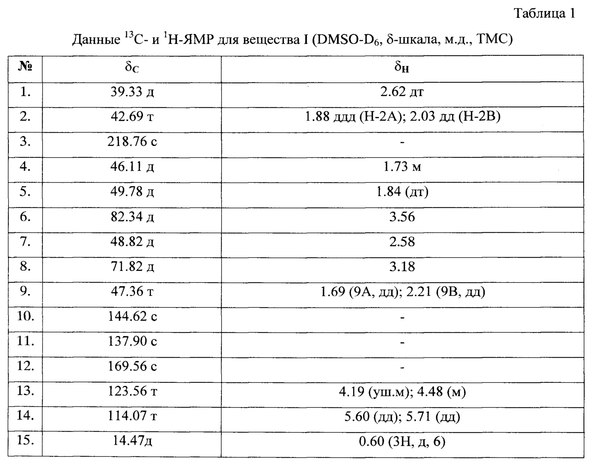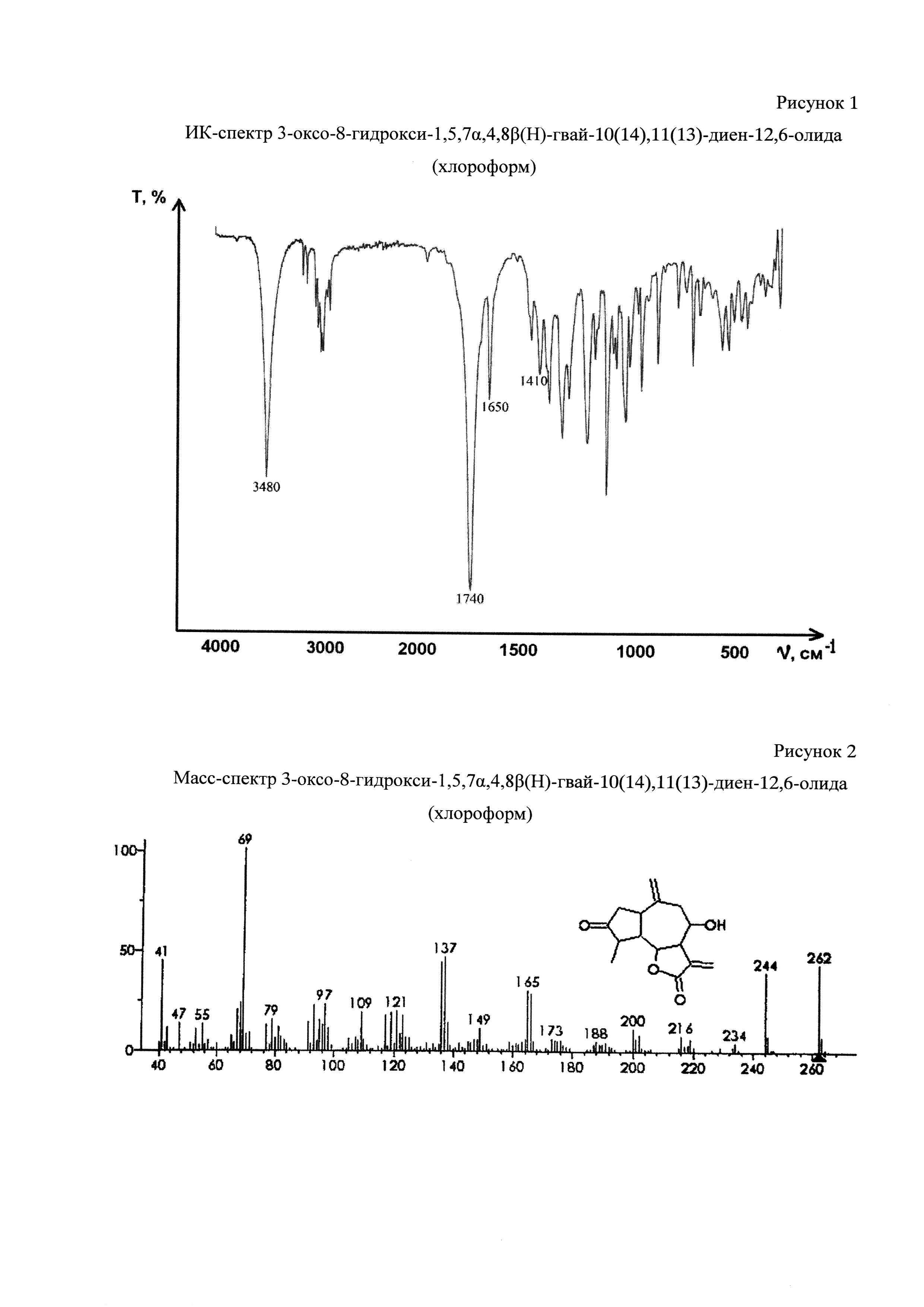 Изобретение относится к химико-фармацевтической промышленности и представляет собой способ выделения 3-оксо-8-гидрокси-1,5,7α,4,8β(Н)-гвай-10(14),11(13)-диен-12,6-олида из надземной части василька шероховатого (Centaurea scabiosa L.) или василька ложнопятнистого (Centaurea pseudomaculosa (Dobrocz.)), заключающийся в экстракции измельченной надземной части указанных растений водой, очищенной при температуре 80°С в течение 1,5 ч, при масс. объемном соотношении сырье:экстрагент 1:20 и кратности экстракции 2 с последующей жидко-фазной экстракцией водного извлечения хлороформом при объемном соотношении 1:1 и хроматографированием полученной фракции методом колоночной хроматографии на силикагеле с последовательным элюированием петролейным эфиром и смесью петролейный эфир - этилацетат с сопутствующей перекристаллизацией целевого продукта. Изобретение позволяет улучшить способ выделения 3-оксо-8-гидрокси-1,5,7α,4,8β(Н)-гвай-10(14),11(13)-диен-12,6-олида, заключающийся в избирательной экстракции растительного сырья очищенной водой, с последующим извлечением хлороформом, очисткой методом колоночной хроматографии и перекристаллизацией. 2 ил., 1 табл., 1 пр.