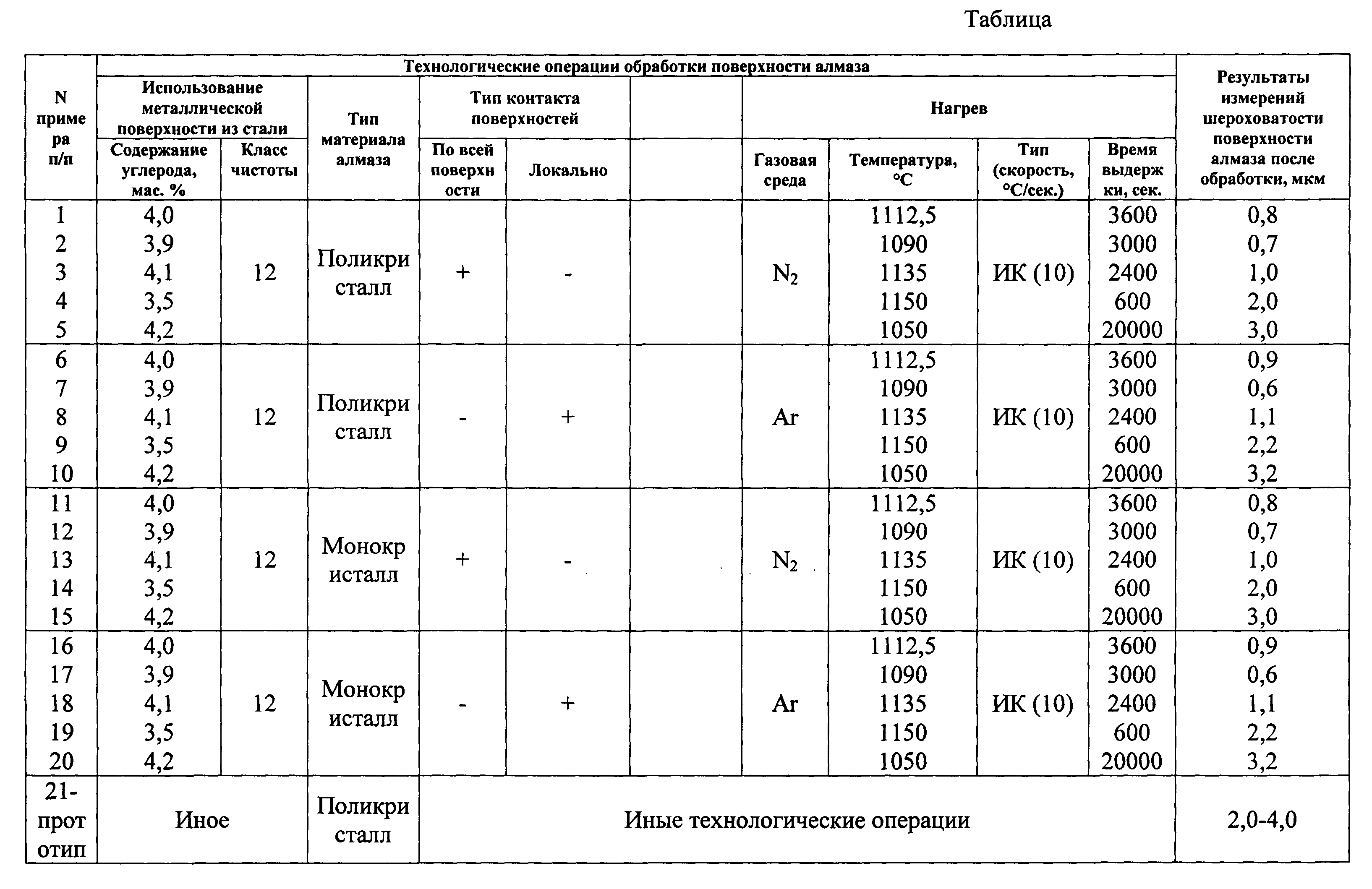 1. Способ обработки поверхности алмаза, включающий взаимное расположение в одной плоскости исходной поверхности алмаза и металлической поверхности из стали, обеспечение непосредственного контакта упомянутых поверхностей, термическую обработку исходной поверхности алмаза на заданную глубину, обеспечивающую заданную конечную поверхность алмаза, при этом предусматривающую нагрев упомянутых поверхностей до температуры образования эвтектического сплава железо - углерод, выдержку при этой температуре и естественное охлаждение, отличающийся тем, что металлическую поверхность из стали берут с содержанием углерода 3,9-4,1 мас. %, с классом чистоты поверхности со стороны контакта упомянутых поверхностей не менее 12, контакт упомянутых поверхностей осуществляют по всей их поверхности либо локально согласно заданной конечной поверхности алмаза, нагрев упомянутых поверхностей осуществляют в среде азота или инертного газа при температуре 1090-1135°C с заданной скоростью, выдержку при этой температуре осуществляют в течение времени, определяемого из выражения: 2. Способ обработки поверхности алмаза по п. 1, отличающийся тем, что заданную конечную поверхность алмаза характеризуют качеством обработки, конфигурацией и формой. 3. Способ обработки поверхности алмаза по п. 1, отличающийся тем, что в случае осуществления контакта упомянутых поверхностей локально металлическая поверхность из стали со стороны контакта исходной поверхности алмаза может быть выполнена с обеспечением заданной конечной поверхности алмаза. 4. Способ обработки поверхности алмаза по п. 1, отличающийся тем, что заданную скорость нагрева упомянутых поверхностей определяют исходя из метода нагрева, например метода инфракрасного излучения. 5. Способ обработки поверхности алмаза по п. 1, отличающийся тем, что исходной поверхностью алмаза может быть как поверхность поликристаллического, так и монокристаллического алмаза.