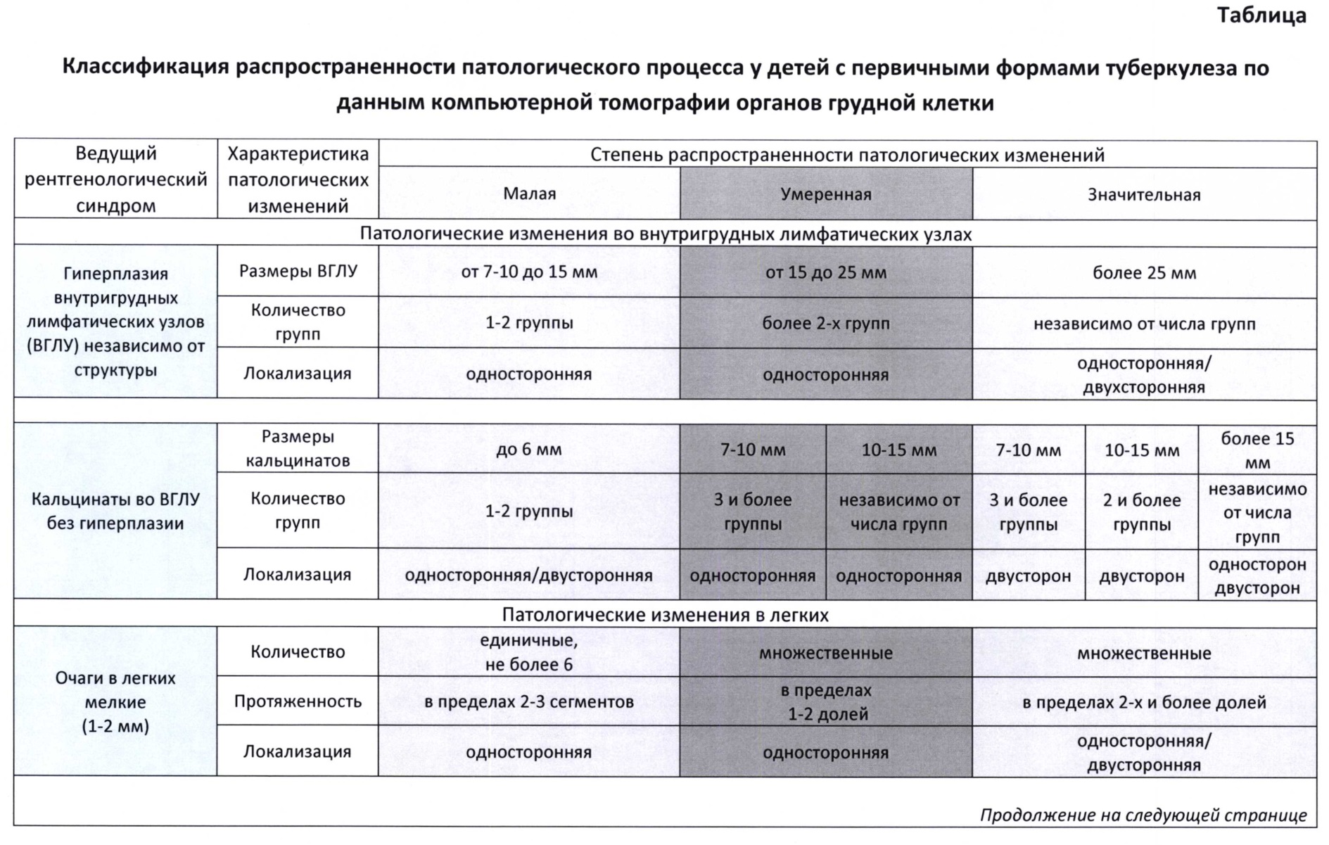 Способ дифференцированной оценки степени распространенности патологического процесса у детей с первичными формами туберкулеза, заключающийся в том, что проводят рентгеновскую компьютерную томографию органов грудной клетки, отличающийся тем, что определяют ведущий рентгенологический синдром и степень распространенности патологических изменений со стороны внутригрудных лимфатических узлов и/или легких, при этом выделяют процессы с малой, умеренной и значительной степенями распространенности у детей с первичными формами туберкулеза, причем при наличии гиперплазии внутригрудных лимфатических узлов независимо от наличия или отсутствия структурных изменений в них к малой степени распространенности относят односторонние процессы с поражением 1-2 групп внутригрудных лимфатических узлов размерами от 10 мм до 15 мм, к умеренной степени распространенности относят одностороннее поражение более двух групп внутригрудных лимфатических узлов размерами от 15 до 25 мм, к значительной степени распространенности относят как одностороннее, так и двустороннее поражение любого числа групп внутригрудных лимфатических узлов размерами более 25 мм, при наличии кальцинтов во внутригрудных лимфатических узлах без их гиперплазии к малой степени распространенности относят как одностороннее, так и двустороннее поражение оной и/или двух групп с размерами кальцинатов до 6 мм, к умеренной степени распространенности относят односторонние процессы с поражением трех и более групп размерами 7-10 мм или размерами 10-15 мм независимо от числа групп, к значительной степени распространенности относят двустороннее поражение трех и более групп размерами 7-10 мм или двух и более групп размерами 10-15 мм, а также одностороннее и двустороннее поражение размерами более 15 мм независимо от числа групп, при наличии мелких очагов в легких размерами 2 мм к малой степени распространенности относят односторонние процессы с наличием единичных очагов, к умеренной степени распространенности относят наличие множественных очагов в пределах одной-двух долей в легком при одностороннем процессе, к значительной степени распространенности относят наличие множественных очагов в пределах 2-х и более долей, как с односторонней, так и двусторонней локализацией, при наличии средних, размерами 3-5 мм, очагов в легких к малой степени распространенности относят односторонние процессы с единичными, не более 6, очагами, расположенными в пределах 2-3 сегментов, к умеренной степени распространенности относят односторонние процессы с наличием единичных очагов, не более 6, в пределах одной-двух долей, к значительной степени распространенности относят как односторонние, так и двусторонние процессы с множественными очагами в пределах двух и более долей, при наличии крупных очагов в легких размерами 6-10 мм к малой степени распространенности относят односторонний одиночный очаг в пределах одного сегмента, к умеренной степени распространенности относят единичные, не более 6, односторонние очаги в пределах одной доли, к значительной степени распространенности относят как односторонние, так и двусторонние процессы с множественными очагами в пределах двух и более долей, при наличии лобулярного или субсегментарного инфильтрата в легких к малой степени распространенности относят нали