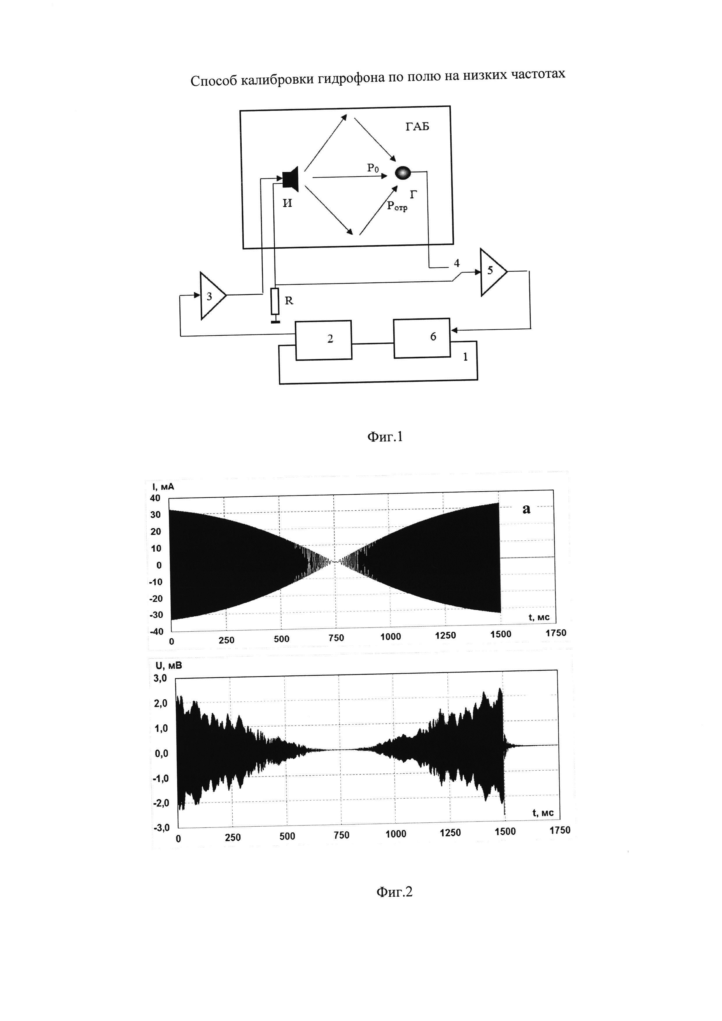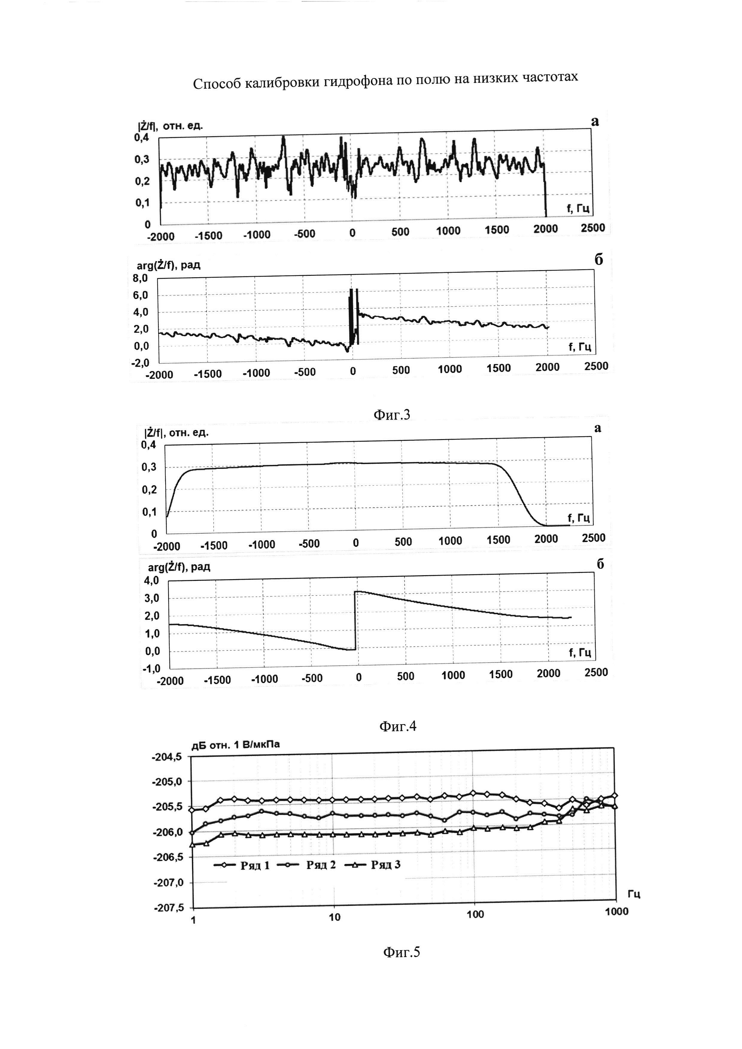 Изобретение относится к метрологии, в частности к гидроакустическим измерениям. Гидрофон располагают в бассейне на определенном расстоянии от излучателя. Излучатель возбуждают линейно-частотно-модулированным сигналом, частоту которого уменьшают от начального значения до нуля, затем, сохраняя непрерывность фазы сигнала, увеличивают до начальной частоты. Регистрируя мгновенные значения тока излучателя и выходного напряжения гидрофона, определяют комплексную частотную зависимость передаточного импеданса пары излучатель-гидрофон в реверберационном звуковом поле бассейна в интервале частот, симметричном относительно нулевой частоты. Полученную частотную зависимость корректируют на частотную зависимость параметра взаимности. Частотную зависимость ПИ пары излучатель-гидрофон в свободном поле определяют скользящим комплексным взвешенным усреднением скорректированной частотной зависимости. Технический результат – обеспечение возможности калибровки гидрофонов на частотах, меньших половины ширины частотного интервала, и повышение точности калибровки на низких частотах. 5 ил.