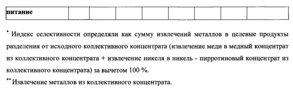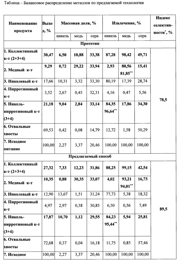Изобретение относится к области обогащения полезных ископаемых методом пенной флотации, в частности к обогащению полиметаллических руд, содержащих сульфидные минералы никеля, меди и железа и может быть использовано для других материалов, содержащих сульфиды никеля, меди и железа. Известен способ селективной флотации минералов меди из труднообогатимых сульфидно-окисленных медных руд, заключающийся в измельчении руды, флотационном выделении сульфидных минералов меди в концентрат последовательным добавлением реагентов - собирателя и вспенивателя и флотационном выделении из оставшейся пульпы в другой концентрат окисленных минералов меди последовательным добавлением реагентов - сульфидизатора, вспенивателя, собирателя, модификатора жидкого стекла, при этом при флотационном выделении сульфидных и окисленных минералов меди после добавления каждого из реагентов проводят кондиционирование в течение 1-3 мин, причем в качестве собирателя используется бутиловый ксантогенат, а в качестве вспенивателя - реагент Т-80 в количестве 30-60 г/т (RU 2352402, B03D 1/02, опубл. 20.04.2009). Недостатком известного способа является сравнительно низкое извлечение меди в медный концентрат - на уровне 60%. Известен способ флотационного обогащения сульфидных медно-никелевых руд, включающий двухстадиальное измельчение руды в щелочной среде, коллективную флотацию сульфидных минералов в присутствии сульфгидрильных собирателей с получением коллективного медно-никелевого концентрата и отвальных хвостов, доводку черновых концентратов с доизмельчением коллективного концентрата. Пенный продукт I основной флотации поступает на десорбцию, отмывку, сгущение, классификацию, доизмельчение песков классификации, механохимическую активацию измельченного продукта в присутствии диспергатора, подогрев, контактирование с реагентами: диспергатором и депрессором. Пенный продукт I основной флотации поступает в цикл перечистных операций флотации, проводимых в присутствии сульфгидрильного собирателя и вспенивателя с получением 1-го коллективного концентрата и хвостов, которые направляются на классификацию перед II стадией измельчения. Хвосты I основной флотации поступают на II стадию измельчения до крупности не менее 90% класса - 74 мкм, контактирование с реагентами вспенивателем, депрессором, далее поступают на II основную флотацию, проводимую в присутствии сульфгидрильного собирателя и вспенивателя с получением коллективного концентрата II основной флотации и отвальных хвостов. Пенный продукт II основной флотации поступает на десорбцию, отмывку, сгущение, классификацию, доизмельчение песков классификации, механохимическую активацию измельченного продукта в присутствии диспергатора, подогрев, контактирование с реагентами: диспергатором и депрессором, далее пенный продукт II основной флотации поступает в цикл перечистных операций, проводимых в присутствии сульфгидрильного собирателя и вспенивателя с получением 2-го коллективного концентрата (RU 2404858, B03D 1/02, В03В 9/00, опубл. 27.11.2010). Способ позволяет эффективно осуществить флотацию сульфидных медно-никелевых руд с получением высококачественного коллективного концентрата с содержанием никеля не менее 15% и меди не менее 5% при извлечении 75% и 75,5% соответственно. Недостатком способа является громоздкость технологи