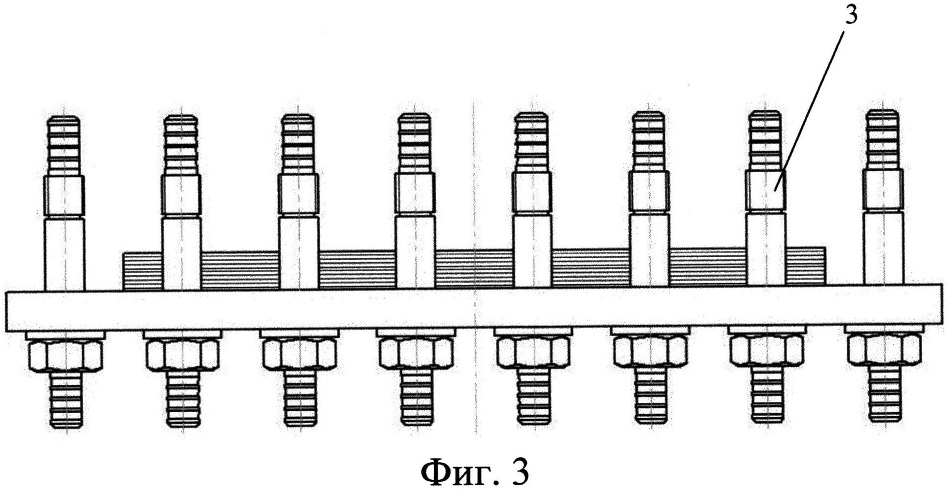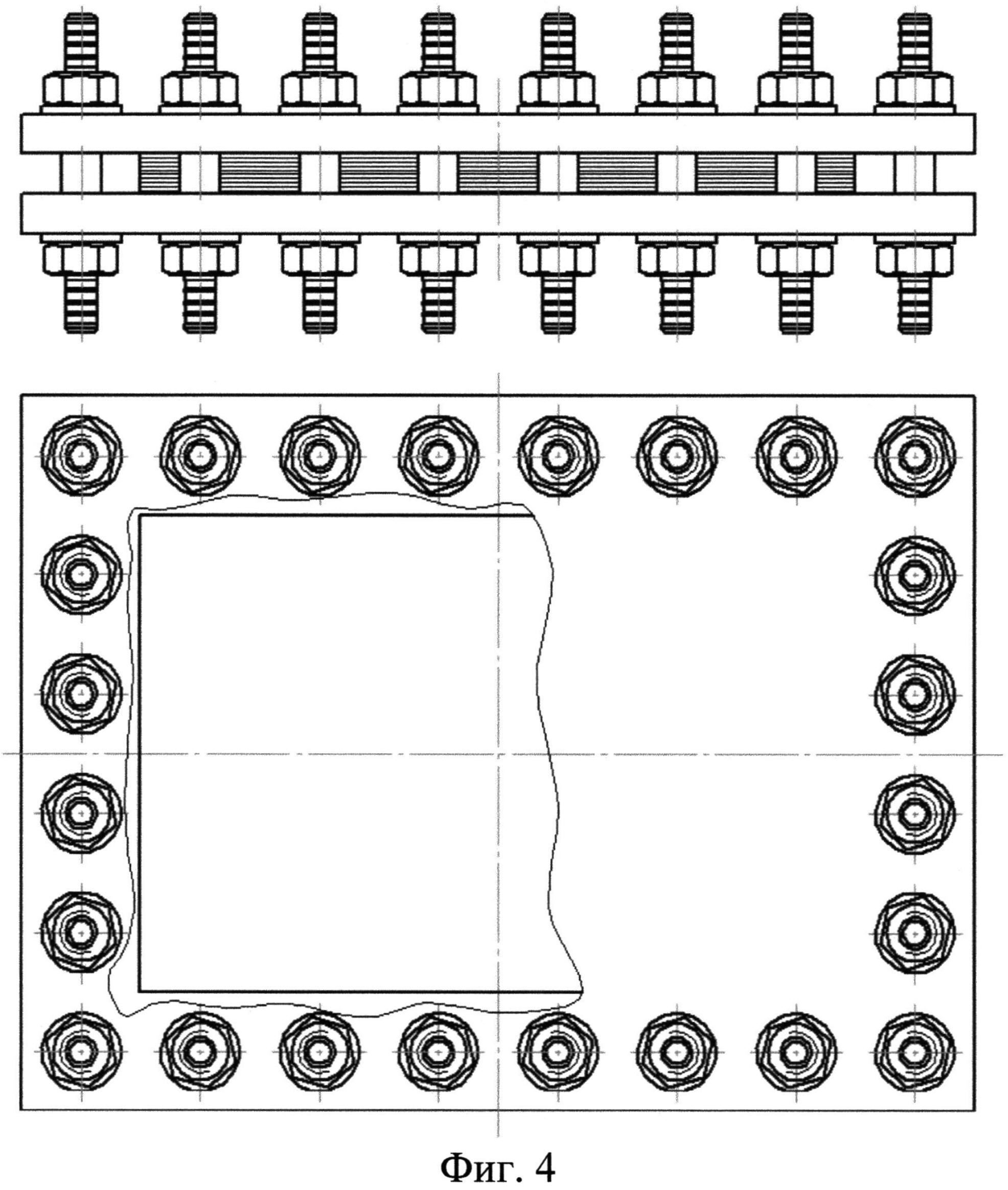 Изобретение относится к машиностроению, преимущественно к точному. В современном точном машиностроении широко используются электронные модули, в состав которых входят плоские металлические подложки. Если подложка не будет плоской, то, напыляя различные слои, плоскостности добиться будет невозможно, так как одинаково ″волны″ поверхности будут покрываться равнотолщинным слоем напыляемого материала. А для монтажа электронных компонентов планарность (плоскостность) поверхности, на которую осуществляется монтаж, является одним из важных параметров. Известны следующие способы выравнивания геометрических неровностей металлических пластин: механической планаризации (например, фрезерование), наиболее распространенный и применяемый - способ химико-механической планаризации, плазменная планаризация. Во всех этих способах удаляется слой металла с поверхности пластины (в последнем способе - за счет испарения) (http://ru.wikipedia.org/wiki/%D0%A5%D0%B8%D0%BC%D0%B8%D0%BA%D0%BE-%D0%BC%D0%B5%D1%85%D0%B0%D0%BD%D0%B8%D1%87%D0%B5%D1%81%D0%BA%D0%B0%D1%8F_%D0%BF%D0%BB%D0%B0%D0%BD%D0%B0%D1%80%D0%B8%D0%B7%D0%B0%D1%86%D0%B8%D1%8F, http://www.google.ru/url?sa=t&rct=j&q=&esrc=s&source=web&cd=3&ved=0CDUQFjAC&ur l=http%3A%2F%2Fvesmik.pstu.ru%2F_engine%2Fget_file.php%3Ff%3D542%26d%3D_res%2Ffs% 2F%26p%3Dfile.pdf%26n%3D%25C3%25CE%25CB%25DC%25C4%25D8%25D2%25C5%25C9% 25CD%2520%25D0.%5C2.%2C%2520%25CE%25D1%25C8%25CF%25C5%25CD%25CA%25CE %2520%25CC.%25CD.%2520%25D5%25E8%25EC%25E8%25EA%25EE-%25EC %25E5%25F5%25E0%25ED%25E8%25F7%25E5%25F1%25EA%25EE%25E5%2520%25EF%25E E%25EB%25E8%25F0%25EE%25E2%25E0%25ED%25E8%25E5.%2520%25D7%25E0%25F1%2 5F2%25FC%2520I.%2520%25CE%25F1%25ED%25EE%25E2%25ED%25FB%25E5%2520%25E7 %25E0%25EA%25EE%25ED%25EE%25EC%25E5%25F0%25ED%25EE%25F1%25F2%25E8%3A %2520%25EE%25E1%25E7%25EE%25F0&ei=crcbUsnHC6aC4gSJt4CABg&usg=AFQiCNGpx5Ms KKsIQH-VfhFAmHXfS6jTMA&bvm=bv.51156542,d.bGE&cad=rjt, http://cactus.stack.net/search.html?word=%D1%85%D0%B8%D0%BC%D0%B8%D0%BA%D0%BE-%D0%BC%D0%B5%D1%85%D0%B0%D0%BD%D0%B8%D1%87%D0%B5%D1%81%D0%BA%D0%B0%D1%8F%20%D0%BF%D0%BB%D0%B0%D0%BD%D0%B0%D1%80%DO%B8%D0%B7%D0%B0%D1%86%D0%B8%D1%8F, http://www.findpatent.ru/patent/223/2235747.html, http://technomag.edu.ru/doc/282054.html). Известны также различные способы терморихтовки, один из которых (SU 352953 А1) выбран за прототип. Предлагаемый способ терморихтовки отличается от прототипа тем, что нагрев металлических листов прямоугольной или круглой формы (это может быть и один лист), размещенных между плоскими, сжимающими пакет плитами, нагревают, помещая собранное устройство в печь для равномерного его нагрева до температуры пластичности рихтуемого металла, а охлаждение после извлечения из печи осуществляют избирательно, обеспечивая условия для более быстрого остывания элементов, например шпилек, зажимающих рихтуемые листы, что вызывает возникновение в шпильках термических напряжений, значительно усиливающих сжатие листов, сохраняющих пластичность, из-за замедленного остывания. Для реализации этого способа может быть использовано устройство, представляющее собой две массивные плоские шлифованные плиты, снабженные по контуру отверстиями, в которые вставляются зажимающие пакет листов шпильки, снабженные сквозными отверстиями, служащими для охлаждения шпилек, причем в устройстве предусмотрена возможность прохода воздуха через каналы как за счет естественной конвекции, так и за счет принудительной продувки воздуха от воздушной сети. Очень важным является то, что в предлагаемом изобретении обеспечивается усилие зажима пластин вплоть до 250 т и даже более. Технический результат изобретения - расширение арсенала технических средств планаризации металлических пластин. Фиг.1-5 упрощенно иллюстрируют пример реализации предлагаемого способа: 1. Берут плоскую массивную шлифованную плиту 1, снабженную по контуру отверстиями (фиг.1). 2. Размещают 