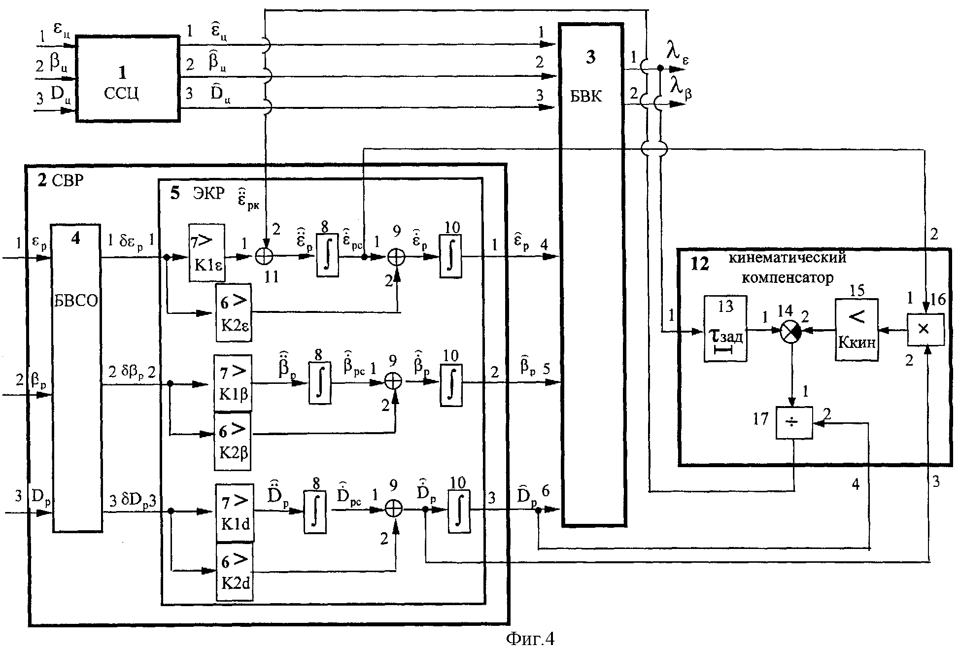 блока (7) первого канала ЭКР (5) необходимо на входе первого интегратора (8) просуммировать с сигналом управления U, соответствующим где Ккин и τзад - конструктивные параметры конкретной системы наведения, а остальные величины вырабатываются БВК (3) и ЭКР (5) системы. Для реализации управления U в систему кроме дополнительного сумматора (11) введен кинематический компенсатор (12) и образованы дополнительные связи, как показано на фиг.4. Кинематический