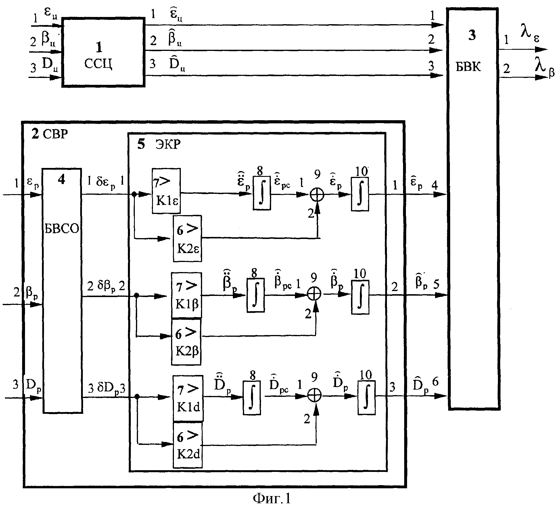 К1ε, К1β, K1d, заложенными в блоки (6). В соответствии со схемой ЭКР (5) образуются сигналы оценок: вторых производных координат первых производных координат, сглаженных первых производных координат, несмещенных координат С первого,