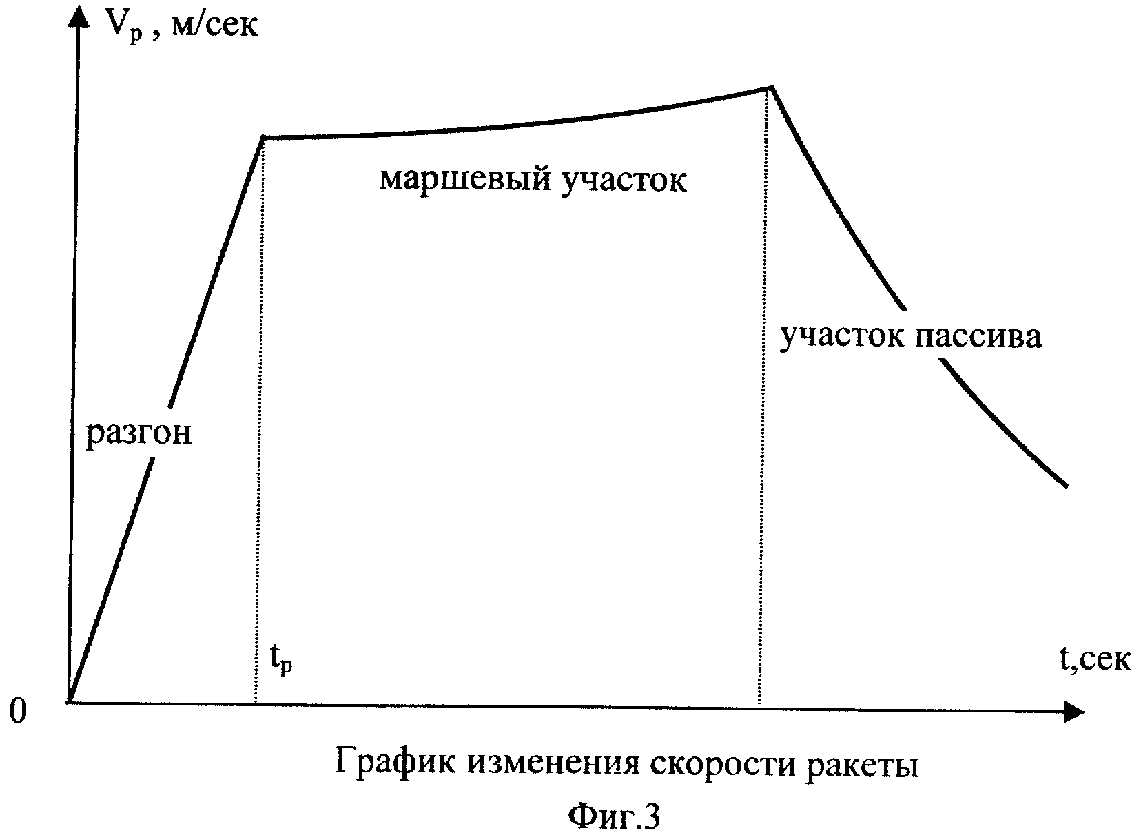 функцией. Действительно, рассматривая типовой график скорости ракеты на фиг.3, отмечаем, что тяга двигателя на этапе разгона, совпадающем по фазе с выводом в указанную точку зоны,