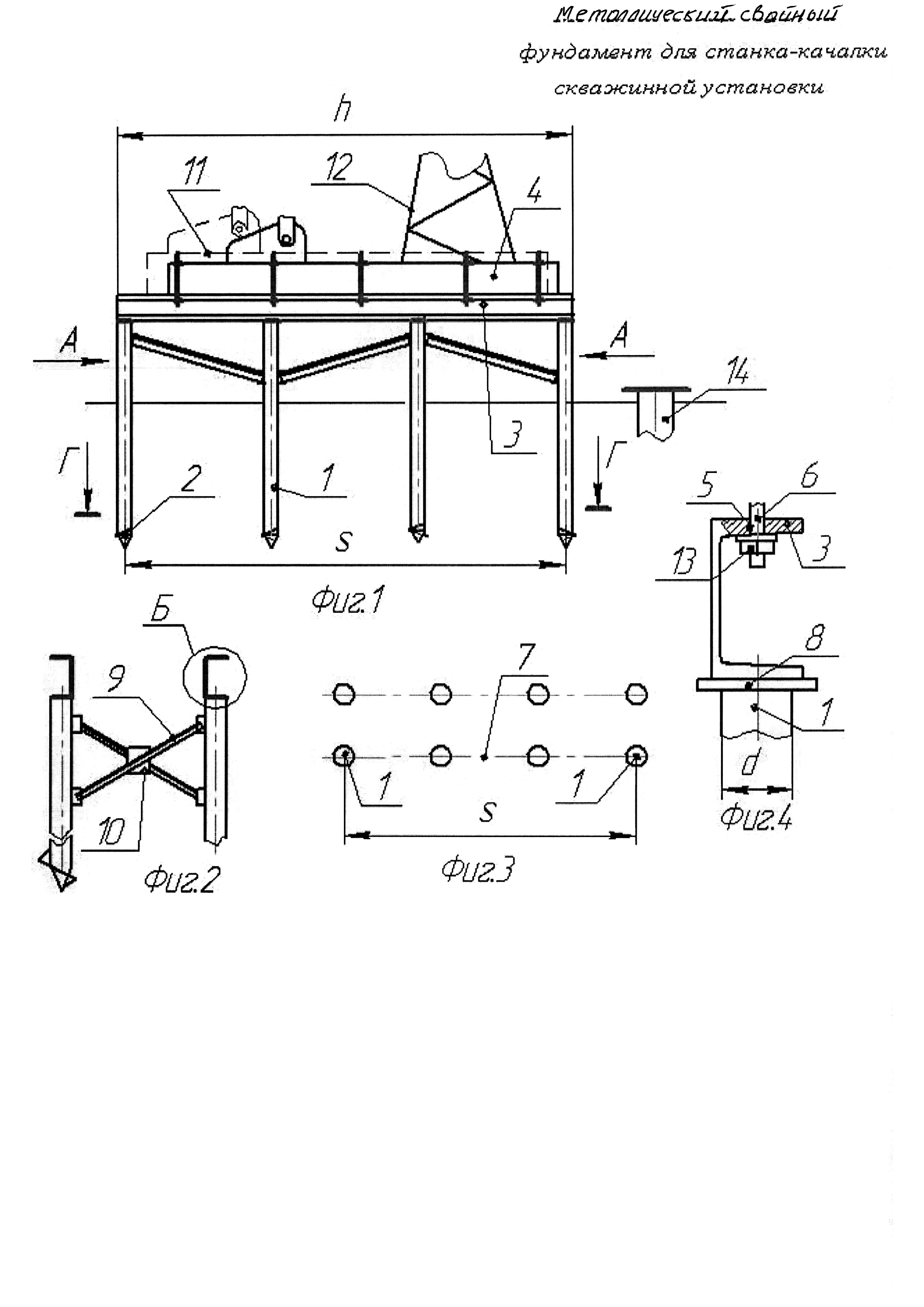 Изобретение относится к свайным фундаментам и может быть использовано для передачи нагрузки от установленной на фундаменте станка-качалки скважинной насосной установки грунту. Известен металлический свайный фундамент [1], включающий сваи, выполненные в виде вертикально расположенных труб, две из которых жестко связаны между собой двумя соединяющими балками, каждая из не связанных между собой труб в верхней части снабжена средством для опоры ростверка, ростверк выполнен в виде системы Г-образных балок, каждая из которых снабжена одним жестко соединенным с концом балки демпфером, посредством которого она опирается на средство для опоры. В этом фундаменте сваи выполнены в виде вертикально расположенных труб. Из-за этого недостаточно сцепление с грунтом для передачи нагрузки грунту от установленного на фундамент станка-качалки скважинной установки. Наиболее близким к предлагаемому является металлический свайный фундамент для станка-качалки скважинной установки [2], включающий сваи, выполненные в виде вертикально расположенных труб, и со шнеком на конце, соединяющие балки в виде швеллера для установки основания станка-качалки, причем на швеллере балок имеются отверстия со шпильками для крепления основания станка-качалки. Недостаток прототипа состоит в том, что он изготавливается под один типоразмер станка-качалки и поэтому применяется только для одного типа станка-качалки. При перемонтаже станка-качалки на другой типоразмер приходится менять металлический свайной фундамент. Задачей заявляемого технического решения является унификация металлического свайного фундамента для станка-качалки скважинной установки, позволяющего использовать его для разных типов станков-качалок. Поставленная техническая задача решается тем, что в металлическом свайном фундаменте для станка-качалки скважинной установки, включающем сваи, выполненные в виде вертикально расположенных труб, и со шнеком на конце, соединяющие балки в виде швеллера для установки основания станка-качалки, причем на швеллере балок имеются отверстия со шпильками для крепления основания станка-качалки, отличающийся тем, что количество соединяющих балок равно двум, при этом длина каждой балки выбрано равной наружному диаметру трубы сваи, плюс расстояние между двумя крайними трубами свай, расположенными в одном ряду этих труб, причем каждая балка расположена параллельно плоскости симметрии рядов труб свай, причем обе балки установлены на пластины, приваренные к верхним торцам труб свай, и соединены с этими пластинами сваркой, причем на две трубы сваи, расположенных вблизи скважины и на две трубы сваи, удаленных от скважины, приварены по два пересекающихся уголковых профиля, которые приварены друг к другу с помощью пластины, причем на швеллерах обеих балок отверстия для шпилек выполнены с возможностью крепления оснований разных типов станков-качалок, ширина основания которых отличается от расстояния между балками незначительно. Сущность заявляемого технического решения поясняется фигурами. На фиг. 1 изображен вид сбоку на предложенный фундамент; на фиг. 2 изображены виды А фиг. 1; на фиг. 3 изображен разрез Г-Г фиг. 1; на фиг. 4 - вид Б фиг. 2. Металлический свайный фундамент для станка-качалки скважинной установки включает сваи, выполненные в виде вертикальн
