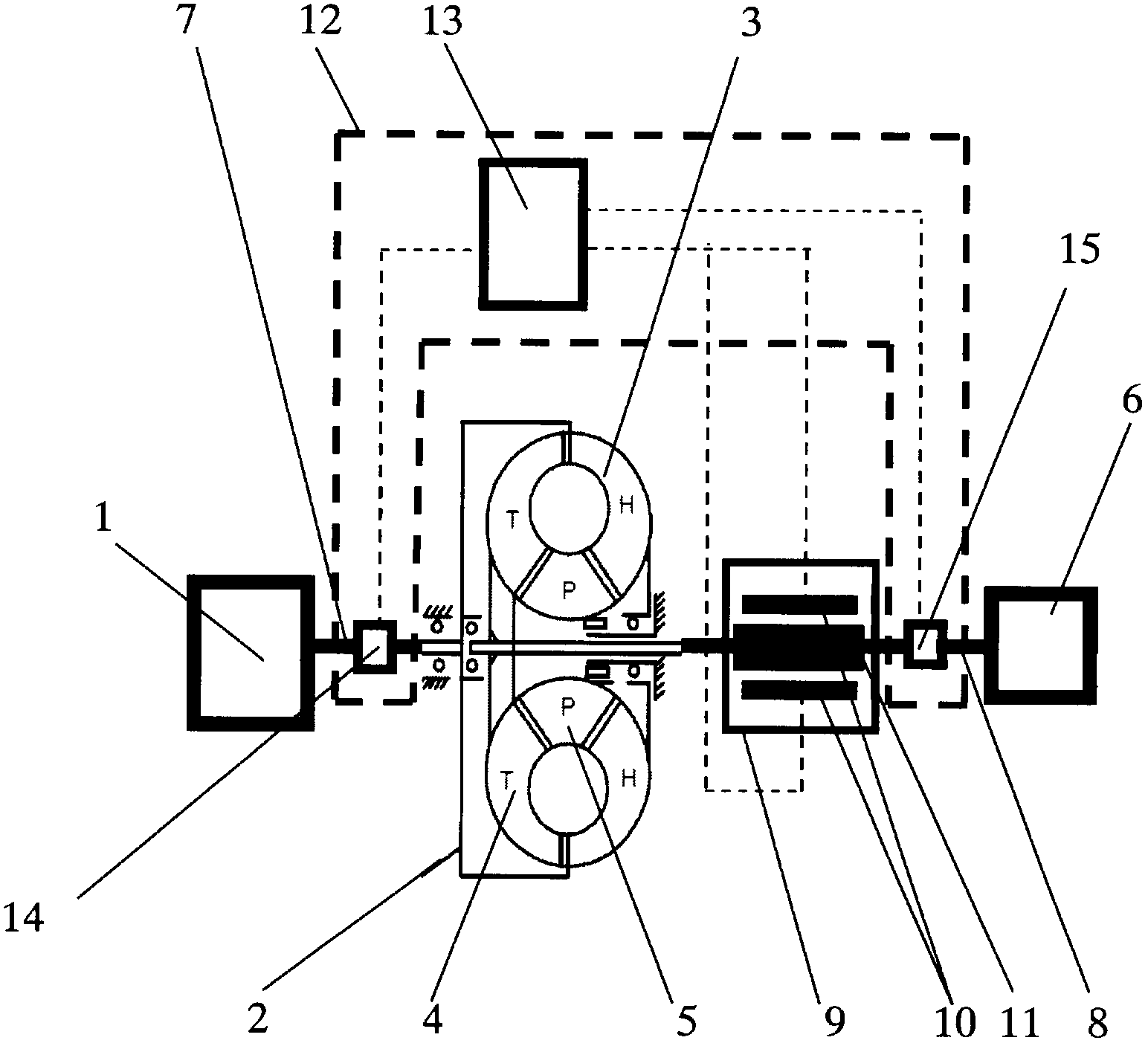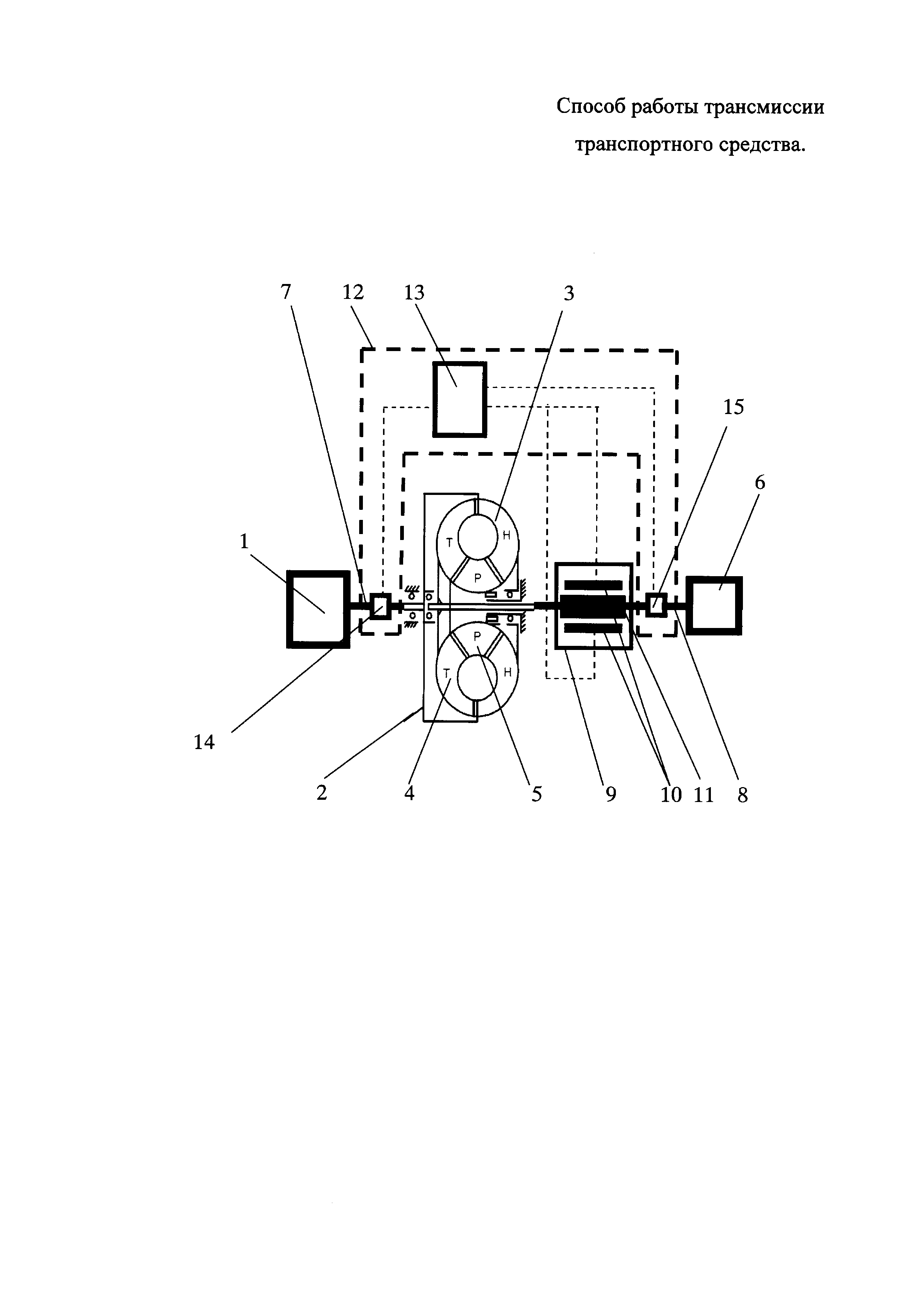 Изобретение относится к области машиностроения, преимущественно к способам работы трансмиссий транспортных средств. Известна гидродинамическая передача транспортных средств, включающая гидротрансформатор, содержащий насосное и турбинное колеса и реактор. В устройстве реализуется способ работы трансмиссии транспортного средства, заключающийся в том, что при вращении ведущего вала крутящий момент от привода передают посредством гидротрансформатора, заполненного рабочей жидкостью, на ведомый вал, причем в гидротрансформаторе, состоящем из насосного и турбинного колес и реактора (статора), предусматривают установку сменных лопаток, а каждое из рабочих колес выполняют составными, средние части которых сопрягают со сменными лопатками. При этом изменяя поворот сменных лопаток или заменяя их другими, изменяют мощность, передаваемую от двигателя и воспринимаемую гидротрансформатором, что позволяет исследовать влияние большого числа геометрических параметров лопастной системы (см. а.с. СССР №241187, МПК F16H 41/00, публ. 1969 г.). Недостаток способа состоит в том, что гидротрансформатор является экспериментальным и применим в узкой области, а именно для исследования влияния геометрических параметров на передаточные свойства гидротрансформатора. Кроме того, известна гидродинамическая передача транспортного средства, включающая регулируемый гидротрансформатор, содержащий насосное и турбинное колеса, а также реактор. Устройство реализует способ работы трансмиссии транспортного средства, выбранный в качестве прототипа и заключающийся в том, что при вращении ведущего вала крутящий момент от привода плавно передают с помощью гидротрансформатора на ведомый вал и к коробке переключения передач. Причем в гидротрансформаторе, состоящем из насосного и турбинного колес и реактора, последний выполняют с неподвижными лопаточными венцами. При этом регулирование параметров рабочей жидкости осуществляют, изменяя положение подвижного венца реактора (см. а.с. СССР №369317, МПК F16H 41/08, публ. 1973 г.). Известный способ позволяет повысить энергоемкость - момент на ведущем валу и мощность гидротрансформатора, однако имеет следующие недостатки: малый диапазон регулирования, значительные механические потери в связи с наличием в конструкции трущихся поверхностей, что в итоге приводит к снижению ресурса работы. Технической задачей настоящего изобретения является снижение механических потерь гидродинамической передачи и повышение мощности трансмиссии в целом. Решение поставленной технической задачи достигается тем, что в способе работы трансмиссии транспортного средства, заключающемся в том, что при работе двигателя крутящий момент от ведущего вала посредством гидротрансформатора, корпус которого заполнен рабочей жидкостью, передают на ведомый вал и коробку переключения передач, осуществляя при этом регулирование угловых скоростей до момента их последующего плавного выравнивания на ведущем и ведомом валах, согласно изобретению трансмиссию дополнительно снабжают устанавливаемым на ведомом валу вентильно-индукторным электроприводом, имеющим статор и ротор, в процессе работы автоматически контролируют угловые скорости ведущего и ведомого валов, в соответствии с которыми управляют вращающимся электромагнитным полем, возникающим