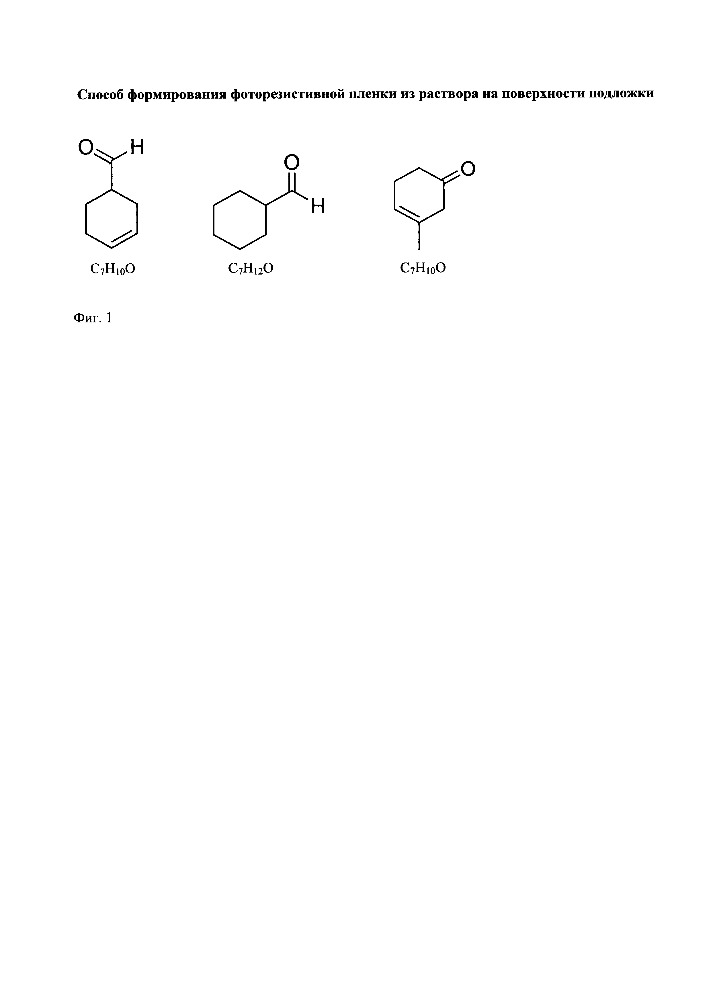 Способ формирования фоторезистивной пленки из раствора на поверхности подложки, включающий нанесение фоторезистивного материала из раствора аэрозольным итерационным распылением в потоке газа на подложку в виде отдельных микрокапель, не образующих сплошного слоя в отдельной итерации, при этом подложка может содержать элементы с перепадом высоты, превышающим толщину формируемой фоторезистивной пленки, отличающийся тем, что одновременно с формированием пленки фоторезиста происходит испарение растворителя из объема микрокапель, реализуемое за счет сочетания нагрева и формирования над поверхностью пленки потока газа, величина расхода которого находится в диапазоне от 3 до 4 порядков по отношению к величине расхода раствора, причем к исходному раствору фоторезиста добавляют растворитель, который имеет температуру кипения в диапазоне от 160°С до 175°С и представляет собой один из растворителей или их смесь - 3-циклогексен-1-карбоксальдегид, гексагидробензальдегид, 3-метил-3-циклогексен-1-он, в объемном отношении от 6:1 до 8:1 к основным компонентам материала формируемой фоторезистивной пленки.