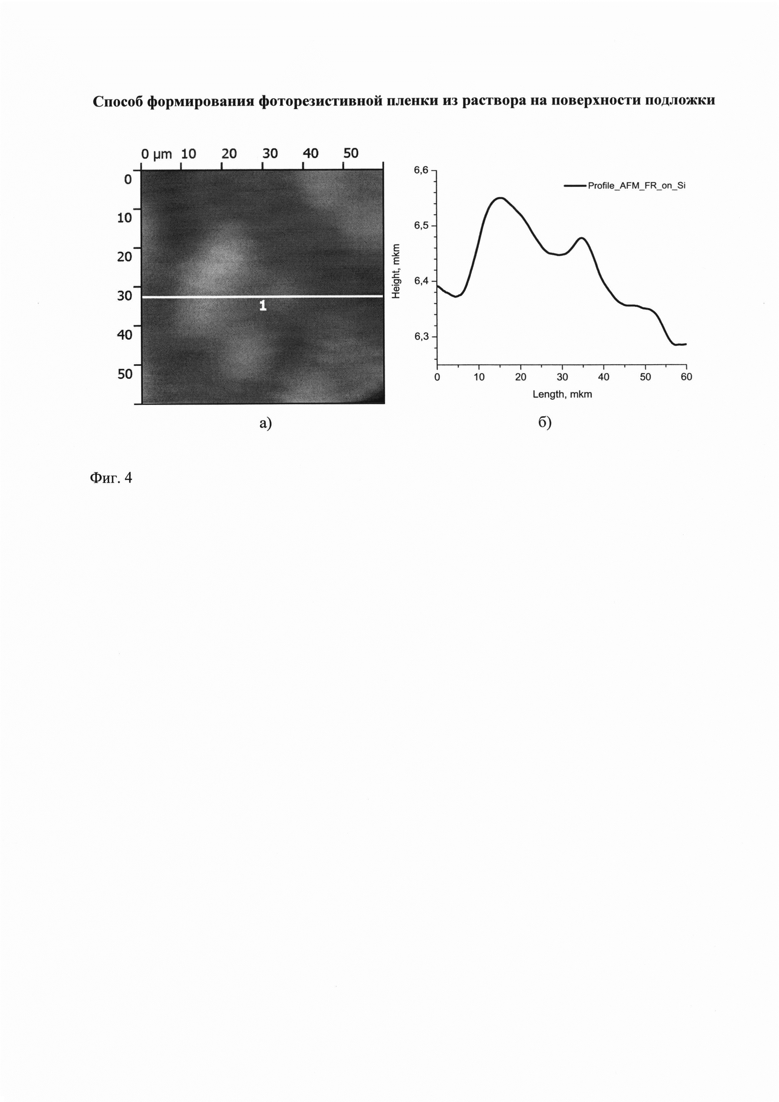Изобретение относится к технологии микроэлектроники и может быть использовано для изготовления интегральных микросхем, МЭМС-структур, СВЧ-структур, путем воспроизводимого формирования пленки фоторезиста (ФР) на поверхности подложки, в том числе, со сложным рельефом, где перепад высот существенно больше толщины формируемой пленки ФР, методом аэрозольного итерационного распыления в потоке газа раствора ФР и проведения последующей операции фотолитографии на сформированной пленке. В настоящее время используется несколько методов для нанесения фоторезистивных пленок из растворов, среди которых наиболее распространены такие методы как центрифугирование (спин-коатинг) и аэрозольное распыление (спрей-коатинг) [1]. Однако технология нанесения в обоих случаях сводится к нанесению материала с большим расходом. На практике, аэрозольное распыление подразумевает нанесение фоторезистивного материала при расходе раствора 1,5-10 мл/мин [2, 3], что не позволяет обеспечить получение равномерной по толщине пленки ФР на структурах со сложным рельефом, особенно содержащих канавки травления с вертикальными стенками. Наносимые аэрозольным способом составы растворов ФР (например, ФР марки AZ™ 4999 производства MicroChemicals) содержат всего лишь 4% основных компонент ФР в растворе при вязкости 0,52 сСт. При этом использование для аэрозольного распыления растворов ФР применяемых при центрифугировании (марки ФР Microposit™ серий S1800™ и SPR™ производства компании Dow, серий AZ™ 1500 и других, производства MicroChemicals), которые существенно дешевле растворов ФР для аэрозольного распыления, приводит к неоднородности нанесения пленки ФР, что связано с большей вязкостью раствора, а также с большим содержанием основных компонентов ФР 39.5% (в описании характеристик ФР AZTM 4999 производства MicroChemicals, http://www.microchemicals.com/micro/az_4999.pdf - разница толщины на краю и на горизонтальной поверхности 4,2 мкм против 10 мкм). Нанесение пленки ФР толщиной свыше 10 мкм также может приводить к изменению геометрических размеров подложки при задубливании фоторезистивного слоя и изменению температурного коэффициента расширения подложки и сформированной пленки ФР. Следует учитывать тот факт, что формирование пленки ФР за одну итерацию нанесения приводит к перераспределению основных компонент материала ФР и формирует неоднородность по толщине пленки на краях рельефа, что также может способствовать отсутствию воспроизводимого покрытия узких канавок ФР и стенок ямок травления. Все это существенно затрудняет выполнение целого ряда технологических процессов микроэлектроники или делает невозможным формировании МЭМС-структур, где перепад высот на поверхности подложки может достигать более 400 мкм при необходимых толщинах ФР порядка 2-10 мкм. Таким образом, общей проблемой формирования пленки ФР для процесса фотолитографии является отсутствие воспроизводимой технологии формирования однородных по толщине тонких (до 0,5-1,5 мкм и менее) пленок ФР на поверхностях со сложным рельефом. При этом наиболее приемлемым процессом формирования таких слоев является аэрозольное нанесение раствора ФР, требующее формирования особых составов растворов ФР для оптимального процесса нанесения, существенно отличных от композиций, используемых для нанесения слоев ФР способом центрифугирования подложки. Для ФР наноси