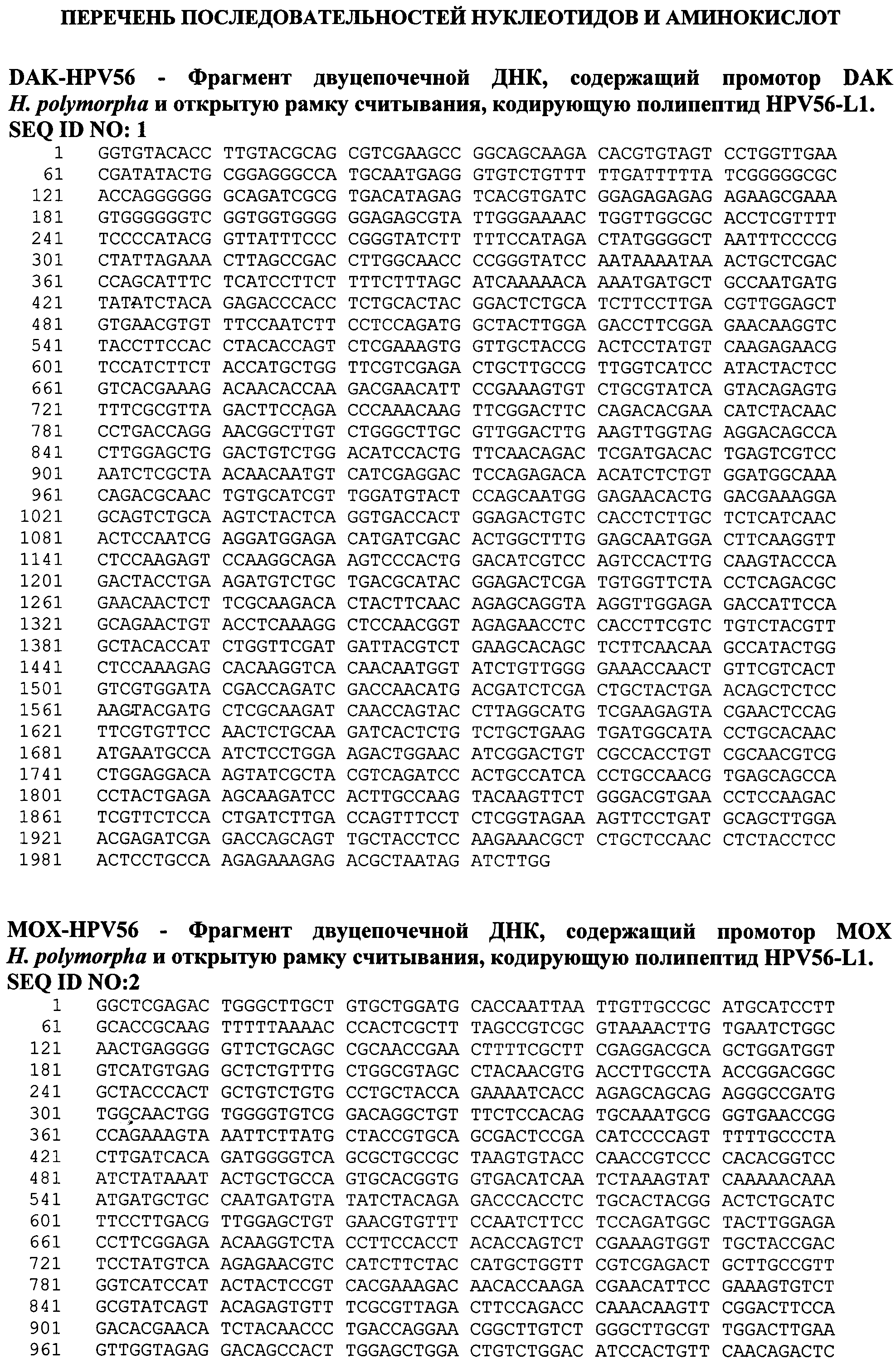 Рекомбинантный штамм дрожжей Hansenula polymorpha КБТ1l/pPV-562, содержащий интегрированный в геном фрагмент ДНК с рекомбинантным геном, кодирующим полипептид L1 HPV типа 56, под контролем промотора гена DAK Н. polymorpha (SEQ ID NO:1) и фрагмент ДНК с рекомбинантным геном, кодирующим полипептид L1 HPV типа 56, под контролем промотора гена МОХ Н. polymorpha (SEQ ID NO:2) - продуцент рекомбинантного капсидного белка L1 вируса папилломы человека (HPV) типа 56.