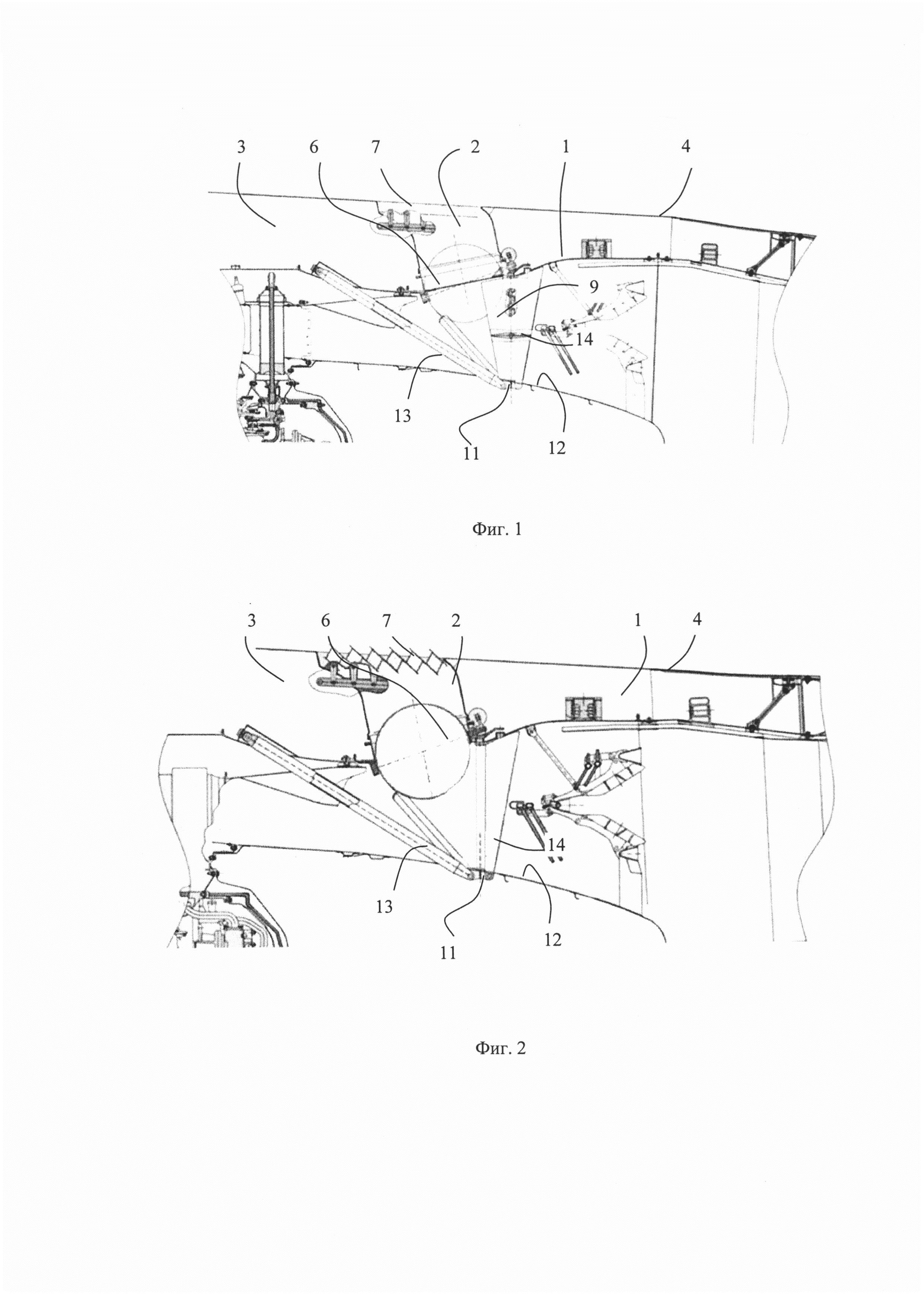 Предлагаемое изобретение относится к авиационной технике, а именно к реверсивным устройствам турбореактивных двигателей (далее ТРД). Известно реверсивное устройство ТРД, содержащее устройство для перекрытия газового потока в корпусе ТРД, выполненное в виде реверсивных створок (RU 2232282). Известная конструкция выбрана в качестве прототипа. Недостатком прототипа является невозможность независимого управления элементами реверсивного устройства, а именно неполное открытие и закрытие створок, перекрывающих поток, без воздействия на режимы работы ТРД. Техническим результатом, достигаемым при использовании заявленного изобретения является возможность независимого регулирования элементов реверсивного устройства, а именно устройства перекрытия газового потока и клапанов перепуска с поворотными решетками, с целью регулирования площади проходных сечений для оптимизации параметров работы ТРД. Указанный технический результат достигается тем, что реверсивное устройство ТРД, содержащее устройство для перекрытия газового потока в корпусе ТРД, согласно настоящему изобретению, для ТРД, размещенного в мотогондоле самолета, содержит выхлопные каналы, установленные перед упомянутым устройством, по направлению движения газового потока, по окружности в кольцевой полости, образованной между стенками корпуса мотогондолы и корпуса ТРД, сообщающие проточную часть ТРД с атмосферой, клапаны перепуска, установленные на входе в каждый из выхлопных каналов, поворотные решетки, установленные на выходе каждого из выхлопных каналов и образующие в закрытом положении с наружной поверхностью корпуса мотогондолы единую аэродинамическую поверхность, причем устройство для перекрытия газового потока в корпусе ТРД установлено за смесителем ТРД и выполнено в виде закрылков, установленных по окружности относительно продольной оси ТРД, соединенных с радиальными осями, установленными вдоль центральных участков закрылков, силового кольца, охватывающего кок ТРД, соединенного с корпусом ТРД посредством тяг, силовых стоек, установленных по направлению газового потока за радиальными осями и жестко соединенных с последними, причем противолежащие концы силовых стоек соединены с корпусом ТРД и силовым кольцом соответственно, при этом каждый из закрылков с установленной за ним по направлению газового потока силовой стойкой образуют единый аэродинамический профиль, кроме того закрылки выполнены с возможностью поворота в окружном направлении относительно радиальных осей. Такое конструктивное выполнение позволяет производить независимое управление и изменять проходные сечения ТРД, оптимизируя режим работы ТРД за счет возможности независимого регулирования элементами реверсивного устройства, а именно устройством перекрытия газового потока, клапанами перепуска и поворотными решетками. В частном случае реализации заявленного устройства в местах соединений тяг с корпусом и силовым кольцом установлены шарниры. Это необходимо для компенсации температурных деформаций в тягах и корпусе. В частном случае реализации заявленного устройства силовые стойки соединены с корпусом посредством разъемного соединения, например установлены в корпус посредством «пальцев», а с силовым кольцом - посредством шарнирного соединения. Соединение при пом