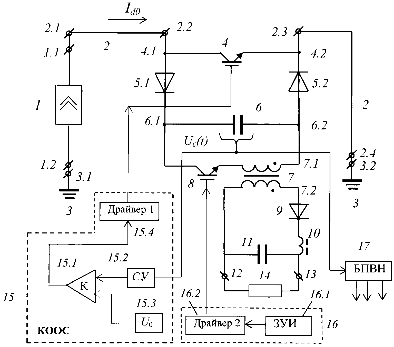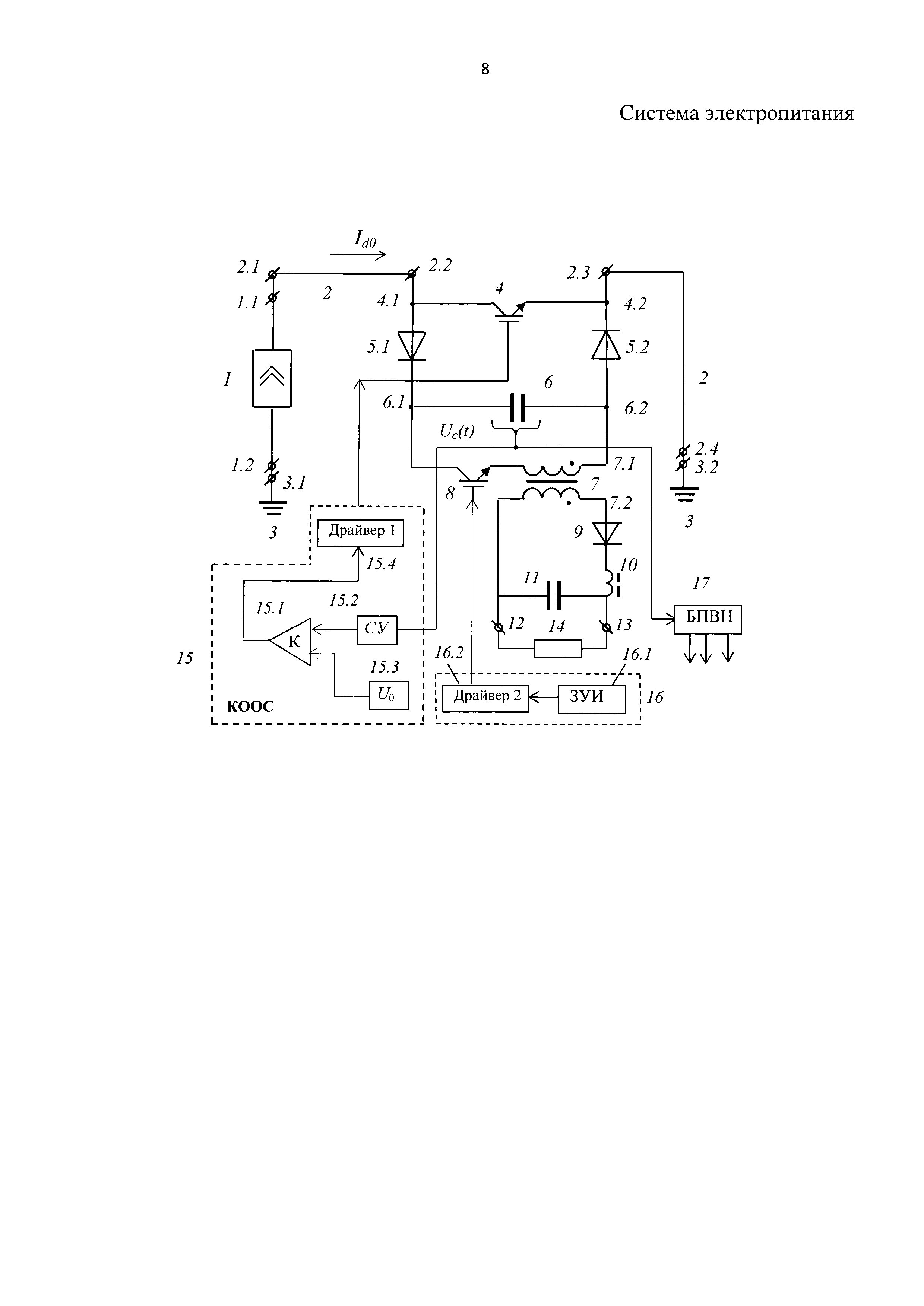 Изобретение относится к области силовой преобразовательной техники (силовой электроники) и может быть использовано при создании множества гальванически развязанных источников напряжения для группы N потребителей при электропитании их от протяженной линии со свойствами источника тока. Такой принцип построения системы электропитания группы распределенных однотипных потребителей используется, например, в светосигнальных системах аэродромных взлетно-посадочных полос. По своим функциональным свойствам такая система относятся к системам «Преобразователь напряжения переменного тока в стабилизированный по уровню переменный ток другого уровня» или более коротко - к системам «Преобразователь напряжения в ток». Наиболее близким по технической сущности является система электропитания, описанная в статье журнала «Вестник МЭИ», 2010, №5, с. 62 в. Она содержит преобразователь сетевого напряжения (промышленной частоты) в стабилизированный по уровню переменный ток в протяженной линии электропередачи (ЛЭП), от которой через N двухобмоточных трансформаторов тока, включенных в рассечку этой линии, питается группа однородного типа N число потребителей (ламп) неизменной мощности. Такая система электропитания используется при относительно коротких протяженностях линии электропередачи порядка 1 км. Использование такого способа построения ЛЭП при большой ее протяженности (в десятки и сотни километров), например, в системах мониторинга морей, океанов и при использовании в ней нерационально по двум причинам: во-первых, из-за больших значений индуктивности токопроводящей жилы кабеля, приводящих к неоправданно большим затратам ее меди; во-вторых, при питании от такой системы не возможна работа потребителей с изменяющейся в процессе работы мощностью (из-за изменения на ней напряжения). Объясняется это тем, что подавляющее число потребителей проектируется не на стабилизированный ток (и изменяющееся при изменениях тока напряжение), а на стабильное номинальное напряжение при изменяющемся токе. Недостаток заключается в чрезмерно завышенной массе токопроводящего кабеля при протяженной ЛЭП, а также в том, что она не позволяет получить стабилизированное напряжение у потребителя при изменяющемся в нем токе. Техническая задача изобретения направлена на создание стабилизированного напряжения у потребителя при изменяющемся в нем токе за счет перехода со стабилизированного в ЛЭП переменного тока на стабилизированный постоянный ток и последующего его преобразования в стабилизированное напряжение. Техническим результатом изобретения является повышение точности стабилизации напряжения на выходных выводах преобразователя системы питания. Это достигается тем, что известная система электропитания, содержащая, источник электропитания со стабилизированным в линии электропередачи током и N преобразователей, каждый из которых своими силовыми входными выводами последовательно включен в эту линию электропередачи, а также двухобмоточный трансформатор с вторичной обмоткой, связанной с одним из N потребителей, в ней источник электропитания выполнен с выходом постоянного тока, кроме того, каждый из N преобразователей снабжен полностью управляемым ключом, который своими силовыми выводами образует входные силовые выводы преобразователя,