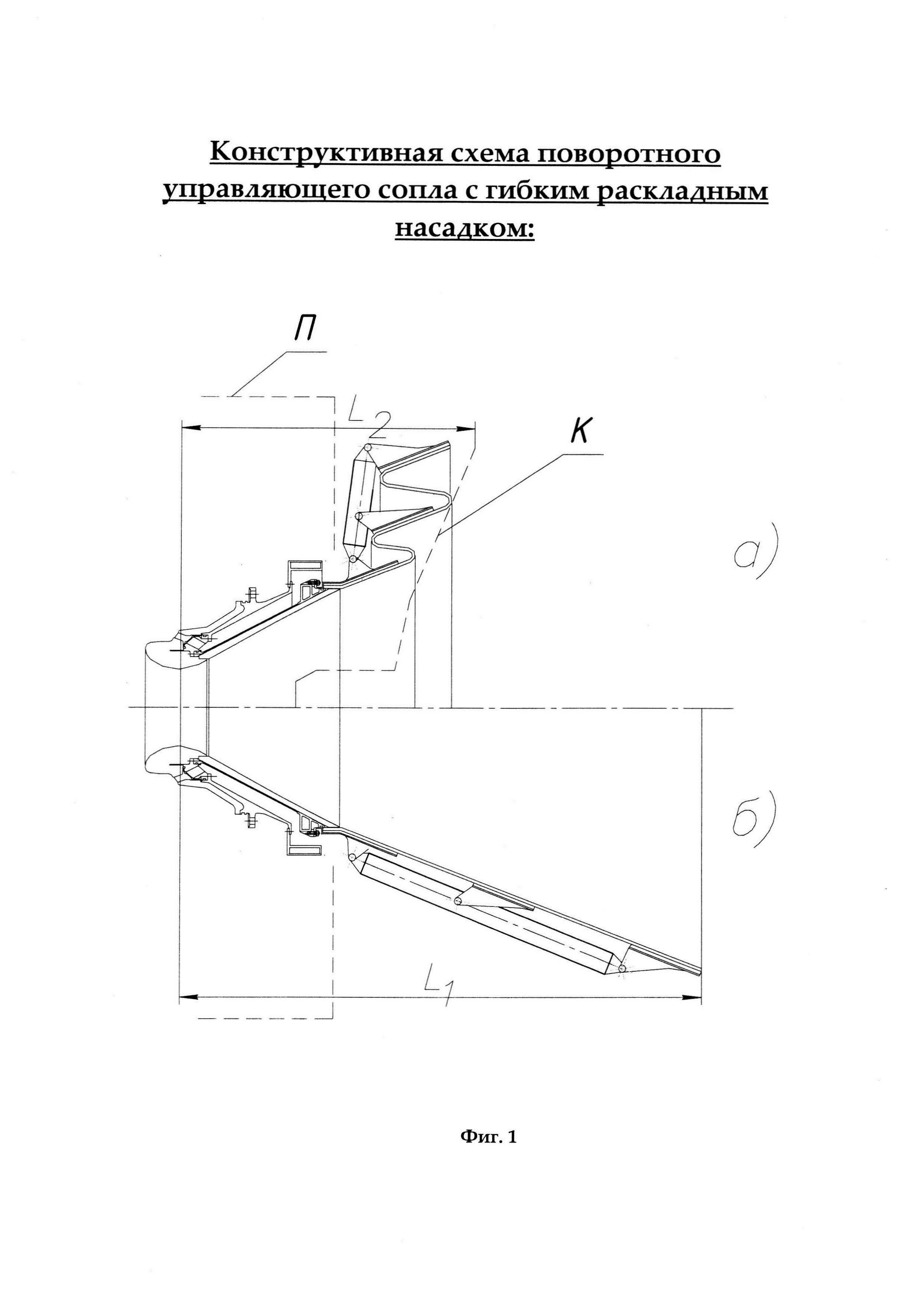 1. Поворотное управляющее сопло ракетного двигателя, состоящее из соединенных узлом качания неподвижной и подвижной частей, с расположенным на срезе раструба подвижной части раскладным сопловым насадком и механизмом его разложения, выполненным в виде нескольких равномерно расположенных вокруг сопла раздвижных телескопических штанг, отличающееся тем, что сопловой насадок образован раструбом из гибкого композиционного материала и опорными кольцами, установленными с интервалами вдоль оси сопла и соединенными с помощью шарниров с механизмом разложения насадка, при этом ближайшее к срезу раструба подвижной части сопла опорное кольцо закреплено в зоне максимального сечения раструба подвижной части сопла таким образом, что оно образует продолжение подвижной части, при этом опорные кольца в сложенном состоянии размещены так, что своими максимальными сечениями образуют зону, подобную по форме переднему днищу предыдущей ступени. 2. Поворотное управляющее сопло ракетного двигателя по п. 1, отличающееся тем, что раструб из гибкого композиционного материала представляет собой оболочку из резиновой смеси, покрытую по внутренней поверхности теплостойким материалом ворсовой структуры на основе углеродных или кремнеземных волокон.