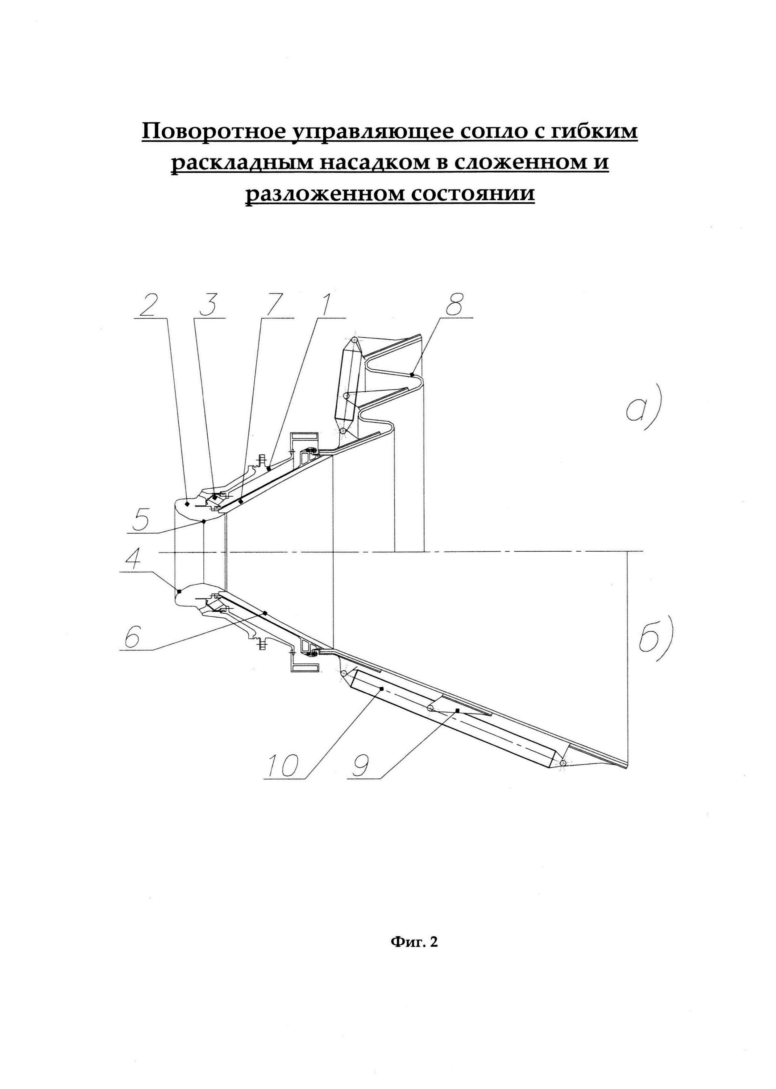 Изобретение относится к ракетной технике и может быть использовано при разработке поворотных управляющих сопел изменяемой геометрии для ракетных двигателей. Поворотное управляющее сопло ракетного двигателя состоит из соединенных узлом качания неподвижной и подвижной частей, с расположенным на срезе раструба подвижной части раскладным сопловым насадком и механизмом его разложения, выполненным в виде нескольких равномерно расположенных вокруг сопла раздвижных телескопических штанг. Сопловой насадок образован раструбом из гибкого композиционного материала и опорными кольцами, установленными с интервалами вдоль оси сопла и соединенными с помощью шарниров с механизмом разложения насадка. Ближайшее к срезу раструба подвижной части сопла опорное кольцо закреплено в зоне максимального сечения раструба подвижной части сопла таким образом, что оно образует продолжение подвижной части. Опорные кольца в сложенном состоянии размещены так, что своими максимальными сечениями образуют зону, подобную по форме переднему днищу предыдущей ступени. Изобретение позволяет повысить баллистическую эффективность ракеты за счет уменьшения общей длины ракеты при наличии габаритных ограничений, сокращения длины и массы межступенных отсеков или за счет увеличения длины и массы топливного заряда ракетного двигателя при сохранении общей длины ракеты. 1 з.п. ф-лы, 2 ил.