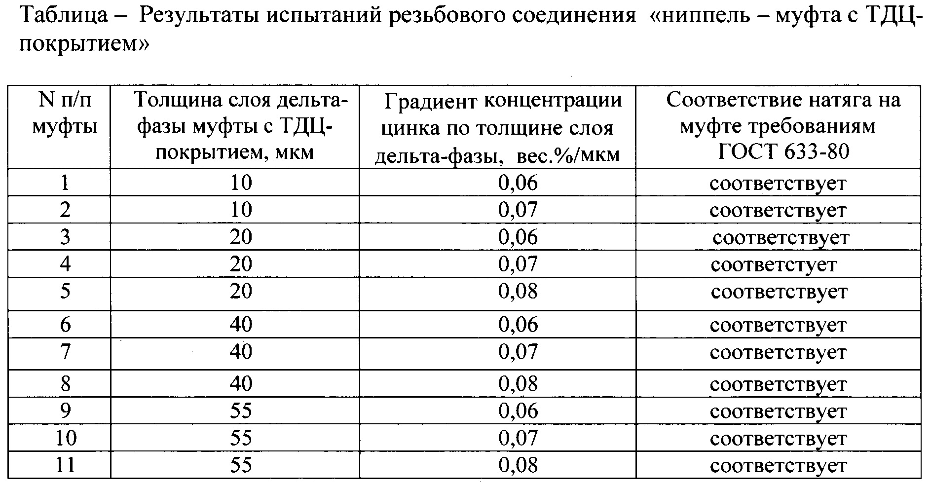 Резьбовое соединение «ниппель-муфта», в котором резьбовая поверхность муфты выполнена с термодиффузионным цинковым покрытием, включающим железоцинковый слой дельта-фазы, отличающееся тем, что железоцинковый слой дельта-фазы имеет толщину 10÷55 мкм, при этом градиент концентрации цинка по толщине слоя дельта-фазы составляет 0,06÷0,08 вес.%/мкм.