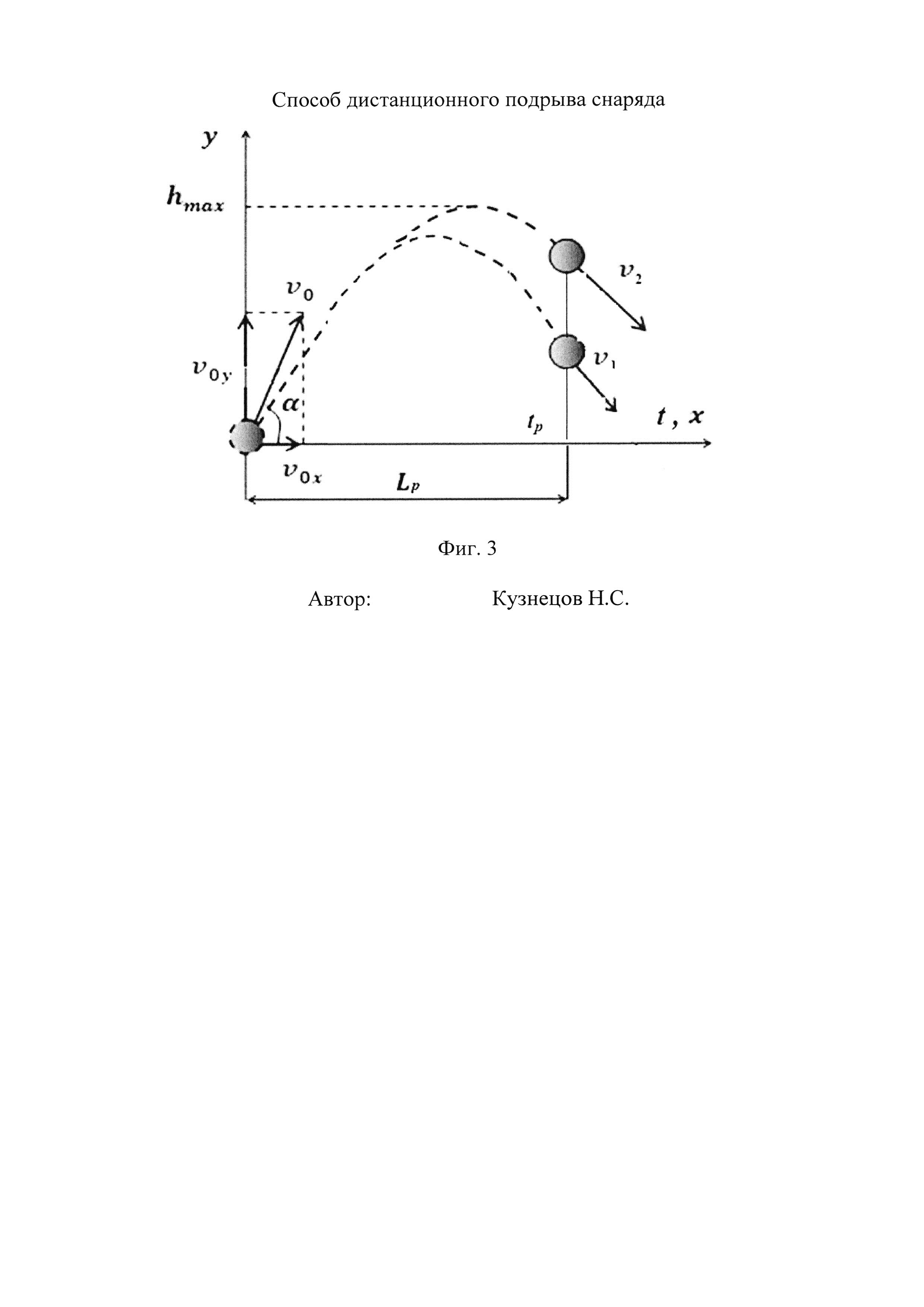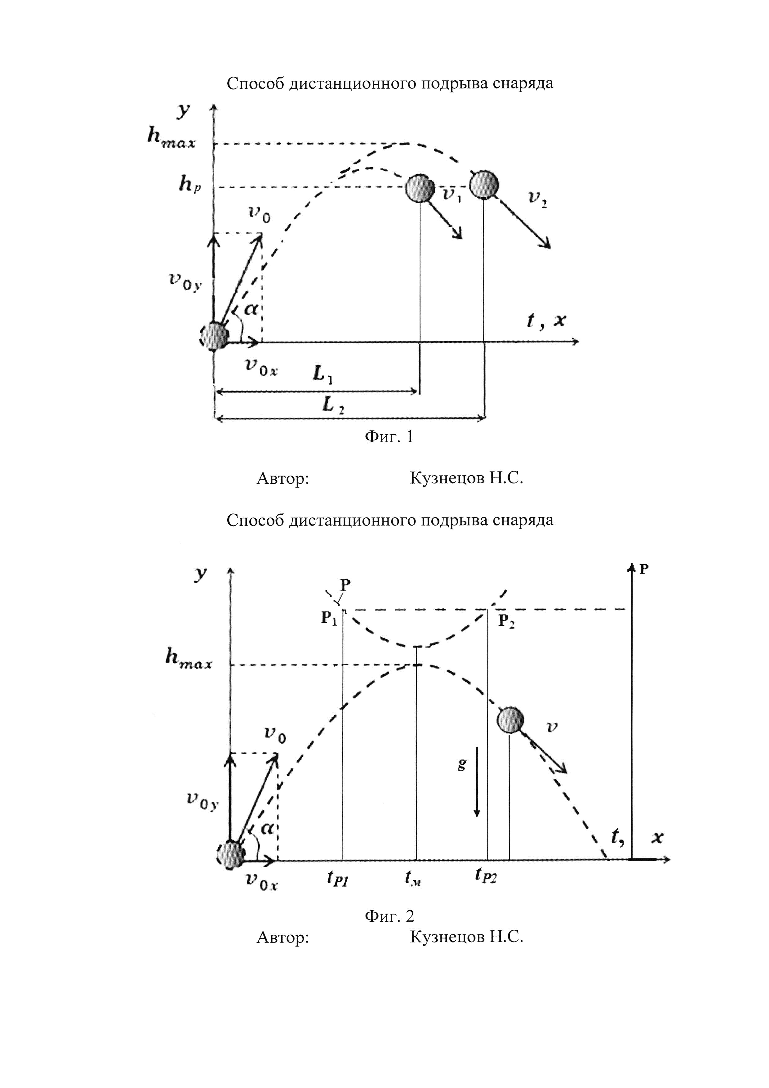 1. Способ дистанционного подрыва снаряда, заключающийся в том, что вычисляют расстояние до точки подрыва от места выстрела, вводят эти данные в вычислительное устройство взрывателя, снабженное временным таймером, и по команде от этого вычислительного устройства подают импульс управления на исполнительное устройство снаряда, отличающийся тем, что данные для определения точки подрыва вычисляют в процессе полета снаряда с помощью вычислительного устройства взрывателя, в вычислительное устройство взрывателя снаряда перед выстрелом вводят значение угла возвышения орудия над линией горизонта α и расстояние до точки подрыва снаряда Lp, производят выстрел снарядом, непрерывно, в функции времени, регистрируют электрические сигналы, пропорциональные давлению атмосферы в зоне снаряда, датчиком давления, установленным во взрыватель снаряда, информацию с датчика давления вводят в вычислительное устройство взрывателя, выбирают два значения времени tP1 и tP2 (tP1<<tP2), при которых значения зарегистрированных давлений совпадают, с помощью соотношения V0=g(tP1+tP2)/2 sinα, где g - ускорение свободного падения, вычисляют начальную скорость снаряда V0, с помощью соотношения tp=Lp/V0 cosα вычисляют время подрыва снаряда tp, через время t=tp сначала полета снаряда формируют импульс управления, который подают на исполнительное устройство взрывателя. 2. Способ по п. 1, отличающийся тем, что непрерывно, в функции времени, определяют положение носовой части снаряда по отношению к линии горизонта и дну снаряда датчиком положения, установленным во взрыватель, и время tP2 выбирают после срабатывания датчика положения.