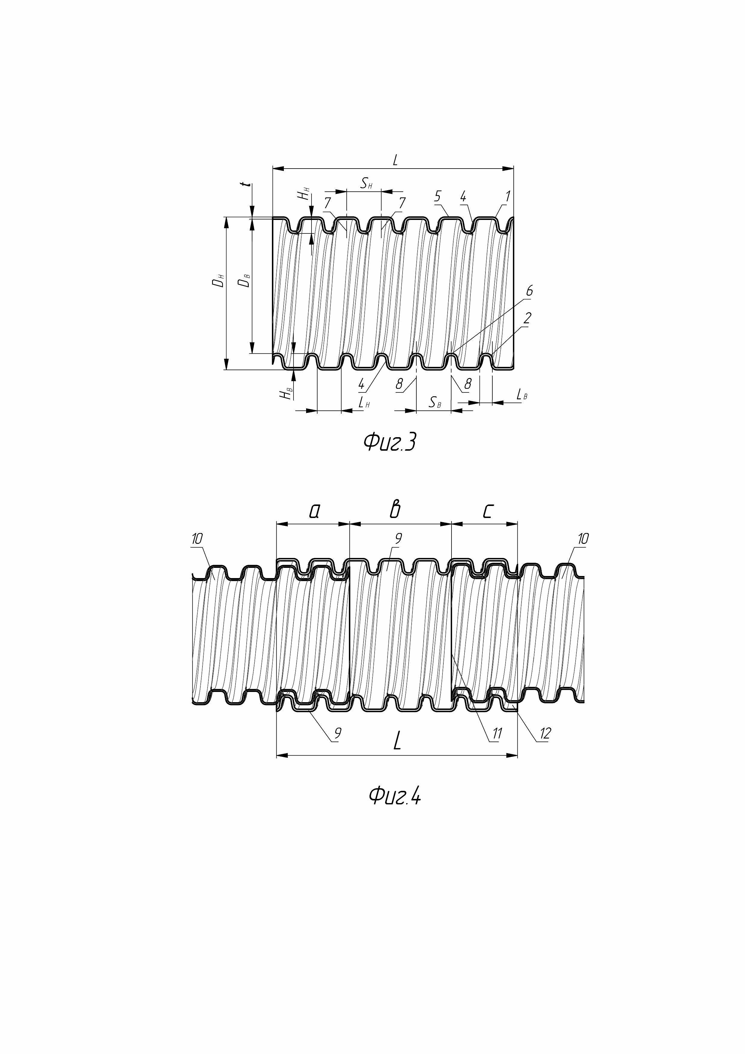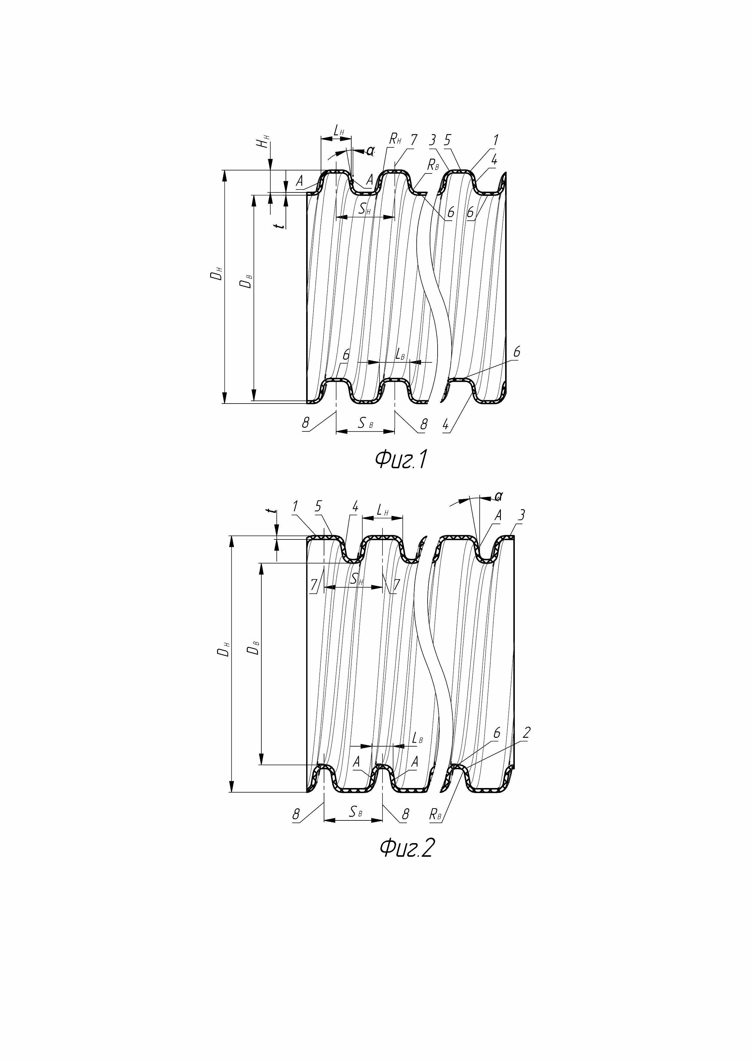 1. Гофрированная труба для кабелепровода, выполненная из полиэтилена, содержащая несущий нагрузку гибкий протяженный по спирали круглый каркас, образованный простирающимися наружу от продольной оси трубы наружными трапециевидными гребнями и простирающимися к продольной оси трубы внутренними трапециевидными гребнями, наружные и внутренние гребни имеют идентичную форму, каждая боковая грань гребня наклонена к оси симметрии гребня, каждая торцовая грань гребня параллельна продольной оси трубы, форма каждого гребня выполнена симметричной по отношению к оси его симметрии, в местах пересечения граней каждого гребня выполнены закругления, отличающаяся тем, что шаг Sн наружного гребня выполнен в пределах Sн=12,3-39,0 мм и равен шагу Sв внутреннего гребня, ширина Lн наружного гребня – в пределах Lн = 5,8-18,5 мм и равна ширине Lв внутреннего гребня, толщина t стенки трубы – в пределах t = 0,9-2,5 мм, угол α наклона каждой боковой грани гребня – в пределах α = 9-11°, а наружный диаметр Dн выполнен в пределах Dн = (1,24-1,36) Dв, где Dв – внутренний диаметр трубы. 2. Гофрированная труба по п.1, отличающаяся тем, что в местах пересечения каждой боковой грани каждого наружного гребня с наружной торцовой гранью гребня выполнен закругленный угол по радиусу Rн в пределах Rн=4,0-6,0мм, а в местах пересечения каждой боковой грани каждого гребня с торцовой внутренней гранью гребня каждый внутренний гребень имеет внутренний закругленный угол по радиусу Rв в пределах Rв = 2,5-4,5 мм. 3. Гофрированная труба для кабелепровода, выполненная из полиэтилена, содержащая несущий нагрузку гибкий протяженный по спирали круглый каркас, образованный простирающимися наружу от продольной оси трубы наружными трапециевидными гребнями и простирающимися к продольной оси трубы внутренними трапециевидными гребнями, наружные и внутренние гребни имеют идентичную форму, каждая боковая грань гребня наклонена к оси симметрии гребня, каждая торцовая грань гребня параллельна продольной оси трубы, форма каждого гребня выполнена симметричной по отношению к его симметрии, при этом в местах пересечения граней каждого гребня выполнены закругления, отличающаяся тем, что шаг Sн наружного гребня выполнен в пределах Sн=12,3-39,0 мм и равен шагу Sв внутреннего гребня, ширина Lн наружного гребня – в пределах Lн = 7,6-23,9 мм, ширина Lв внутреннего гребня в пределах Lв=2,6-13,2, толщина t стенки трубы – в пределах t = 0,9-2,5 мм, угол α наклона каждой боковой грани гребня – в пределах α = 9-11°, наружный диаметр Dн выполнен в пределах Dн = (1,21-1,24) Dв, где Dв – внутренний диаметр трубы. 4. Гофрированная труба по п.3, отличающаяся тем, что в местах пересечения каждой боковой грани каждого наружного гребня с наружной торцовой гранью гребня выполнен закругленный угол по радиусу Rн в пределах Rн=4,0-6,0 мм, а в местах пересечения каждой боковой грани каждого гребня с торцовой внутренней гранью гребня каждый внутренний гребень имеет внутренний закругленный угол по радиусу Rв – в пределах Rв = 2,5-4,5 мм. 5. Муфта для соединения гофрированных труб, выполненная из полиэтилена, содержащая несущий нагрузку гибкий протяженный по спирали круглый каркас, образованный простирающимися наружу от продольной оси трубы наружными трапециевидными гребнями и простирающимися к продольной оси трубы внутренними трапециевидными гребнями, наружные и внутренние гре