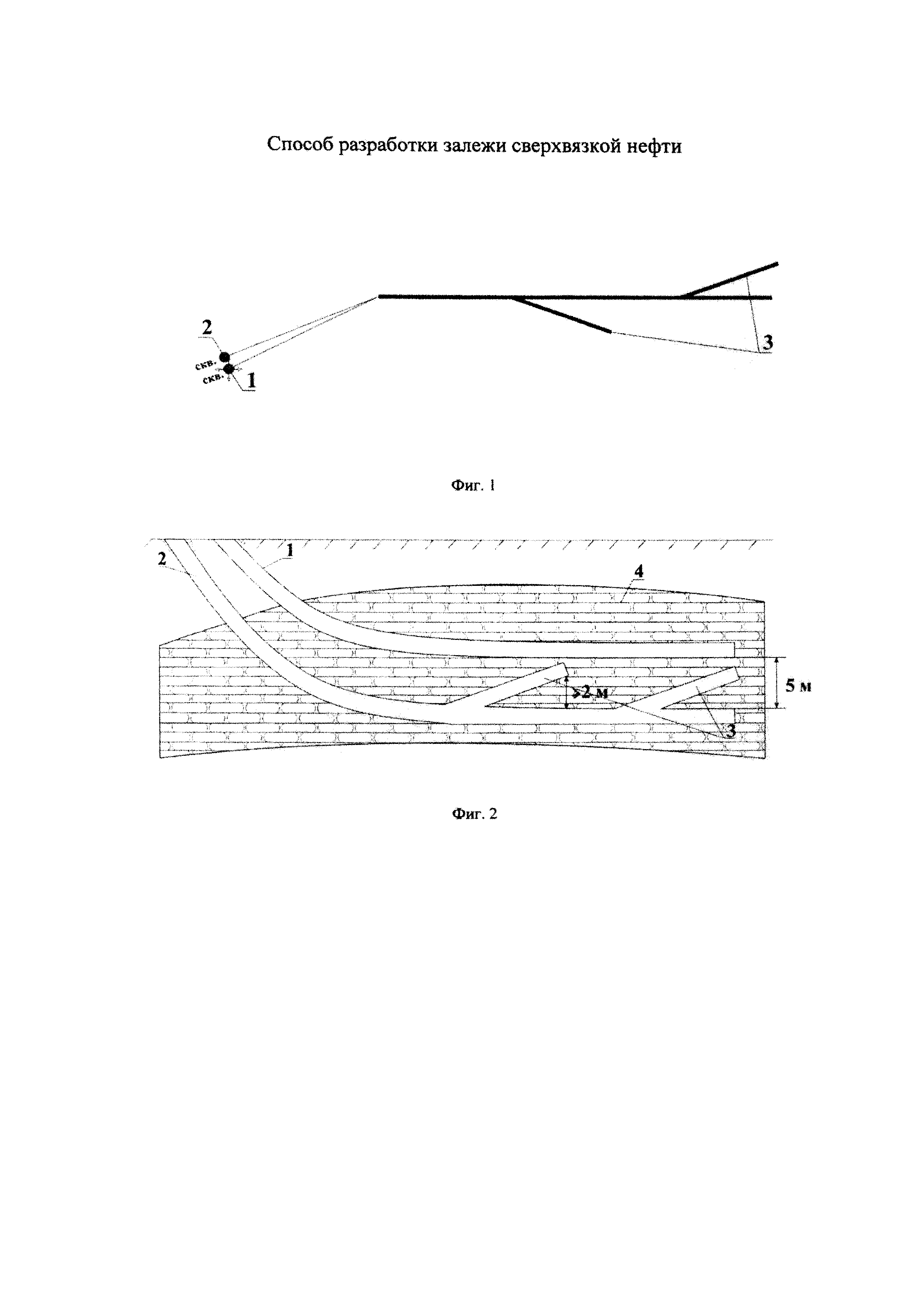 Способ разработки залежи сверхвязкой нефти, включающий строительство в пласте выше водонефтяного контакта или подошвы пласта горизонтальной добывающей скважины, выше которой строят нагнетательную скважину, бурение дополнительных стволов из горизонтального участка скважины, причем расстояние между дополнительными стволами определяют с учетом технологических возможностей бурового оборудования для их проводки, оборудование горизонтального участка добывающей скважины фильтром, закачку теплоносителя в обе скважины до прогрева межскважинного пространства продуктивного пласта, закачку теплоносителя в нагнетательную скважину и отбор продукции из добывающей скважины, отличающийся тем, что проводят гидродинамические исследования, на базе которых дополнительные стволы бурятся восходящими последовательно разнонаправленными относительно нагнетательной скважины из добывающей скважины так, чтобы исключить прорыв пара из нагнетательной скважины, при этом забои дополнительных стволов располагают выше добывающей скважины как минимум на 2 м.