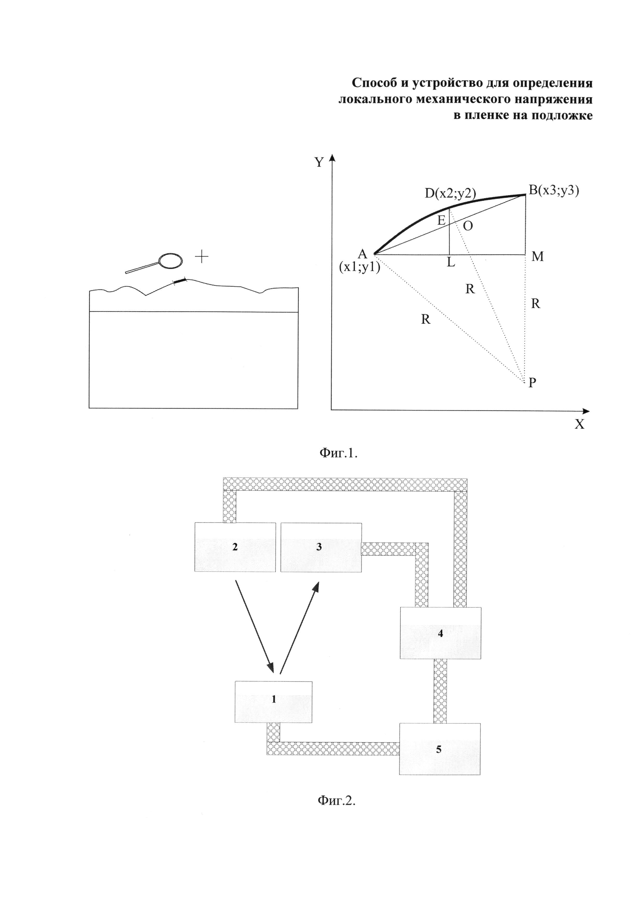 1. Способ определения локального механического напряжения в пленке на подложке, включающий формирование карты толщины подложки, определение кривизны поверхности подложки, формирование карты толщины пленки, расчет механических напряжений по формуле Стони, отличающийся тем, что определяют постоянные двухосного модуля упругости подложки и пленки с помощью избыточного давления, величину кривизны поверхности определяют посредством геометрического расположения точек рельефа. 2. Устройство для определения локального механического напряжения в пленке на подложке, включающий источник излучения, детектор излучения, компьютер, отличающийся тем, что введен компрессор для формирования избыточного давления, используемого для определения двухосного модуля упругости подложки, на основании которого определяют механические напряжения в пленке.