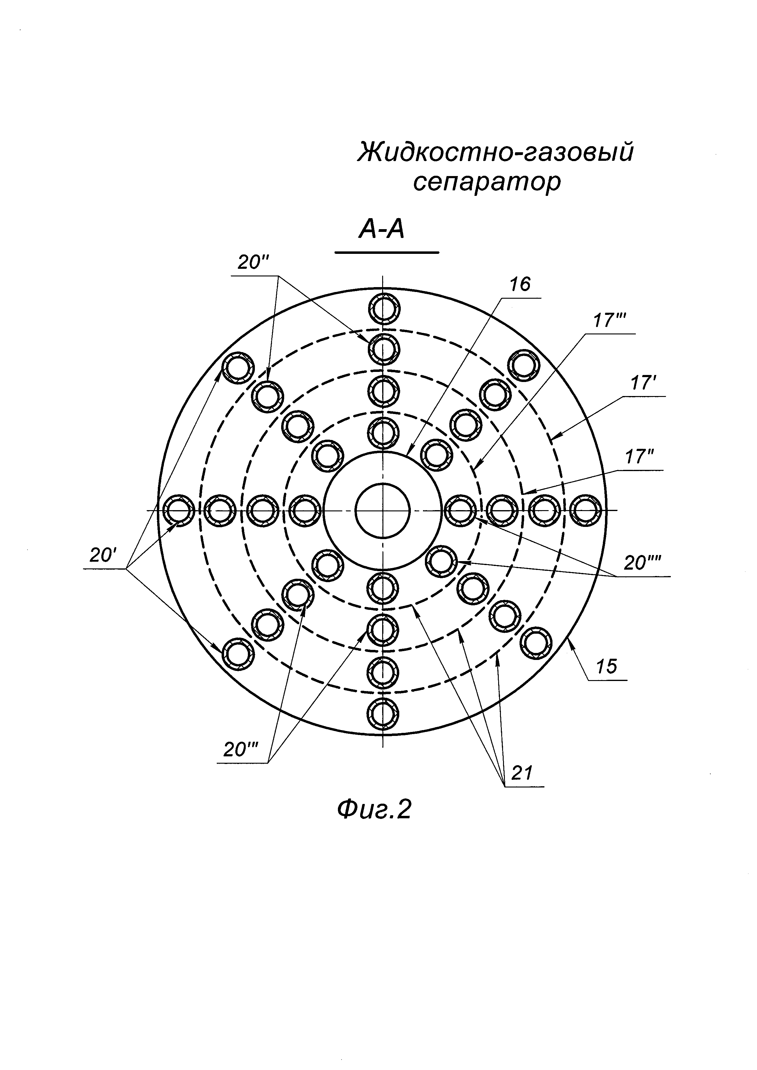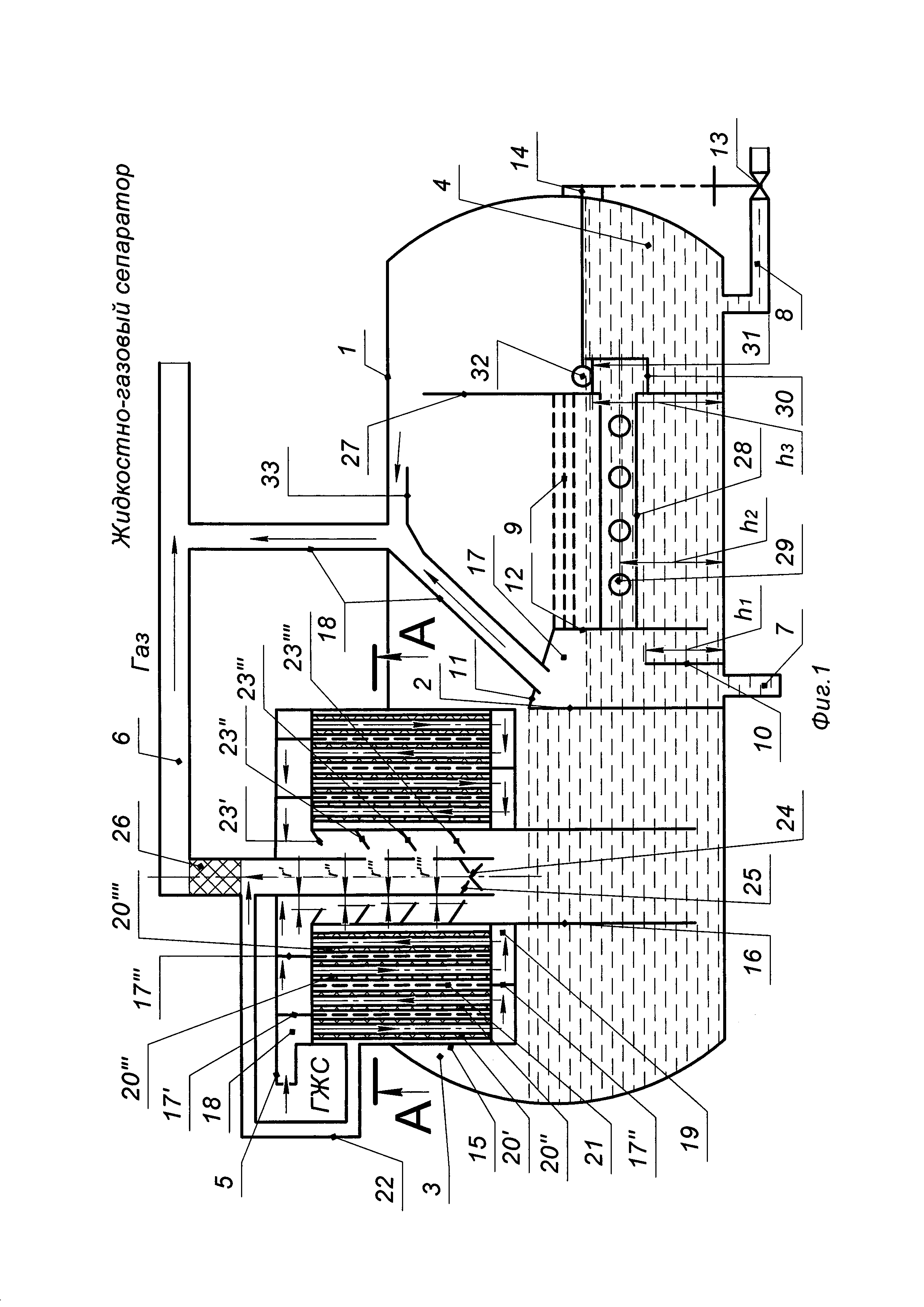 Жидкостно-газовый сепаратор, содержащий корпус, вертикальную разделительную перегородку, установленную в корпусе с разделением последнего на входную и выходную секции, сообщенные между собой в верхней части корпуса, трубопровод ввода газожидкостной смеси, сообщенный с входной секцией, а также патрубки вывода газообразной среды, более тяжелой и более легкой фракций жидкой среды, пакет фазоразделительных насадок в виде системы параллельно установленных перфорированных пластин, переливную перегородку, установленную в выходной секции, и сливной лоток, который расположен своим верхним краем с верхней кромкой вертикальной разделительной перегородки и своим нижним краем - с пакетом фазоразделительных насадок со стороны входа в него, закрепленных к поперечной перегородке, пропускающей более тяжелые фракции жидкой среды снизу, а газ - сверху, патрубок отвода более тяжелой фракции жидкой среды сообщен с нижней частью корпуса между вертикальной разделительной перегородкой и переливной перегородкой, а патрубок отвода более легкой фракции жидкой среды снабжен регулируемой задвижкой и введен в корпус ниже уровня жидкой среды, который контролируется датчиком, управляющим регулируемой задвижкой, трубопровод ввода газожидкостной смеси введен в вертикальный гидроциклон, герметично введенный в корпус и оснащенный концентрично установленной каплеотбойной камерой, внутреннее пространство которого выше уровня жидкости сообщено с патрубком вывода газообразной среды, который дополнительно сообщен трубкой с пространством под сливным лотком выше уровня жидкости, нижние кромки гидроциклона и каплеотбойной камеры расположены в непосредственной близости от нижней части корпуса, отличающийся тем, что во входной секции корпуса между гидроциклоном и каплеотбойной камерой концентрично установлены цилиндрические секторы, а в верхней и нижней частях цилиндрических секторов перпендикулярно выполнены входной и выходной коллекторы, при этом между гидроциклоном, цилиндрическими секторами и каплеотбойной камерой размещены ряды труб из пористого материала с гидрофобным покрытием на внутренней поверхности с возможностью последовательного перемещения газожидкостной смеси по всем рядам труб от входного коллектора к выходному коллектору, причем цилиндрические секторы между рядами труб из пористого материала с гидрофобным покрытием на внутренней поверхности выполнены из металлической сетки и газоотводным каналом сообщены с патрубком вывода газообразной среды, причем каплеотбойная камера внутри оснащена инерционным каплеуловителем в виде наклоненных вниз усеченных конусов, уменьшающих проходное сечение каплеотбойной камеры сверху вниз, при этом на входе патрубка вывода газообразной среды выполнен экран, состоящий из взаимообращенных навстречу друг другу снизу сужающегося снизу вверх конуса, а сверху усеченного конуса, расширяющегося снизу вверх, причем выше газоотводного канала патрубок вывода газообразной среды оснащен вертикальной металлической сеткой, при этом в выходной секции корпуса выполнена вторая вертикальная разделительная перегородка, а между поперечной перегородкой и второй вертикальной разделительной перегородкой установлен пакет фазоразделительных насадок, причем под пакетом фазоразделитель