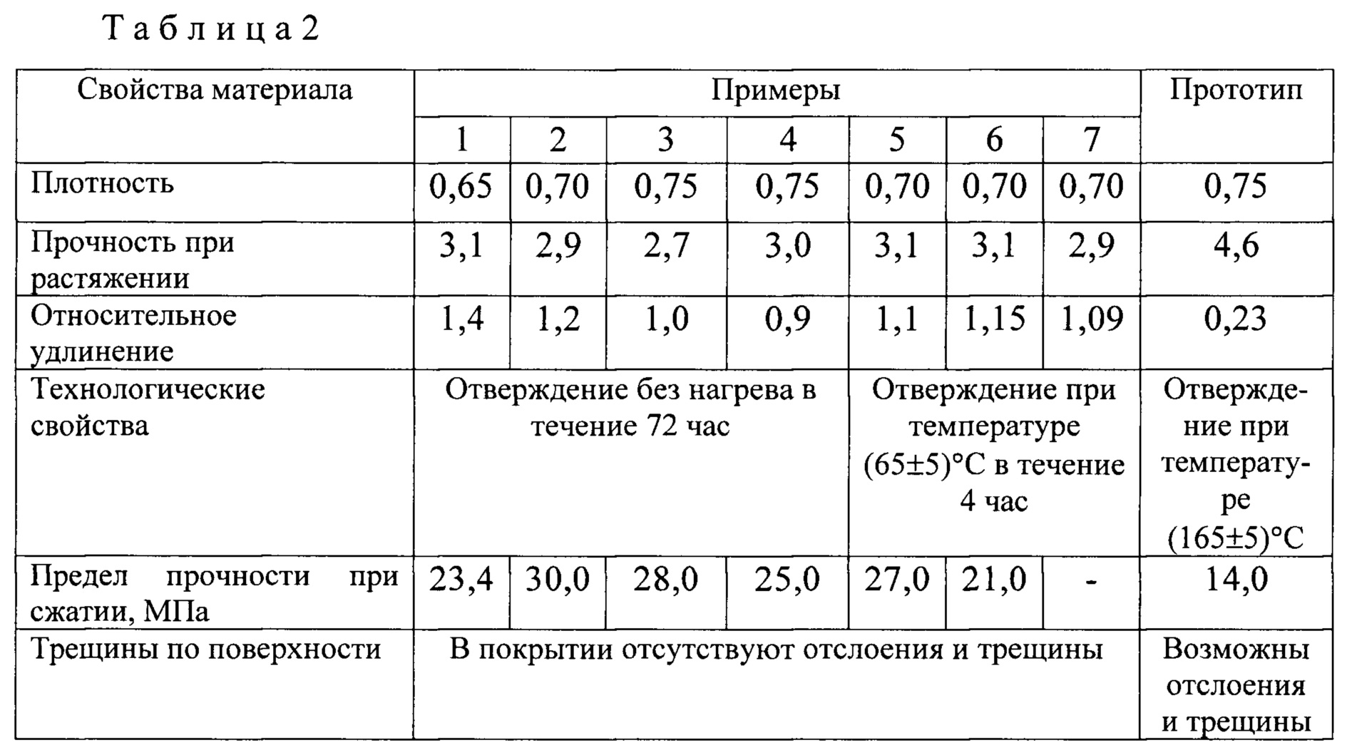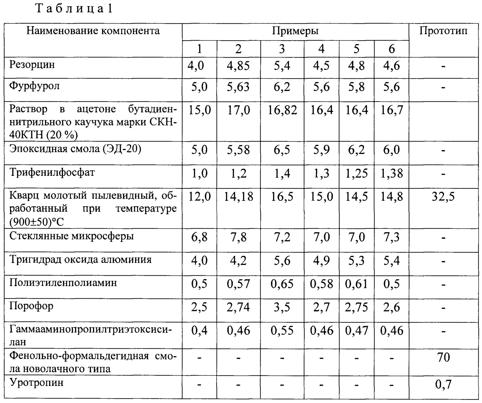 Изобретение относится к материалам, предназначенным для тепловой защиты конструктивных элементов, работающих в условиях воздействия тепловых аэродинамических и газодинамических тепловых потоков. Описана композиция для изготовления теплозащитного покрытия, включающая кварц молотый пылевидный, бутадиен-нитрильный каучук, в которой бутадиен-нитрильный каучук марки СКН-40КТН используется в виде 20% раствора по сухому остатку в ацетоне, кроме того, композиция дополнительно содержит фурфурол, резорцин, эпоксидную смолу, трифенилфосфат, тригидрад оксида алюминия, стеклянные микросферы, порофор, полиэтиленполиамин, гаммааминопропилтриэтоксисилан при следующем соотношении компонентов, масс. ч.: фурфурол 5,0-6,2, резорцин 4,0-5,4, бутадиен-нитрильный каучук марки СКН-40КТН в виде 20% раствора по сухому остатку в ацетоне 15,0-17,0, эпоксидная смола 5,0-6,5, трифенилфосфат 1,0-1,4, тригидрад оксида алюминия4,0-5,6, кварц молотый пылевидный 12,0-16,5, стеклянные микросферы 6,8-7,8, порофор 2,5-3,5, полиэтиленполиамин 0,5-0,65, гаммааминопропилтриэтоксисилан 0,4-0,55. Также описан способ изготовления композиции. Технический результат изобретения заключается в повышении и стабильности физических и механических свойств композиции при ее изготовлении, хранении и переработке, а также стойкости к окислению полуфабриката, что снижает внутреннее напряжение, исключает отслаивание и образование трещин, исключает прогрев покрытия при полимеризации и поликонденсации. 2 н. и 1 з.п. ф-лы, 2 табл., 6 пр.
