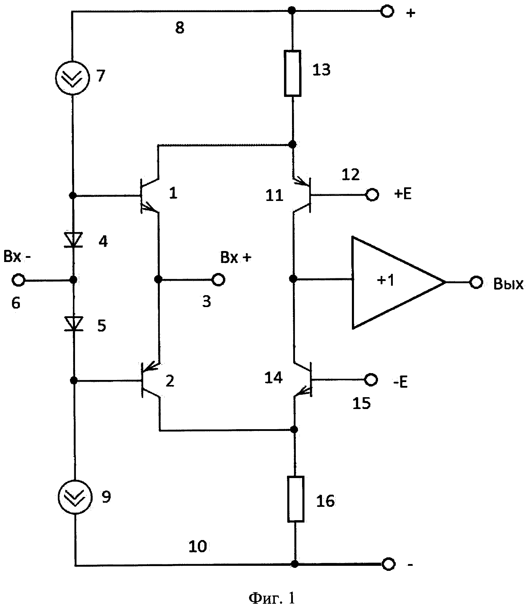 Изобретение откосится к области радиотехники и связи и может быть использовано в качестве устройства усиления аналоговых сигналов в схемах приемопередатчиков мультиплексного канала передачи данных, драйверах кабельных модемов, буферах АЦП и ЦАП, активных фильтрах и т.п. Известны схемы операционных усилителей (ОУ) с входными каскадами на основе двухтактных эмиттерных повторителей на комплементарных биполярных транзисторах, связанных с промежуточным каскадом, реализованным на основе двух токовых зеркал [1-10]. Более высокочастотными являются ОУ, в которых во входных каскадах используется каскодная схема [11-13]. Прототипом (фиг. 1) заявляемого устройства является операционный усилитель, описанный в патент US 7479831, fig. 7 [11], содержащий первый 1 и второй 2 входные транзисторы, эмиттеры которых соединены с неинвертирующим входом 3 устройства, первый 4 и второй 5 последовательно соединенные прямосмещенные р-n переходы, включенные между базами первого 1 и второго 2 входных транзисторов, инвертирующий 6 вход устройства, первый 7 токостабилизирующий двухполюсник, включенный между базой первого 1 входного транзистора и первой 8 шиной источника питания, второй 9 токостабилизирующий двухполюсник, включенный между базой второго 2 входного транзистора и второй 10 шиной источника питания, первый 11 выходной транзистор, база которого соединена с первым 12 вспомогательным источником напряжения питания, а эмиттер соединен с коллектором первого 1 входного транзистора и через первый 13 токостабилизирующий резистор связан с первой 8 шиной источника питания, второй 14 выходной транзистор, база которого соединена со вторым 15 вспомогательным источником напряжения питания, а эмиттер соединен с коллектором второго 2 входного транзистора и через второй 16 токостабилизирующий резистор связан со второй 10 шиной источника питания, причем коллекторы первого 11 и второго 14 выходных транзисторов связаны с токовым выходом устройства. Существенный недостаток известного ОУ состоит в том, что он характеризуется невысоким быстродействием при импульсных входных сигналах и низким значением ширины полосы пропускания сигнала. Это обусловлено повышенной склонностью этого ОУ к возбуждению, для препятствования чему необходимо существенно увеличивать емкость коррекции, что приводит к снижению быстродействия ОУ. Основная задача предлагаемого изобретения состоит в создании операционного усилителя с улучшенными динамическими свойствами входного каскада, что обеспечивается созданием дополнительных каналов преобразования входного напряжения в выходной ток ОУ, повышающих при прочих равных условиях крутизну усиления входного каскада. Технический результат - увеличение ширины полосы пропускания и повышение быстродействия при импульсных входных сигналах. Поставленная задача достигается тем, что операционный усилитель содержит первый (1) и второй (2) входные транзисторы, базы которых соединены с неинвертирующим входом (3) устройства, первый (4) и второй (5) последовательно соединенные прямосмещенные р-n переходы, включенные между эмиттерами первого (1) и второго (2) входных транзисторов, причем общий узел указанных прямосмещенных р-n переходов соединен с инвертирующим (6) входом устройства, первый (7) токостабилизирующий двухполюсник, включенный между эмиттером первого