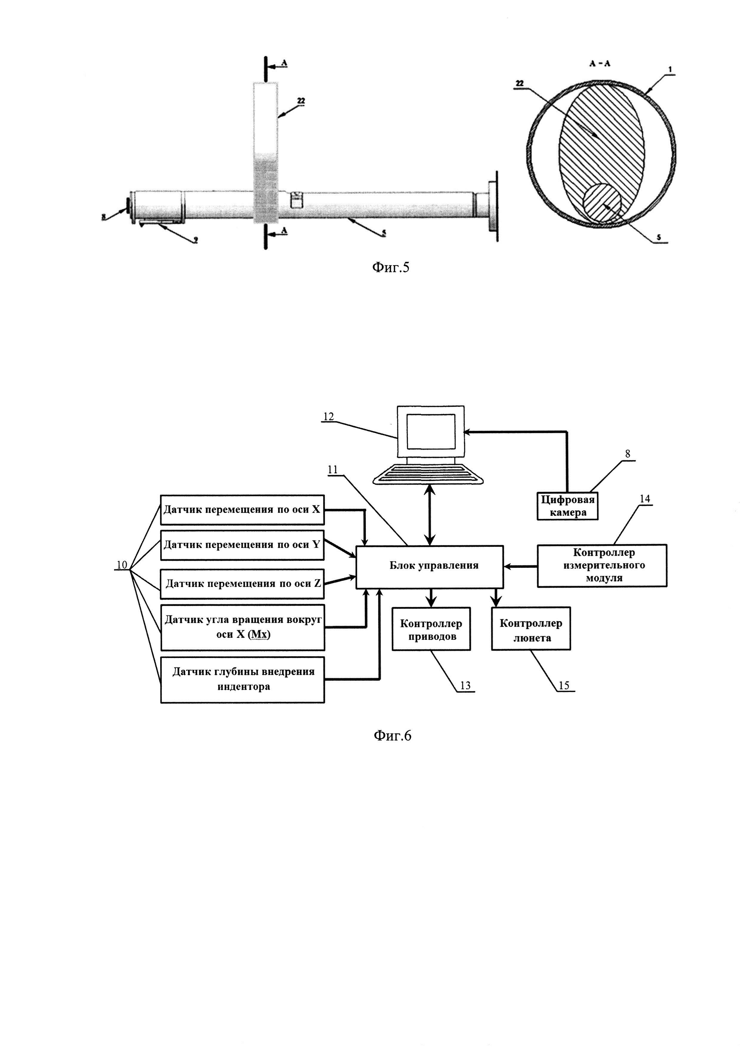 Изобретение относится к измерительной технике для измерения микромеханических характеристик внутренних поверхностей изделий относится к области машиностроения, в частности для контроля физико-механических свойств внутренних поверхностей сквозных и глухих отверстий с тонким покрытием. Сущность: осуществляют внедрение в поверхность пирамидального индентора из твердого материала с известными упругими характеристиками, запись диаграммы нагружение - глубина внедрения и обработку массива данных, описывающих диаграмму нагружение - внедрение. Производится внедрение упругого индентора в криволинейную внутреннюю поверхность топокомпозита в диапазоне глубин внедрения от единиц нанометров до десятка микрометров. Осуществляется регистрация данных измерения, а также их обработка с использованием теоретических аналитических зависимостей, описывающих механику нормального контактного взаимодействия упругого сферического индентора с покрытием из топокомпозита в области упругопластического деформировании последнего, по совокупности нескольких показателей, а именно твердости и модуля упругости покрытия, композиционной твердости и модуля упругости топокомпозита, которые определяются по формулам. Устройство содержит основание, на котором расположена подвижная стойка с вращающейся площадкой, на которой закреплена штанга с измерительным модулем и люнетом и с возможностью перемещения ее внутри отверстия исследуемого изделия по трем осям и вращения вокруг своей оси с помощью расположенных на стойке приводов, при этом на хвостовике штанги установлена цифровая камера. Технический результат: возможность комплексной оценки с высокой точностью параметров физико-механических свойств внутренних поверхностей сквозных и глухих отверстий с тонким покрытием в режиме одного технологического измерения. 2 н.п. ф-лы, 6 ил.