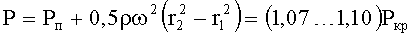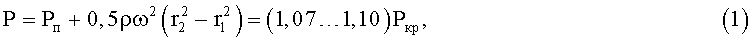 где P - давление жидкости в охлаждающих каналах у корневого сечения лопатки, Pп - давление газообразной среды над свободной поверхностью жидкости, Pкр - критическое давление охлаждающей жидкости, при котором исчезает граница между ее паровой и жидкой фазами, ρ - плотность охлаждающей жидкости при ожидаемой ее средней температуре в соединительных каналах до корневого сечения лопатки, ω - угловая скорость вращения диска, r2 - радиус диска у корневого сечения лопаток,