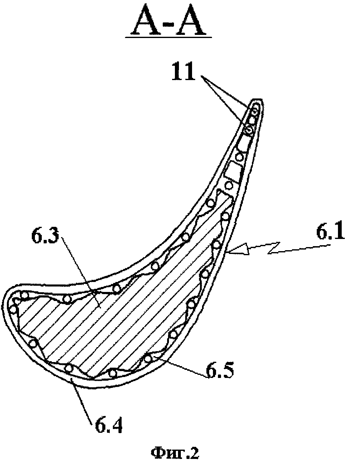 выходные концы охлаждающих каналов сообщены так же, как входные, с помощью соединительных каналов с указанным желобом, емкость последнего в 100…110 раз превышает емкость охлаждающего тракта одной лопатки, а суммарная производительность всех форсунок выбрана из условия поддержания стабильного уровня свободной поверхности охлаждающей жидкости в пределах указанного желоба при вращении ротора.