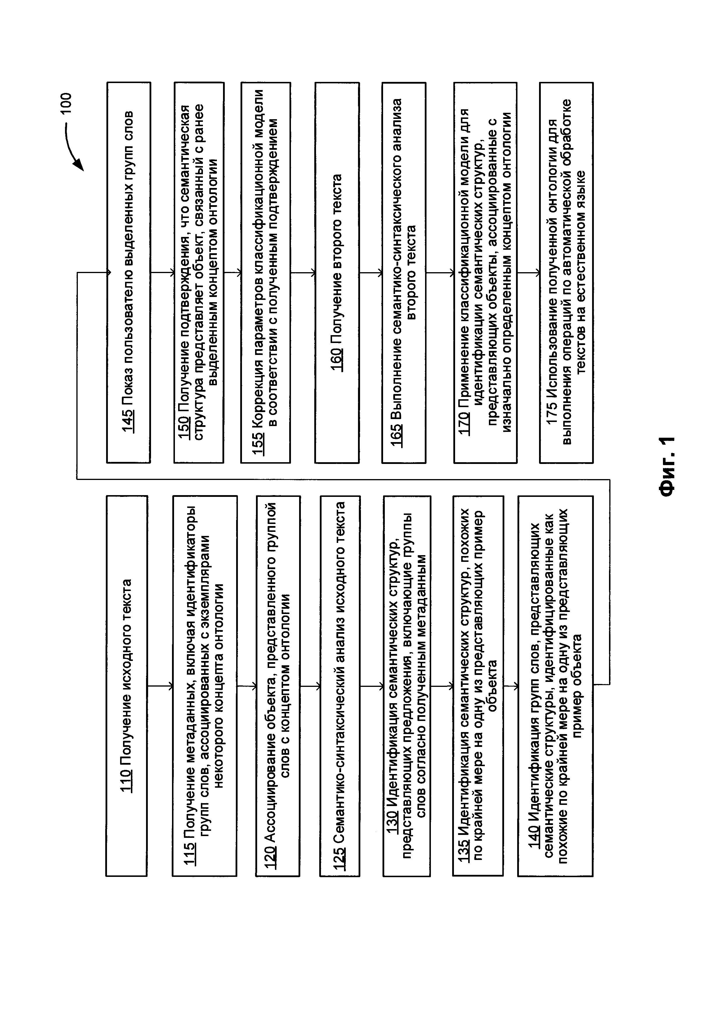 1. Способ поиска и извлечения сущностей в текстах на естественном языке, включающий получение вычислительным устройством посредством пользовательского интерфейса идентификаторов первого множества групп слов в тексте на естественном языке, причем каждая группа слов содержит одно или более слов естественного языка; ассоциацию объекта, представленного каждой группой слов, с некоторым концептом онтологии; выполнение семантико-синтаксического анализа текста на естественном языке для получения первого множества семантических структур, ассоциированных с первым множеством групп слов; определение в тексте на естественном языке второго множества групп слов, в которых каждая группа слов из второго множества групп слов представляет семантическую структуру и ассоциирована с тем же концептом онтологии; в ответ на получение подтверждения того, что группа слов из второго множества групп слов представляет объект, ассоциированный с тем же концептом онтологии, изменение параметра модели классификации, используемой для классификации семантических структур, отражающего степень ассоциации данного объекта с соответствующим концептом онтологии. 2. Способ по п. 1, отличающийся тем, что определение второго множества групп слов дополнительно включает определение второго множества семантических структур, причем каждая семантическая структура из второго множества представляет предложение, содержащее по меньшей мере одну группу слов из второго множества групп слов; определение в первом множестве семантических структур семантической структуры, схожей по меньшей мере с одной семантической структурой из второго множества семантических структур для некоторой метрики сходства; и определение группы слов, принадлежащей определенной семантической структуре из второго множества семантических структур, как ассоциированной со вторым множеством групп слов. 3. Способ по п. 1, дополнительно содержащий использование модели классификации для извлечения информации из текстов на естественном языке. 4. Способ по п. 1, дополнительно включающий использование онтологии для выполнения операций обработки естественного языка. 5. Способ по п. 1, дополнительно включающий предварительный анализ структуры документа на естественном языке для получения вспомогательной онтологии, отражающей структуру документа. 6. Способ по п. 1, дополнительно включающий получение второго текста на естественном языке; выполнение семантико-синтаксического анализа второго текста на естественном языке для получения второго множества семантических структур; использование модели классификации для определения второй семантической структуры, представляющей второй объект, связанный с данным концептом. 7. Способ по п. 6, отличающийся тем, что определение второй семантической структуры дополнительно включает определение множества значений, полученных с помощью модели классификации, причем каждое значение отражает степень ассоциации второй семантической структуры с соответствующим концептом онтологии; выбор оптимального значения из определенного множества значений; и ассоциацию второй семантической структуры с концептом, соответствующим выбранному оптимальному значению. 8. Способ по п. 1, отличающийся тем, что семантическая структура является графом, включающим мн