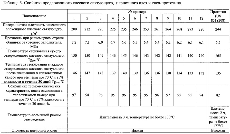 1. Эпоксидное клеевое связующее, включающее смесь жидкой эпоксидной смолы, термопласта полиэфирсульфона, твердой эпоксидной смолы и латентного отверждающего агента дициандиамида, отличающееся тем, что оно дополнительно содержит ускоритель отверждения несимметрично дизамещенную мочевину и модификатор аэросил, жидкая эпоксидная смола представляет собой жидкую эпоксиоксазолидоновую смолу, твердая эпоксидная смола представляет собой твердую эпоксидную смолу на основе бисфенола А, при следующем соотношении компонентов, мас. %: 2. Эпоксидное клеевое связующее по п. 1, отличающееся тем, что жидкая эпоксиоксазолидоновая смола представляет собой смолу, полученную в процессе взаимодействия эпоксидной смолы на основе бисфенола А с полиизоцианатом в присутствии катализатора и активного растворителя при следующем соотношении компонентов, мас. %: 3. Эпоксидное клеевое связующее по п. 2, отличающееся тем, что катализатор выбран из группы, содержащей: хлорид лития, хлорид цинка и хлорид меди(II). 4. Эпоксидное клеевое связующее по п. 2, отличающееся тем, что активный растворитель выбран из группы: этанол, 1,4-бутандиол и этиленгликоль. 5. Эпоксидное клеевое связующее по п. 1, отличающееся тем, что оно дополнительно содержит краситель в количестве 0,01-0,50 мас. % от всего связующего. 6. Эпоксидное клеевое связующее по п. 5, отличающееся тем, что краситель выбран из группы: метиленовый синий, конго красный и органический пигмент голубой фталоцианиновый. 7. Эпоксидное клеевое связующее по п. 1, отличающееся тем, что оно дополнительно содержит поверхностное активное вещество в количестве 0,05-1,00 мас. % от всего связующего. 8. Пленочный клей, представляющий собой бумагу с антиадгезионным покрытием и нанесенным на него слоем эпоксидного клеевого связующего, отличающийся тем, что эпоксидное клеевое связующее представляет собой связующее по пп. 1-7, причем поверхностная плотность слоя указанного связующего на антиадгезионном покрытии составляет 200-270 г/м2. 9. Пленочный клей по п. 8, отличающийся тем, что на слой эпоксидного клеевого связующего нанесено защитное покрытие в виде полиэтиленовой пленки.жидкая эпоксиоксазолидоновая смола 50,0-77,0 полиэфирсульфон 6,0-20,2 твердая эпоксидная смола на основе бисфенола А 4,95-23,50 латентный отверждающий агент дициандиамид 4,0-6,0 ускоритель отверждения несимметрично дизамещенная мочевина 0,5-2,0 модификатор аэросил 0,3-5,0 эпоксидная смола на основе бисфенола А 82,60-97,00 полиизоцианат 2,88-16,50 катализатор 0,01-0,40 активный растворитель 0,11-0,50