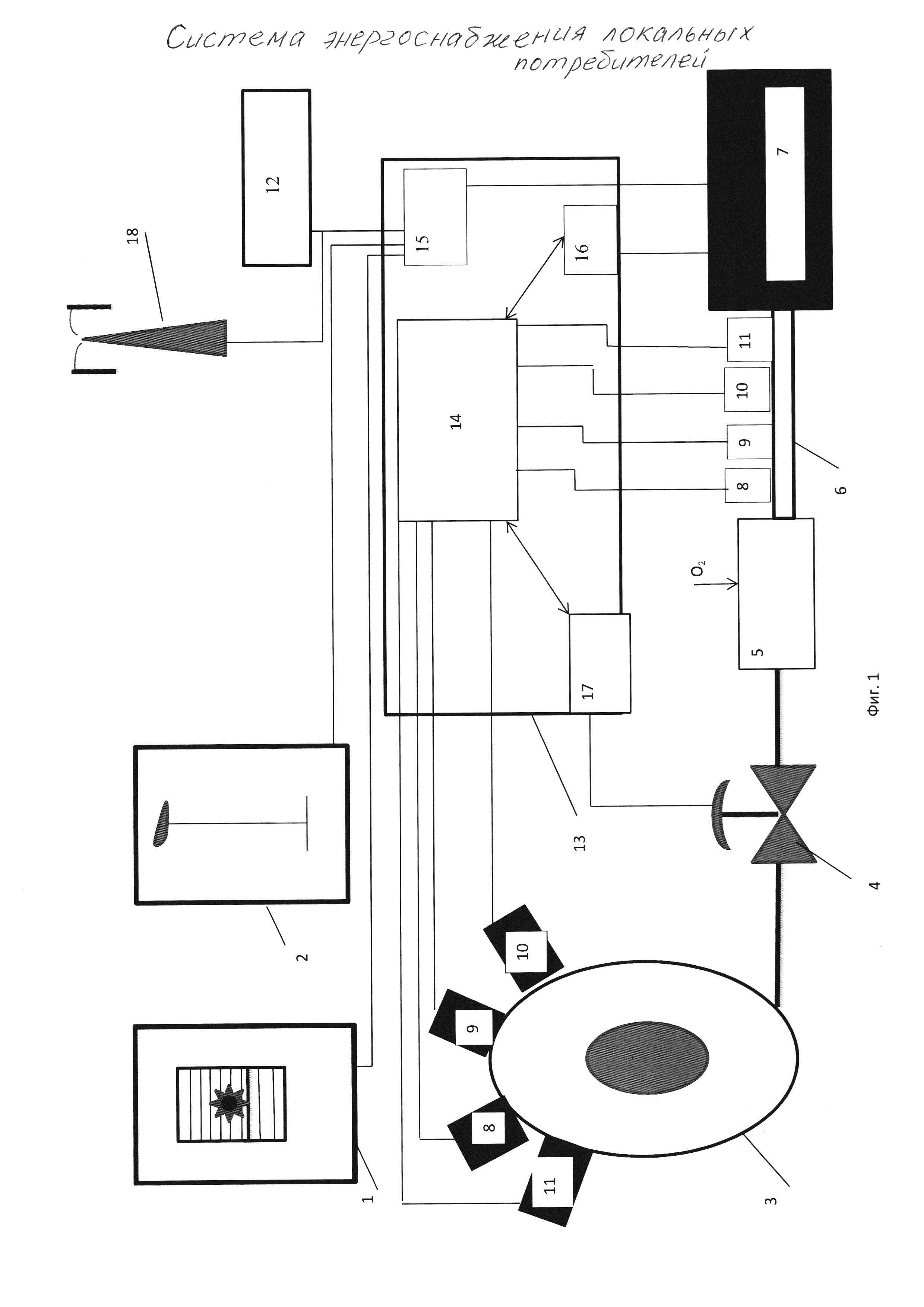 1. Система энергоснабжения локальных потребителей, состоящая из генераторов на основе возобновляемых источников электроэнергии 1 и 2, генератора на основе невозобновляемого источника энергии - топливного элемента 7, управляющего устройства 13, соединенного с генераторами 1, 2, 7, накопителями энергии 12 и потребителями энергии 18, отличающаяся тем, что система дополнительно содержит криобак 3 со сжатым природным газом, соединенный через клапанную систему 4, эжектор 5 и трубопровод 6 с топливным элементом 7, датчики измерения температуры 8, акустической эмиссии 9, давления 10 и механических напряжений 11, установленные на криобаке 3 и трубопроводе 6 и соединенные с управляющим устройством 13, выполненным в виде информационно-измерительной и управляющей системы. 2. Система по п. 1, отличающаяся, тем, что информационно-измерительная и управляющая система 13 содержит устройство преобразования и интеллектуального анализа измерительной информации 14, устройство управления функционированием топливного элемента 16, устройство управления безопасным функционированием криобака 17 и устройство управления передачи энергии 15. 3. Система по п. 2, отличающаяся, тем, что устройство преобразования и интеллектуального анализа измерительной информации 14 соединено с датчиками измерения 8, 9, 10 и 11, через устройство управления безопасным функционированием криобака 17 соединено с клапанной системой 4 и через блок 16 соединено с топливным элементом 7. 4. Система по п. 2, отличающаяся, тем, что генераторы энергии 1, 2, 7, накопители энергии 12 и потребители энергии 18 соединены с информационно-измерительной и управляющей системой 13 через устройство управления передачи энергии 15.