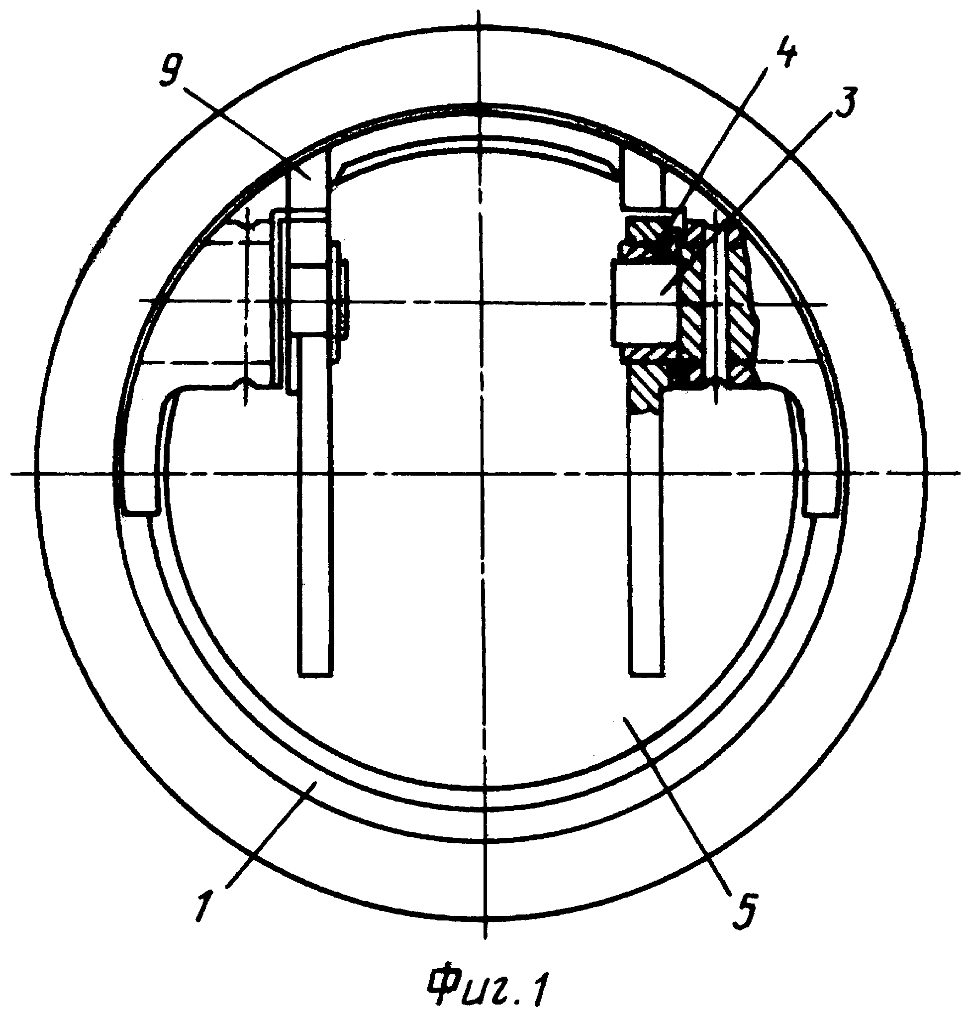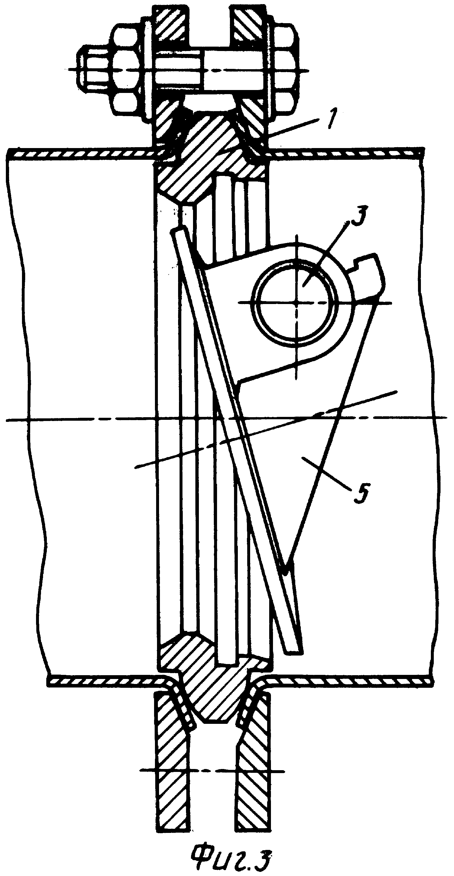 самоустанавливаясь в ней. Так как центр тяжести заслонки 5 смещен от оси поворота к плоскости заслонки, то при отсутствии потока в трубопроводе заслонка 5 приоткрыта (см. фиг.2). Для