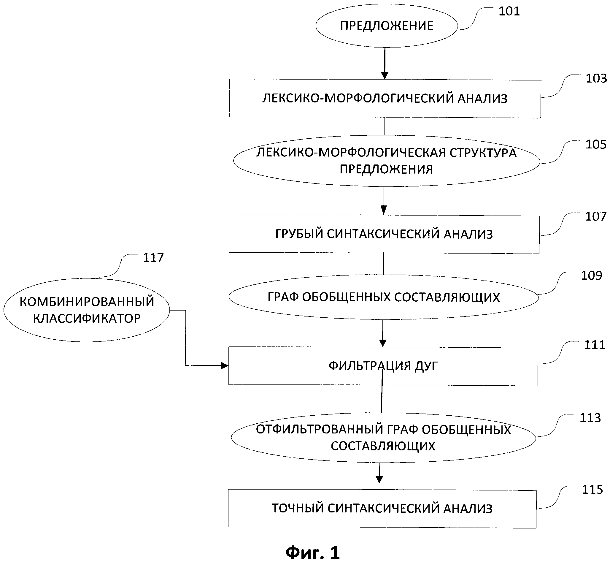 фильтрацию дуг графа обобщенных составляющих с использованием комбинированного классификатора с целью сокращения перебора вариантов разбора без потери смысла предложения;