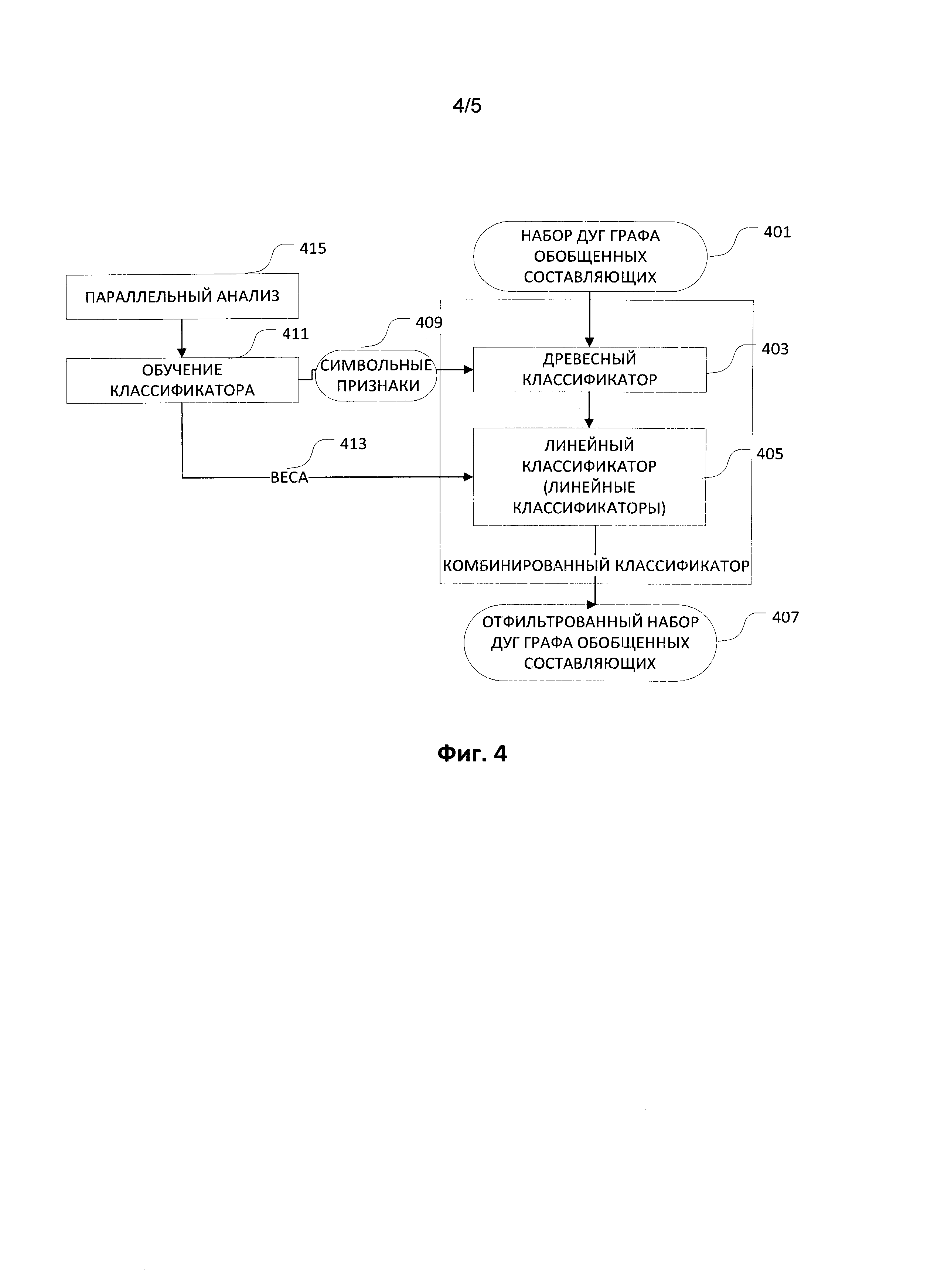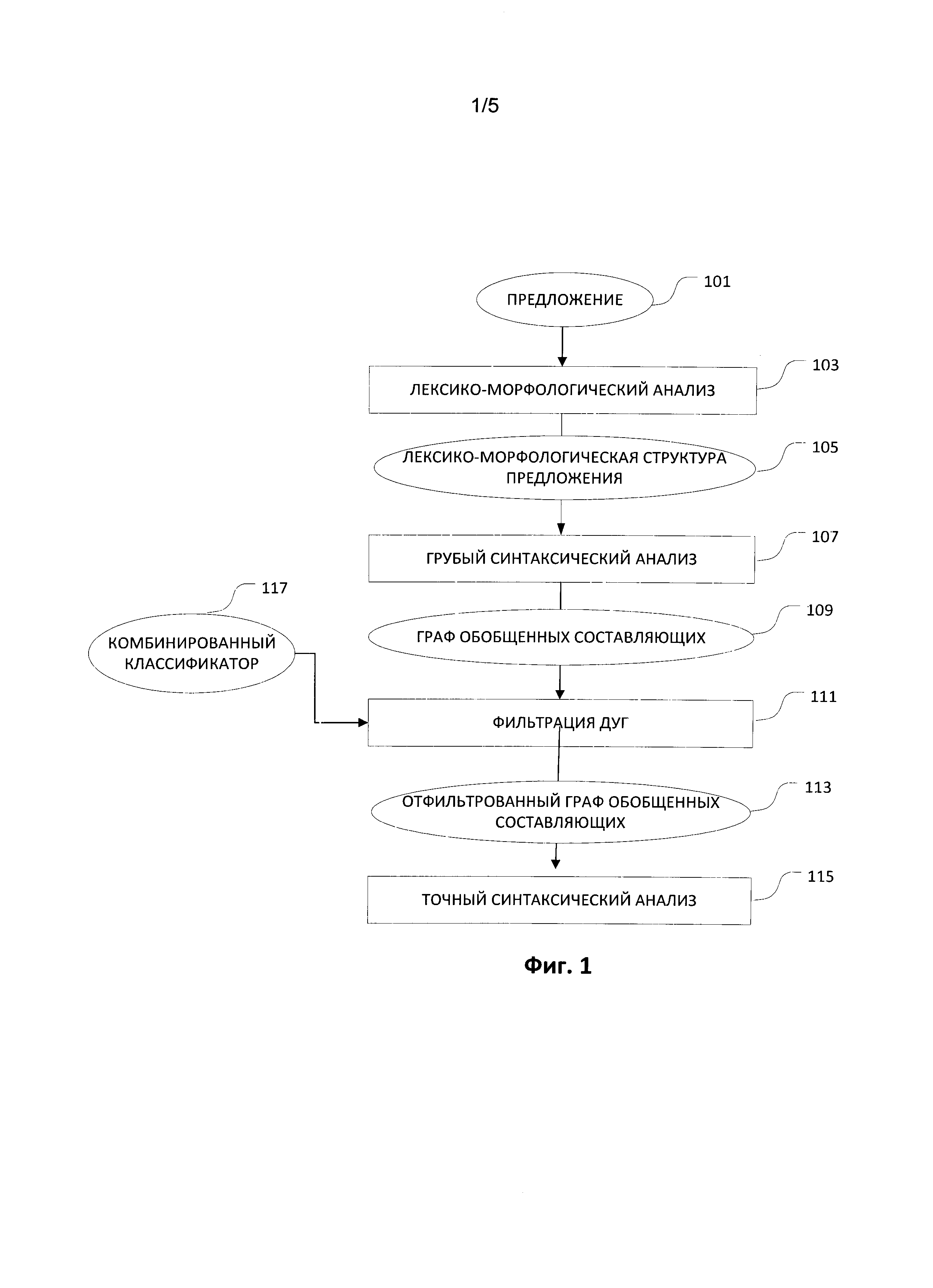 ОБЛАСТЬ ИЗОБРЕТЕНИЯ [0001] Настоящее изобретение относится к анализу синтаксической структуры текста с помощью компьютера. ИЗВЕСТНЫЙ УРОВЕНЬ ТЕХНИКИ [0002] Известно множество систем для обработки письменных текстов на естественных языках. Поскольку в структуре естественного языка присутствует неоднозначность, такие тексты непросто анализировать. Количество потенциальных синтаксических связей в предложении может быть очень большим. [0003] Все это приводит к тому, что существует большое количество потенциальных синтаксических конструкций, которые следует рассматривать при анализе текста. Чем более продвинутой является система анализа и чем больше возможностей она учитывает, тем больше вариантов приходится анализировать. Попытка проанализировать все связи приводит к так называемому «комбинаторному взрыву». Попытка рассмотреть только наиболее вероятные комбинации может привести к потере смысла. В результате возникает проблема оптимизации процесса синтаксического анализа, которая заключается в сведении к минимуму требуемого времени при сохранении целостности результата, причем решение этой проблемы имеет критически важное значение. Настоящее изобретение предлагает способ оценки всех возможных синтаксических комбинаций быстро и без потери истинного смысла текста. РАСКРЫТИЕ ИЗОБРЕТЕНИЯ [0004] В этом документе раскрываются способы, методы и системы анализа исходного предложения путем выявления предложения, определения графа обобщенных составляющих предложения, полученного на этапе грубого синтаксического анализа лексико-морфологической структуры предложения, причем граф обобщенных составляющих содержит дуги, узлы; и производится фильтрация дуг графа обобщенных составляющих с использованием комбинированного классификатора. В одном из вариантов осуществления данного изобретения комбинированный классификатор содержит древесный классификатор и по меньшей мере один линейный классификатор; причем построение синтаксической структуры исходного предложения проводится на этапе точного синтаксического анализа, использующего граф обобщенных составляющих с отфильтрованными дугами. [0005] В одном из возможных вариантов осуществления изобретения древесный классификатор распределяет дуги по кластерам на основе заранее определенного набора признаков. В другом варианте осуществления изобретения выбранный набор признаков определяется по результатам параллельного анализа двуязычных текстовых корпусов. В другом варианте осуществления изобретения порядок признаков из предварительно заданного набора определяется согласно значению энтропии признаков. В другом варианте осуществления древесный классификатор основан на Iterative Dichotomiser 3 (итерационном дихотомическом алгоритме ID3). В некоторых вариантах осуществления веса для линейного классификатора определяются по результатам параллельного анализа неразмеченных двуязычных текстовых корпусов. [0006] В данном документе также раскрываются способы, методы и системы для обучения классификатора, включающие выполнение параллельного анализа двуязычных текстовых корпусов, выявление двух параллельных предложений в неразмеченных двуязычных текстовых корпусах; построение двух соответствующих графов обобщенных составляющих для каждого из двух параллельных предл