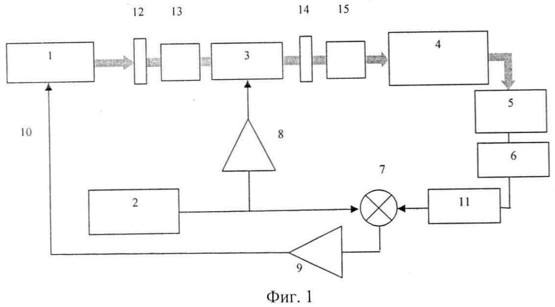 Изобретения относятся к квантовой электронике, лазерной спектроскопии, акустооптике и могут быть использованы для широкополосной частотной стабилизации лазеров и сужения спектра их излучения. В настоящей заявке представлен фазочувствительный способ частотной стабилизации излучения лазера с применением метода частотно-модуляционной оптической гетеродинной спектроскопии с использованием нового устройства - акустооптического модулятора (АОМ), функционирующего исключительно в режиме дифракции Рамана-Ната, в качестве внешнего фазового модулятора. Представляемый способ может быть использован для получения сигналов ошибки с нулевым фоновым уровнем в сверхбыстрых, широкополосных электронных цепях отрицательной обратной связи при частотной автоподстройке лазеров к оптическим резонансам, включая резонансы высокодобротных резонаторов Фабри-Перо с величинами резкости до нескольких десятков тысяч и шириной резонанса в несколько десятков герц. Для получения сигналов ошибки в экстремально высокоскоростных петлях обратной связи в настоящее время известен гетеродинный метод частотно-модулированных (ЧМ) боковых составляющих (1. Drever R., Hall J., Kovalski F., Hough J., Ford G., Munley A., and Ward H., Appl. Phys. B, 31, 97, 1983; 2. Bjorklund G., Levenson M., Lenth W., and Ortiz C., Appl. Phys. B, 32, 145, 1983), с электрооптическим модулятором (ЕОМ) в качестве внешнего фазового модулятора (фиг.1), заключающийся в фазовой модуляции лазерного излучения и пропускании его через резонансно-поглощающую дисперсную среду, детектировании на фотоприемнике высокочастотных биений прошедшего через среду частотно-модулированного излучения, гетеродинном детектировании высокочастотных биений на смесителе, выделении выходного постоянного сигнала смесителя и подаче его в качестве сигнала ошибки в цепь отрицательной обратной связи на контролирующий лазерную частоту элемент. К недостаткам можно отнести то, что существующие электрооптические модуляторы не генерируют ЧМ спектр в чистом виде, что является причиной такого нежелательного эффекта, как присутствие остаточного амплитудного шума в спектре сигнала ошибки, для устранения которого требуется аккуратное выравнивание поляризаций входного и выходного излучений, выполняемое набором из полуволновых пластинок и поляризаторов. А также получение сигналов ошибки возможно лишь в узком (до нескольких мегагерц) диапазоне частот модуляции. Существующие АОМ проектируются, прежде всего, для функционирования в режиме Брэгговского отклонения. Известен аналог АОМ модели 1205-С2 фирмы "ISOMET", с центральной рабочей частотой 80 МГц и полосой модуляции 30 МГц, спроектированный для применения в качестве Брэгговского дефлектора, содержащий акустооптическую ячейку, состоящую из светозвукопровода, выполненного из монокристалла, с расположенными на нем электроакустическим преобразователем и звукопоглотителем, и согласующее электронное устройство. Недостатком аналога является то, что при рабочих частотах модуляции в диапазоне от 10 до 40 МГц, в котором необходимо получать сигналы ошибки для системы частотной автоподстройки (ЧАП) лазерного излучения к оптическим резонансам с шириной до нескольких мегагерц, дифракционным свойствам этого АОМ присущи черты как Брэгговского отклонения, так и дифракции Рамана-Ната, что приводит к появлению ненулевого фонового уровня сигна