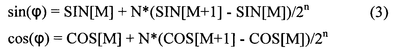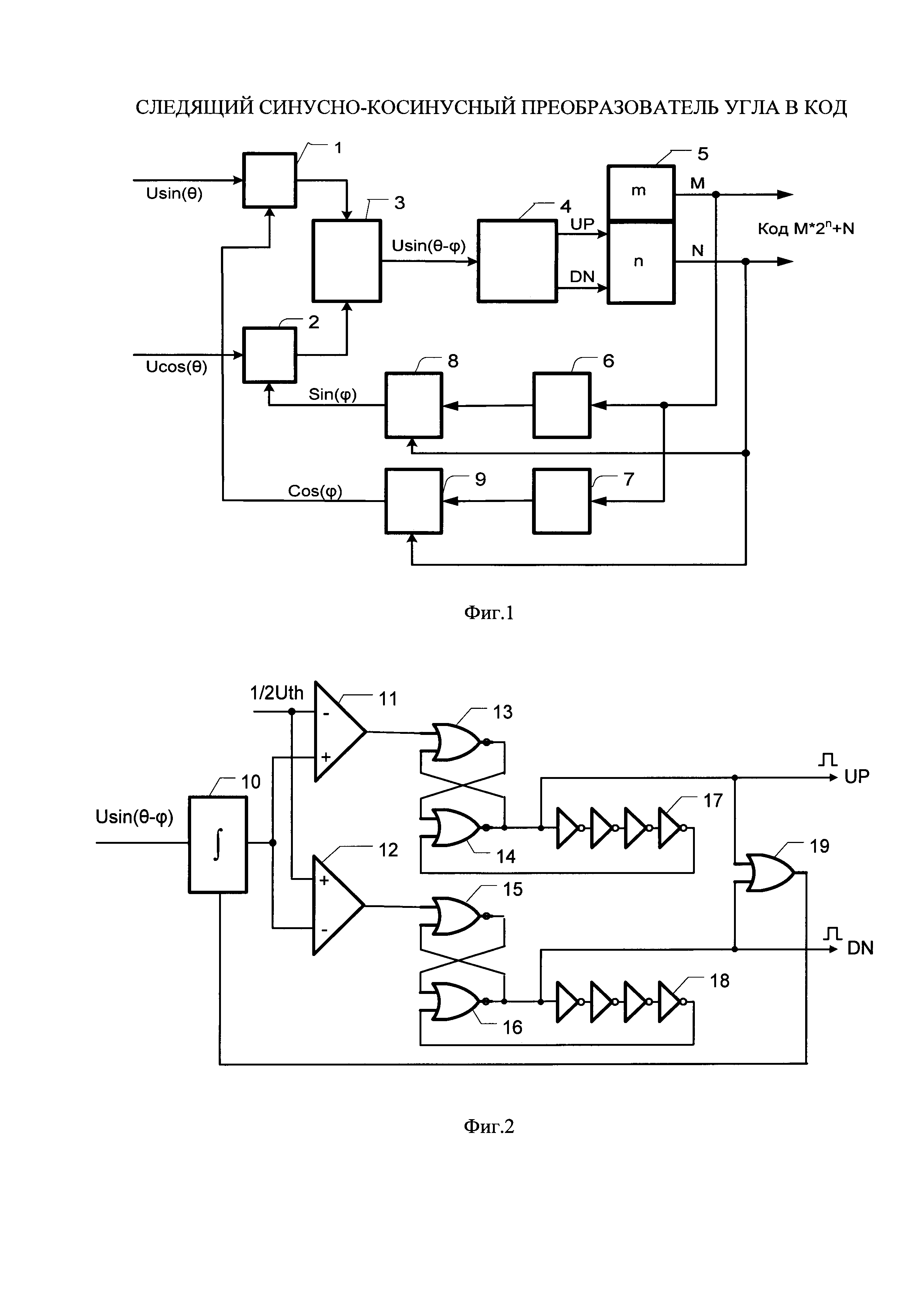 Изобретение относится к измерительной технике, в частности к следящим синусно-косинусным преобразователям угла в код, и может быть использовано в автомобильной технике, станкостроении, авиационной и ракетной технике и других областях, где требуется измерять положение с помощью датчика, формирующего синусно-косинусный сигнал, фаза которого пропорциональна измеряемому углу. Известен твердотельный преобразователь угла [1], который содержит входной мультиплексор сигналов датчика угла, аналого-цифровой преобразователь (АЦП), цифровой блок вычисления угла и цифроаналоговый преобразователь (ЦАП), который преобразует вычисленный код угла в выходное напряжение преобразователя. Особенностью преобразователя является использование в цифровом блоке вычисления угла алгоритма CORDIC. Недостатком аналога является низкое быстродействие преобразователя, в котором время преобразования слагается из времени преобразования входных сигналов датчиков угла в цифровой код и числа итераций вычисления угла по алгоритму CORDIC. Известен цифровой преобразователь сигналов резольвера [2]. Преобразователь обеспечивает преобразование синусно-косинусных сигналов резольвера, представляющего собой вращающийся трансформатор с двумя ортогональными обмотками и неподвижной обмоткой возбуждения, в цифровой код. Преобразователь содержит два АЦП синусно-косинусного сигнала резольвера, полосовые фильтры, два умножителя кодов сигналов синус и косинус на коды значений синуса и косинуса выходного кода, сумматор разности выходов умножителей и цепь обратной связи, содержащей реверсивный счетчик выходного кода, соединенный с постоянным запоминающим устройством (ПЗУ) значений синуса и косинуса для каждого значения выходного кода. Особенностью преобразователя является использование следящего алгоритма преобразования синус-косинусного выходного сигнала в код угла. Недостатком преобразователя является сложная электрическая схема, которая содержит два АЦП и процессор, наличие ПЗУ большой емкости, а также ограниченное быстродействие, которое определяется временем преобразования аналоговых сигналов резольвера в цифровой код. Известен преобразователь синусно-косинусного сигнала в код положения [3]. Преобразователь построен по типовой следящей схеме и содержит два умножителя входных сигналов, вычитатель, компаратор и ГУН, который вырабатывает сигналы инкрементирования и декрементирования реверсивного счетчика по разностному сигналу вычитателя. Код реверсивного счетчика является выходным кодом преобразователя. Особенностью преобразователя является то, что значения синуса и косинуса не выбираются из таблиц синуса и косинуса по коду счетчика, а вычисляются блоком CORDIC-вычислителя, который формирует коды значений синуса и косинуса, подаваемые на вход умножителей сигналов косинус и синус, соответственно, что позволяет сократить объем ПЗУ, но при этом снижает быстродействие преобразователя. Известно устройство цифрового преобразователя сигналов резольвера [4], выбранное в качестве прототипа. Преобразователь содержит два аналоговых умножителя входных сигналов синуса и косинуса, вычитатель, генератор, управляемый напряжением (ГУН), который вырабатывает сигналы инкрементирования и декрементирования реверсивного счетчика в зависимости от зна