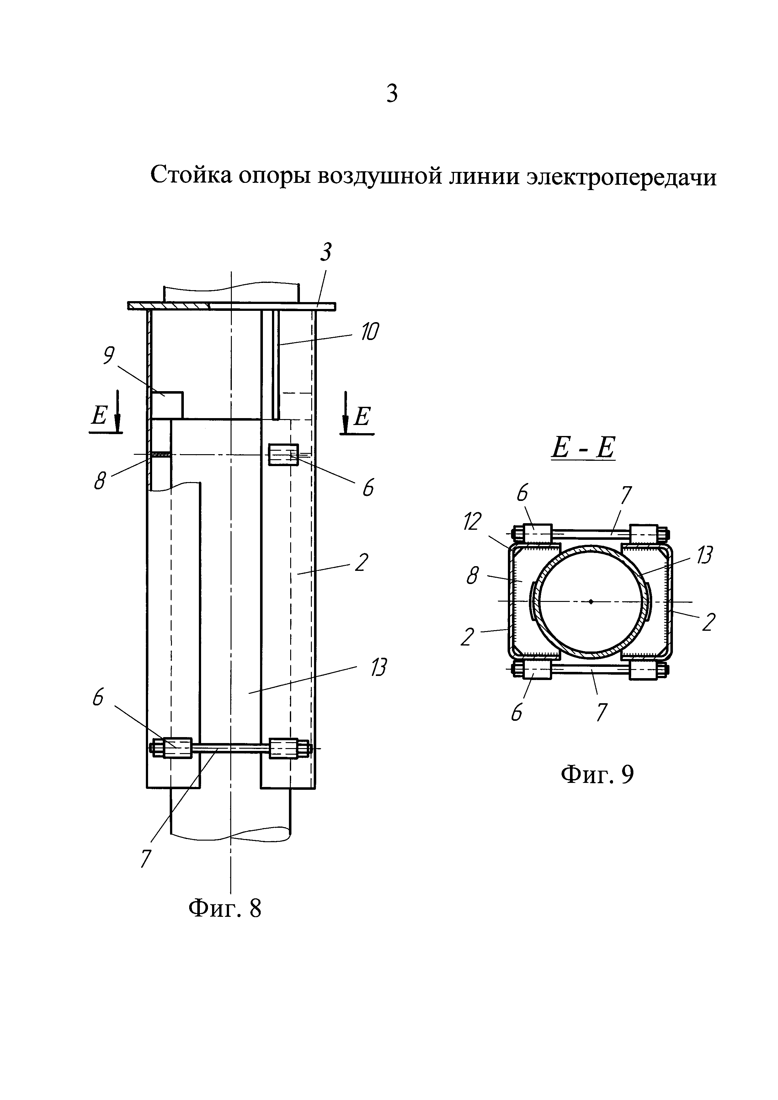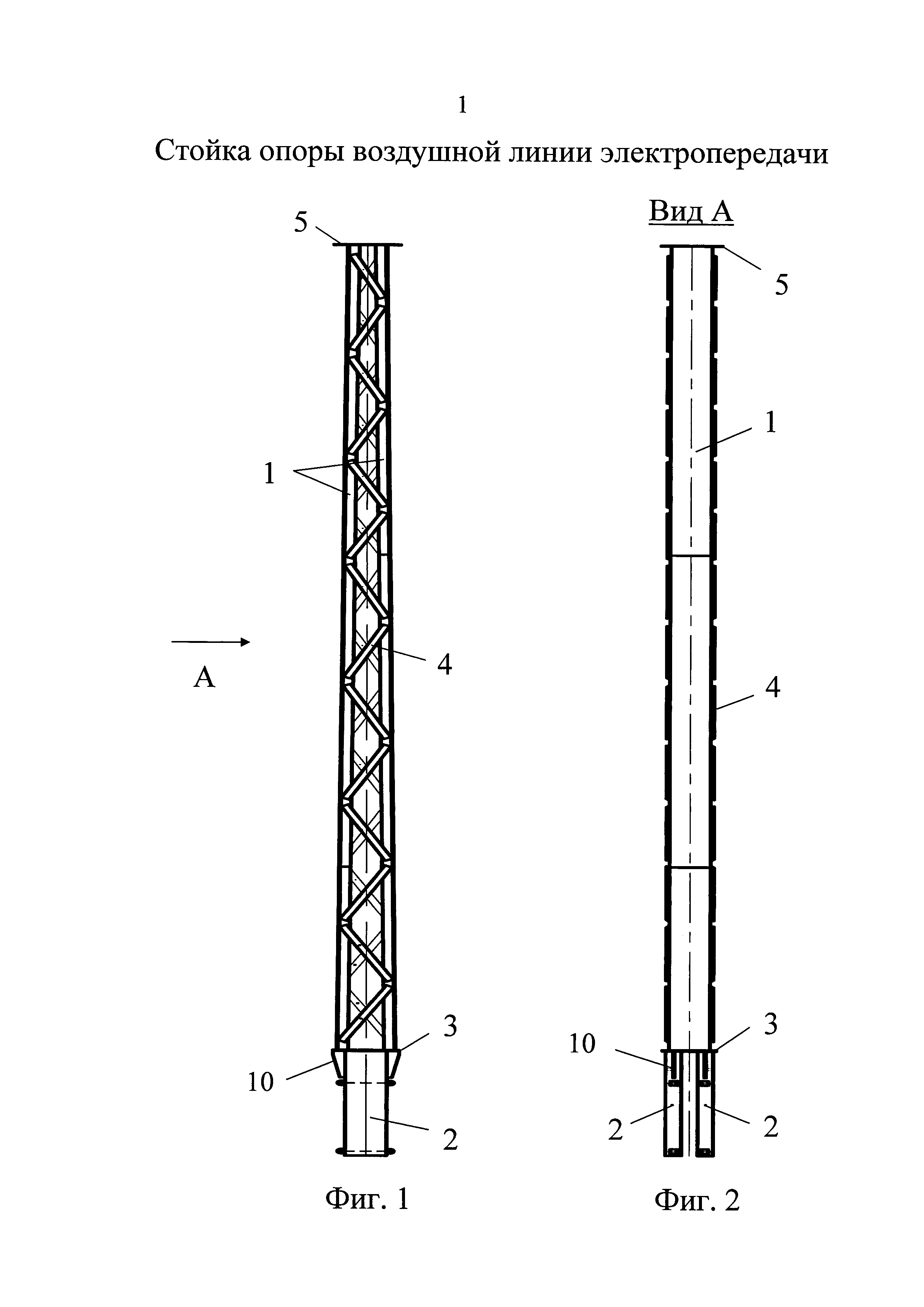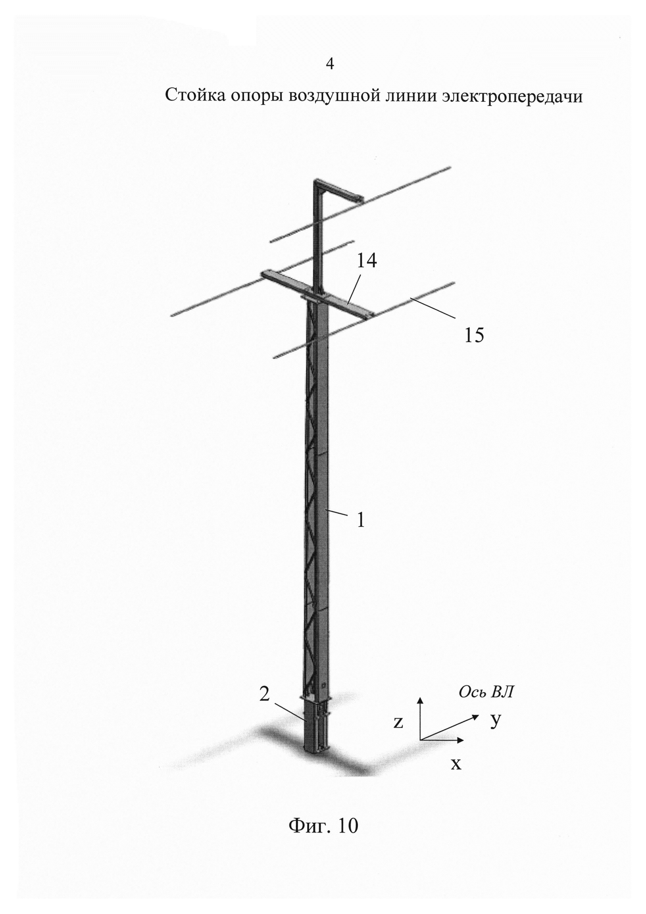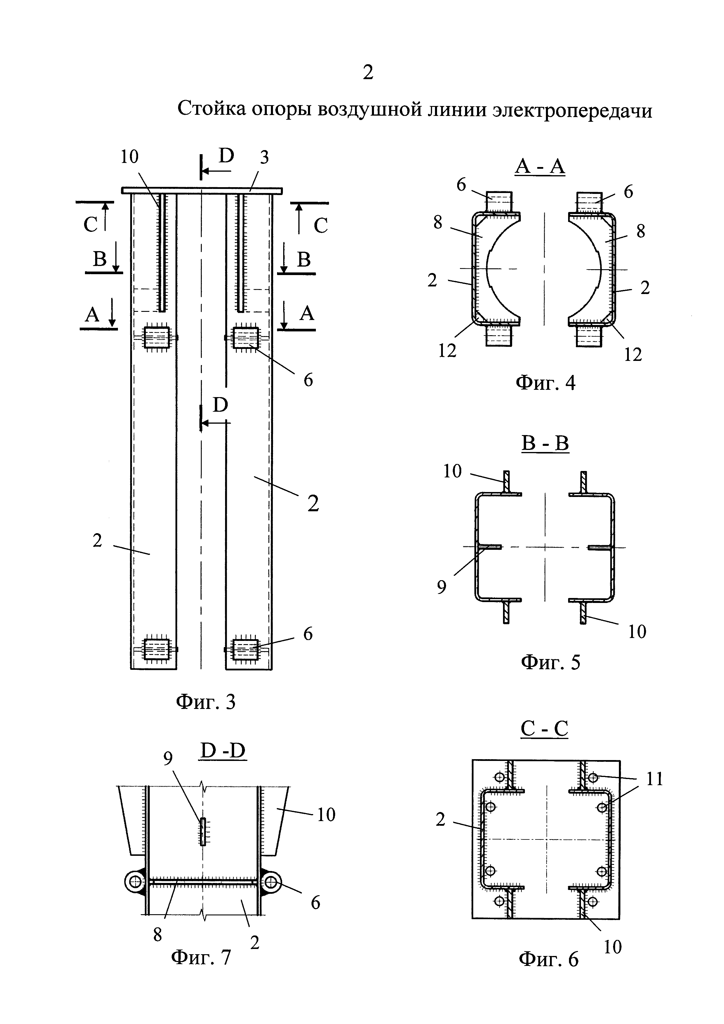 1. Стойка опоры воздушной линии электропередачи, содержащая ствол из вертикальных открытых профилей, обращенных навстречу друг другу крайними гранями, стержневые элементы, соединяющие крайние грани профилей, и средство для закрепления на свае, включающее разнесенные по высоте стойки узлы для стяжки профилей, размещенные в уровнях упомянутых узлов поперечные диафрагмы жесткости и закрепленные на внутренней поверхности профилей ограничители для опоры на верхний торец сваи, отличающаяся тем, что ствол стойки выполнен разрезным, состоящим из двух, верхней и нижней, пар вертикальных открытых профилей, жестко связанных между собой посредством поперечной пластины, в плане которой нижняя пара профилей развернута относительно верхней на 90°, при этом профили верхней пары соединены между собой стержневыми элементами, а средство для закрепления на свае размещено на профилях нижней пары. 2. Стойка по п. 1, отличающаяся тем, что в уровне поперечной пластины площадь поперечного сечения стойки, ограниченная контуром нижней пары профилей, меньше площади поперечного сечения, ограниченной контуром верхней пары профилей. 3. Стойка по п. 1, отличающаяся тем, что поперечное сечение верхней части стойки выполнено расширенным в поперечном направлении относительной воздушной линии электропередачи, при этом поперечное сечение нижней части стойки выполнено расширенным в направлении оси воздушной линии электропередачи. 4. Стойка по п. 1, отличающаяся тем, что нижняя пара профилей выполнена из металла большей толщины, чем верхняя. 5. Стойка по п. 1, отличающаяся тем, что вертикальные открытые профили выполнены в виде П-образных гнутых профилей. 6. Стойка по п. 1, отличающаяся тем, что в поперечной пластине выполнены сквозные отверстия. 7. Стойка по п. 1, отличающаяся тем, что между поперечной пластиной и наружными стенками профилей установлены ребра жесткости. 8. Стойка по п. 1, отличающаяся тем, что ограничители выполнены в виде вертикальных пластин, приваренных ребром к внутренней стенке соответствующего профиля. 9. Стойка по п. 1, отличающаяся тем, что каждый узел стяжки включает два упора, закрепленных напротив друг друга на крайних гранях нижних профилей, при этом в упорах выполнены отверстия для стягивающего резьбового элемента. 10. Стойка по п. 9, отличающаяся тем, что упоры выполнены в виде приваренных к профилям отрезков трубчатого профиля. 11. Стойка по п. 1, отличающаяся тем, что поперечные диафрагмы жесткости выполнены составными из двух фигурных пластин, каждая из которых размещена в пространстве между внутренними стенками соответствующего профиля и закреплена к этим стенкам на части контура, при этом другая часть контура пластины выполнена с возможностью сопряжения с боковой поверхностью сваи. 12. Стойка по п. 11, отличающаяся тем, что фигурные пластины выполнены со срезанными углами в зонах изгибов профилей.