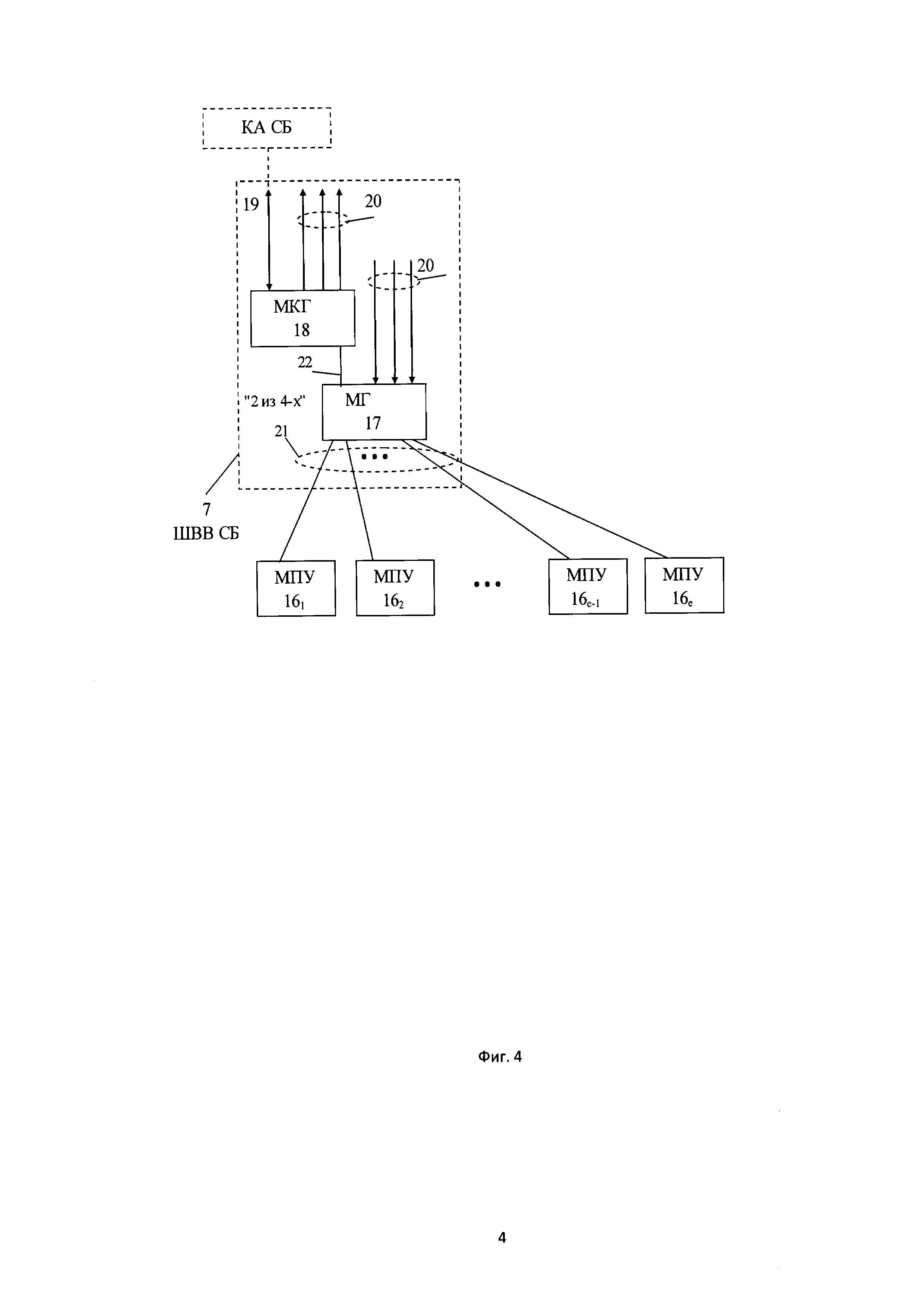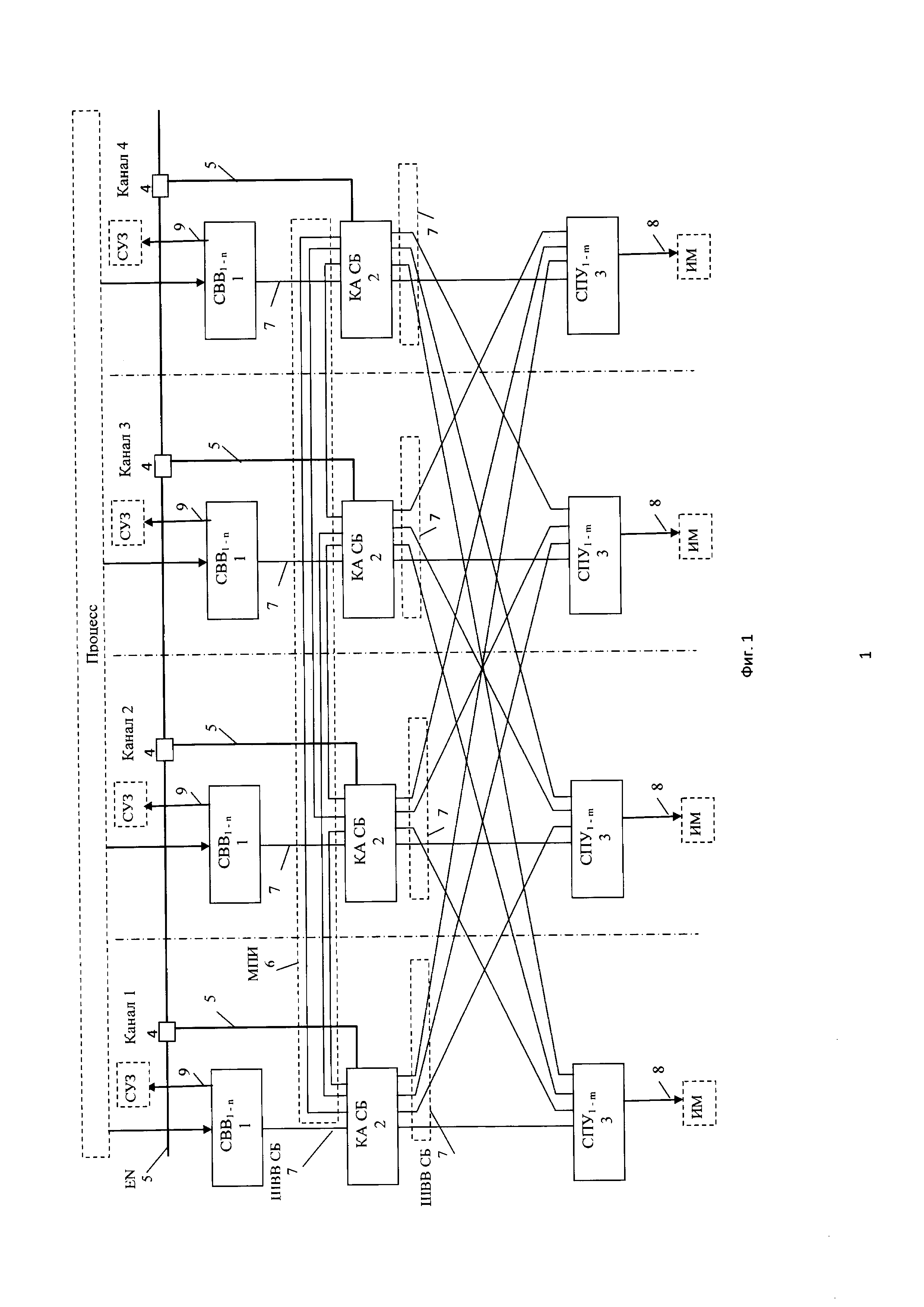 Изобретение относится к автоматике и вычислительной технике и может быть использовано в системах автоматизированного контроля и управления атомными электростанциями (АЭС) для построения управляющих систем безопасности (УСБ) АЭС. Известна цифровая система защиты атомной станции (патент США №6049578, МПК G21C 7/36, публ. 11.04.2000, аналог), состоящая из четырех идентичных каналов обработки и управления, обеспечивающих распознавание аварийной ситуации на объекте путем сравнения цифровых значений измеряемых параметров с заданными уставками и выполнения заданных пользователем защитных действий в случае выхода параметров за границы уставок. Каналы безопасности, физически отделенные друг от друга, перекрестно соединены по оптоволоконным линиям связи. Каждый канал состоит из аналоговых и дискретных датчиков, связанных с этим каналом; аналогово-цифровых преобразователей, обеспечивающих на выходе цифровое представление измеряемых аналоговых сигналов; бистабильного процессора; логического процессора соответствия и логического процессора инициирования процедур управления исполнительными механизмами и средств автоматической защиты реактора. Бистабильный процессор принимает цифровые значения измеренных сигналов собственного канала, преобразует их в технологические параметры, проверяет измеренные параметры на отклонение за установленные границы, формирует по каждому параметру двоичный признак отклонения, передает эти признаки по оптоволоконным линиям в другие каналы обработки и управления. Логический процессор соответствия получает от бистабильного процессора своего канала двоичные признаки отклонения параметров сигналов данного канала и принимает по оптоволоконным линиям от других каналов двоичные признаки отклонения по соответствующим параметрам. По каждому параметру логический процессор соответствия проверяет поступление признаков выхода за допустимые границы 2-х из 4-х каналов. Если процессор соответствия обнаруживает отклонение от допустимых значений параметров по 2-м из 4-х каналов, то логический процессор инициирования формирует необходимые команды для остановки реактора и приведения в действие цифровых технических средств безопасности. Аналог имеет следующие недостатки. Обмен данными между каналами по оптоволоконным линиям связи и обработка этих данных по мажоритарному принципу резервирования "2 из 4-х" производится только на начальном этапе сбора и обработки входных сигналов датчиков технологического процесса. Это снижает надежность системы защиты и может вызвать появление в каналах безопасности ложных команд защиты и управления из-за неисправностей в логике обработки и инициирования управления исполнительными механизмами. Прикладное программное обеспечение системы распределено между несколькими процессорами, выполняющими отдельные задачи защиты. Это снижает надежность, усложняет прикладные программы защиты и затрудняет разработку прикладного программного обеспечения автоматизированными методами, которые позволяют исключить на уровне прикладных алгоритмов программные ошибки, вызывающие отказы по общей причине во всех каналах системы защиты. В каждом канале четырехканальной системы защиты имеется отдельная аппаратура контроля и тестовые панели, но отсутствуют программно-техни