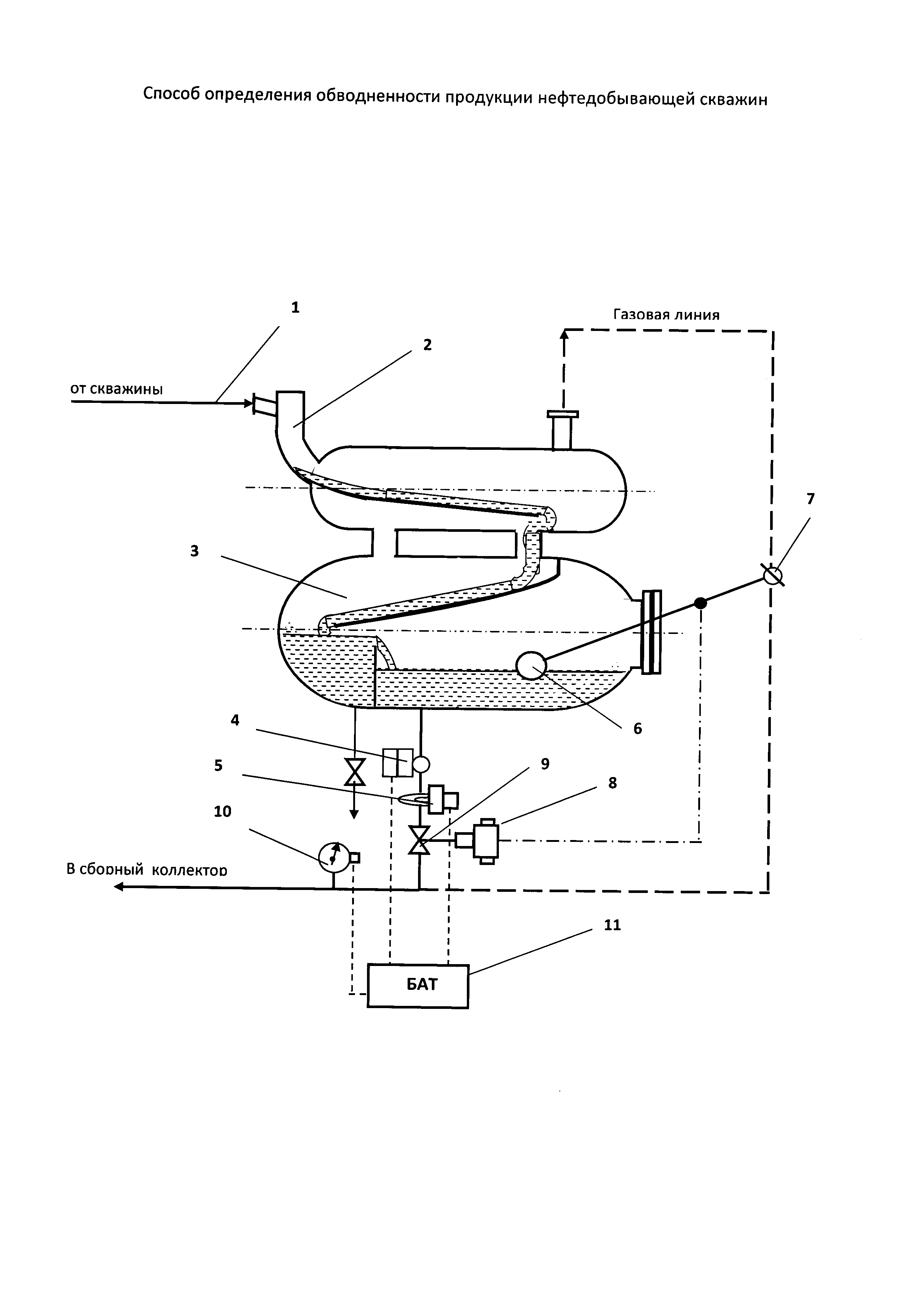 Изобретение относится к нефтяной промышленности и может найти применение при определении обводненности продукции нефтедобывающей скважины. Известен способ определения обводненности жидкости в продукции нефтяных скважин заключающийся в том, что представительную пробу жидкости, содержащейся в вертикальном цилиндрическом сосуде, доводят отстоем, обработкой химреагентами и нагревом до состояния, по крайней мере, неполного расслоения на нефть и воду. Измеряют высоту столба жидкости, гидростатическое давление, а затем в процессе опорожнения этого сосуда производят непрерывные измерения гидростатического давления и высоты столба жидкости. Плотности воды и нефти в составе жидкости определяют как частное от деления разности максимального и текущего перепадов гидростатического давления и соответствующей разности высот столба жидкости в начале и конце опорожнения. Накапливают массив данных. Строят график зависимости плотности сливаемой жидкости от высоты столба жидкости или времени опорожнения. Выбирают в пределах верхнего и нижнего горизонтальных линейных участков плотности соответственно воды и нефти. По выбранным значениям плотностей воды и нефти определяют массовую обводненность продукции скважины. Техническим результатом является упрощение алгоритма определения плотностей воды и нефти в составе продукции скважины, повышение точности измерения высокой и низкой обводненности продукции скважины (Патент РФ №2396427, опубл. 10.08.2010). Наиболее близким к предложенному изобретению по технической сущности является способ измерения дебита продукции нефтяных скважин в системах герметизированного сбора, в котором измерительную емкость калиброванного объема после продувки продукцией скважины наполняют частично отсепарированной продукцией скважины в течение предварительно назначенного с учетом максимальной производительности устройства времени при открытой на коллектор газовой и закрытой сливной жидкостной линиях. По истечении назначенного времени поступление продукцией скважины в измерительную емкость прекращают. Частично отсепарированную продукцией скважины, содержащуюся в резервуаре уровнемера измерительную емкость, обрабатывают химреагентами, нагревают и выдерживают до состояния расслоения на нефть и воду. Затем измеряют высоту столба жидкости, гидростатическое давление (ГСД) и температуру. Производят расчет производительности по жидкости. Затем по взаиморасположению линий раздела сред жидкость - газ и вода - нефть судят об объемном значении обводненности. Массовое соотношение вода - нефть определяют, применяя значения плотности воды, измеренной в резервуаре уровнемера измерительную емкость, и плотности нефти. При этом учитывают то количество жидкости, которое остается в системе сепаратор -измерительную емкость после ее "продувки" продукцией скважины перед началом процедуры замера. Потом одновременно с закрытием газовой и открытием жидкостной линий на коллектор возобновляют поступление продукцией скважины в измерительную емкость и, определив скорость опорожнения измерительную емкость и избыточное давление, производят расчет производительности по газу. Плотность воды определяют до полного ухода воды из резервуара уровнемера при его опорожнении после возобновления поступления проду
