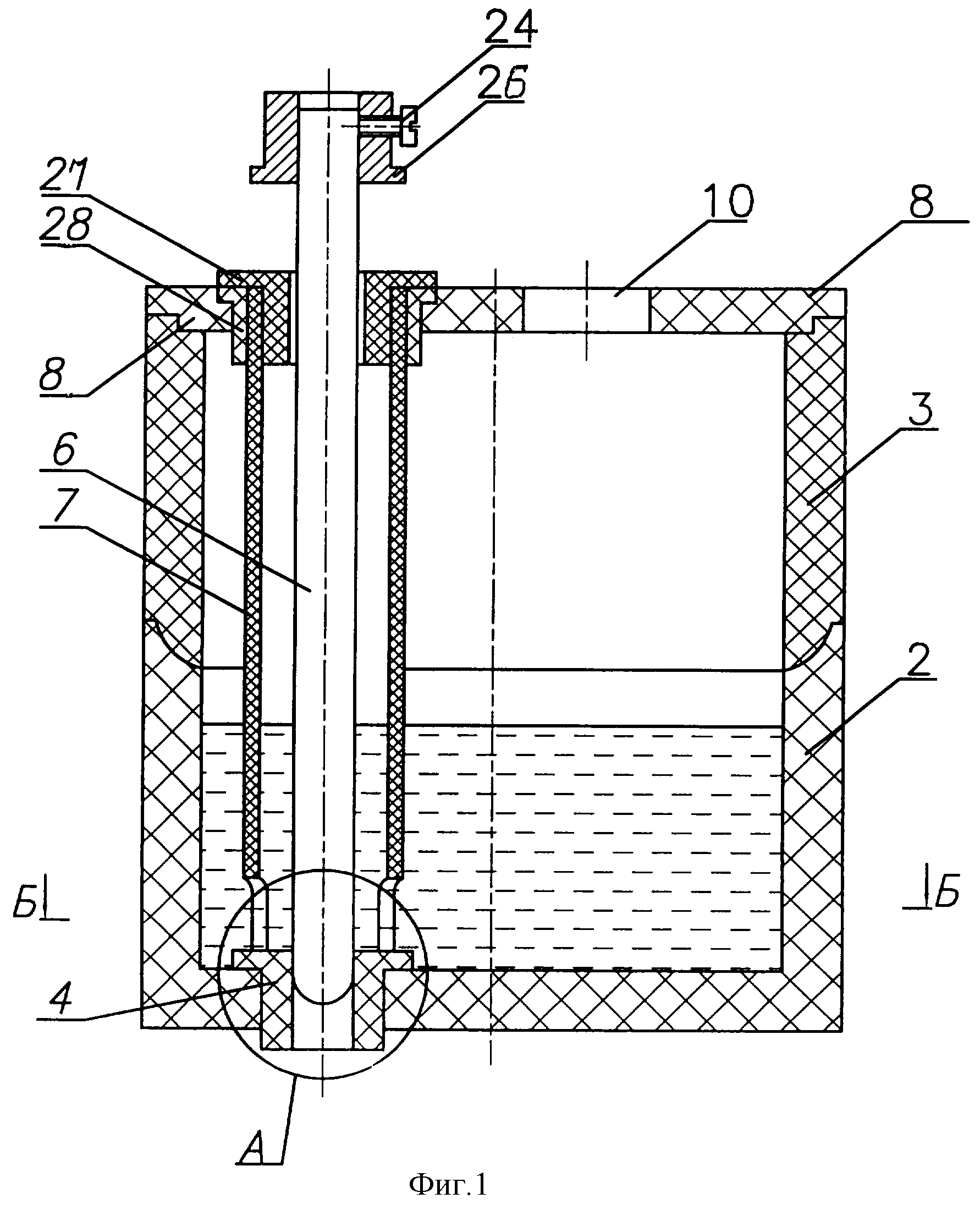 стопора 6. В разделительную перегородку 7 вставляется направляющая втулка 27 и вводится стопор 6, который прижимается к втулке 4 грузом 26, закрепленным в верхней части стопора 6. В пространство тигля