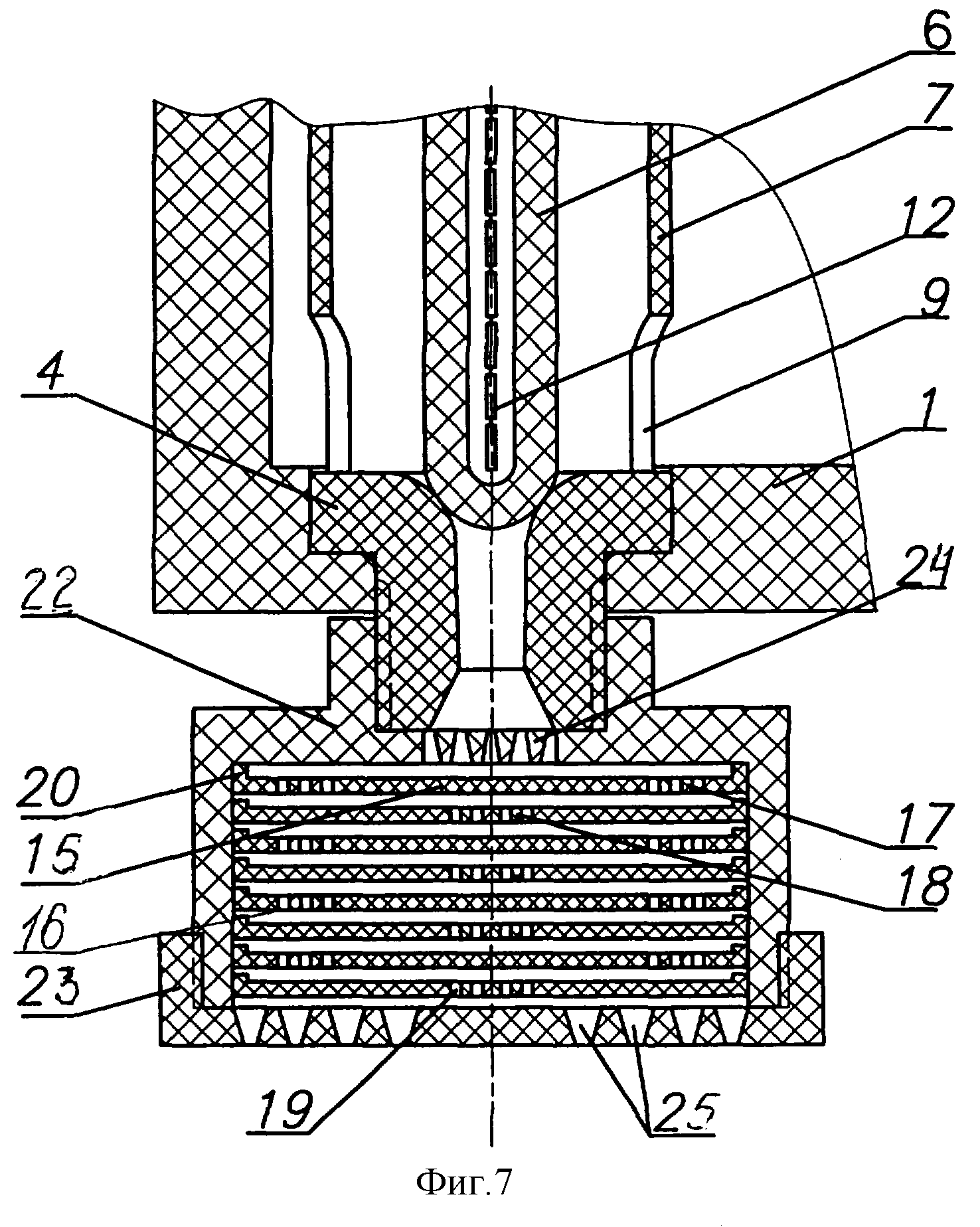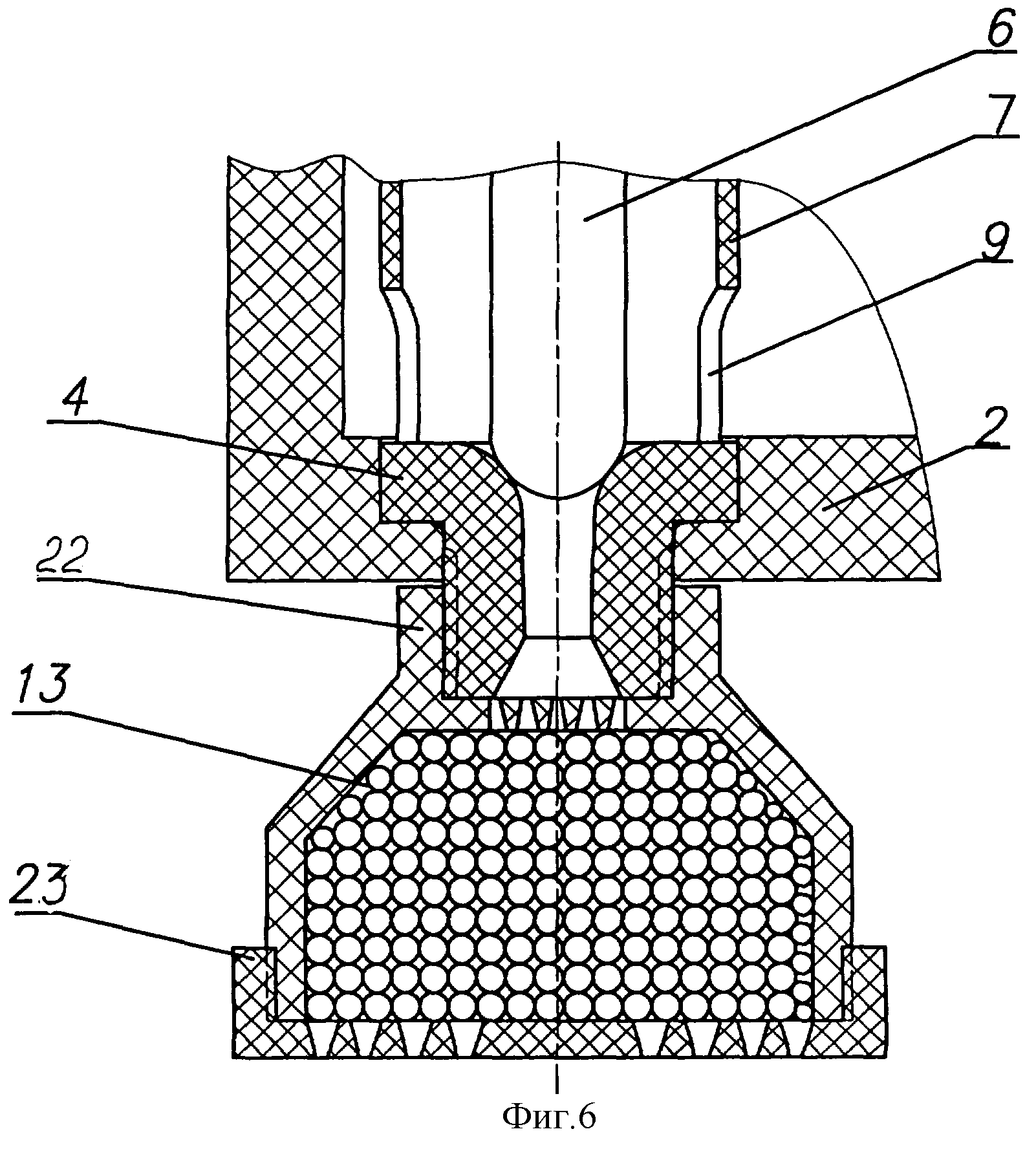 23 может быть выполнена перфорация с формой отверстий 24 и 25, например, в виде усеченного конуса. Стопор 6 может быть выполнен пустотелым с возможностью размещения в нем термопары 12. Стопор 6 в