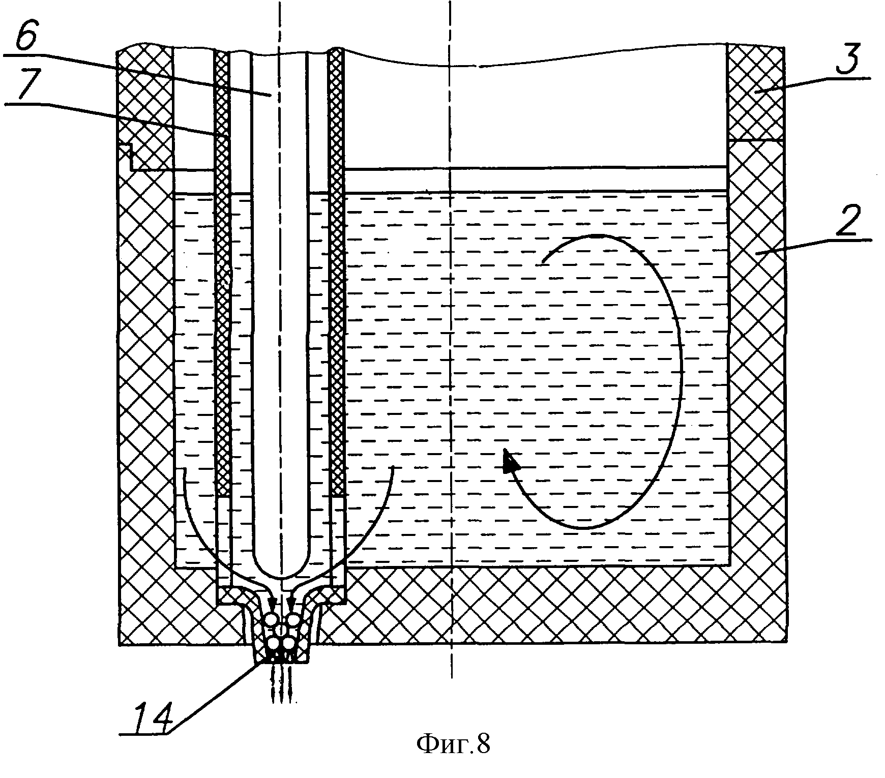 друга и корпуса 1 тигля. Фильтрующие элементы 13 могут быть расположены непосредственно во втулке 4 донного выпускного отверстия 5, образуя с ней фильтр 14. Однако фильтр 14 может иметь другую