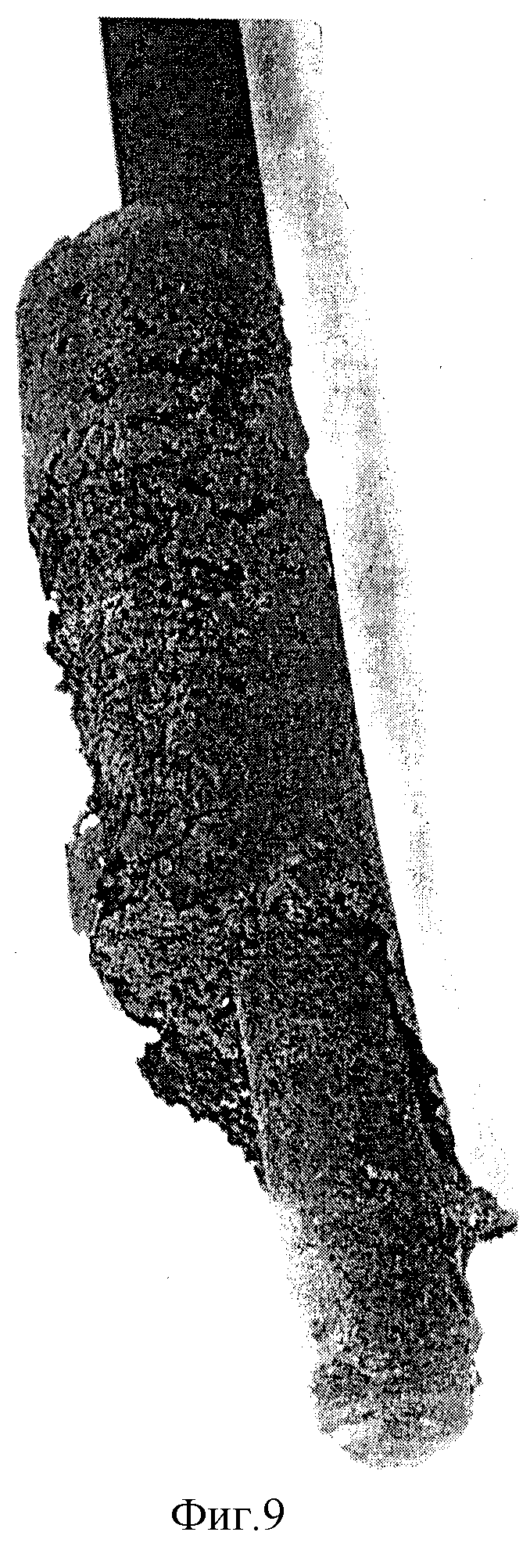 на фиг.9 - стопор с налипшими частицами неметаллических включений. Устройство содержит корпус 1 тигля, который может состоять из плавильной чаши 2 тигля и надставки 3