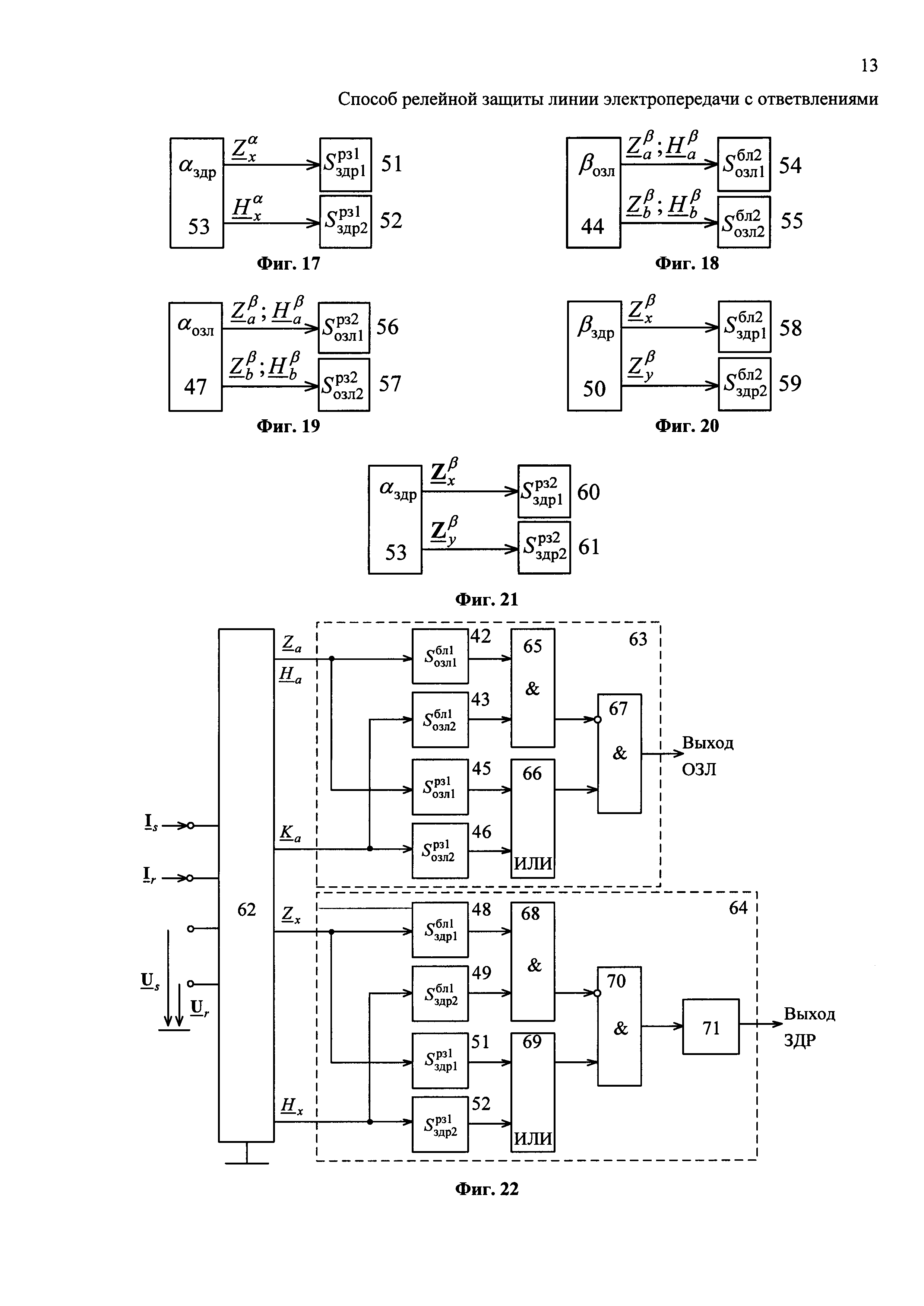 - комплексных векторов, то же и в преобразовательных моделях 19, 22, 30, 33, от комплексных скалярных замеров (1)-(10). Дело в том, что замеры определяют для отдельных двухпроводных контуров линии электропередачи. Разделение входных векторов на отдельные элементы совершается в объединенном входном блоке 62. Кроме него в структуре защиты присутствует два объединенных выходных блока 63 и 64, выполняющих соответственно функции основной защиты линии (ОЗЛ) и защиты дальнего резервирования (ЗДР). От входного блока 62 на выходные 63 и 64 поступают комплексные сигналы в виде замеров