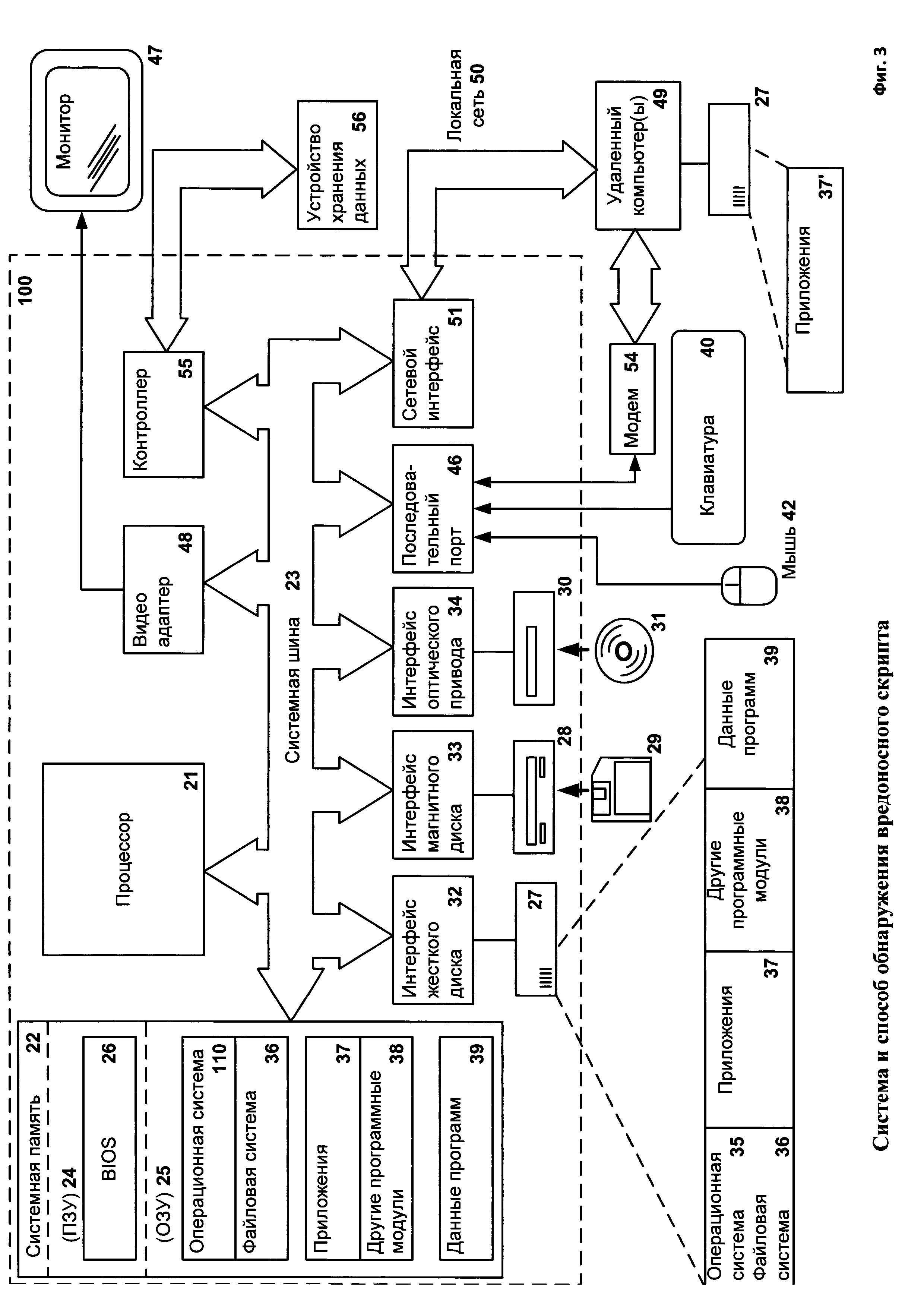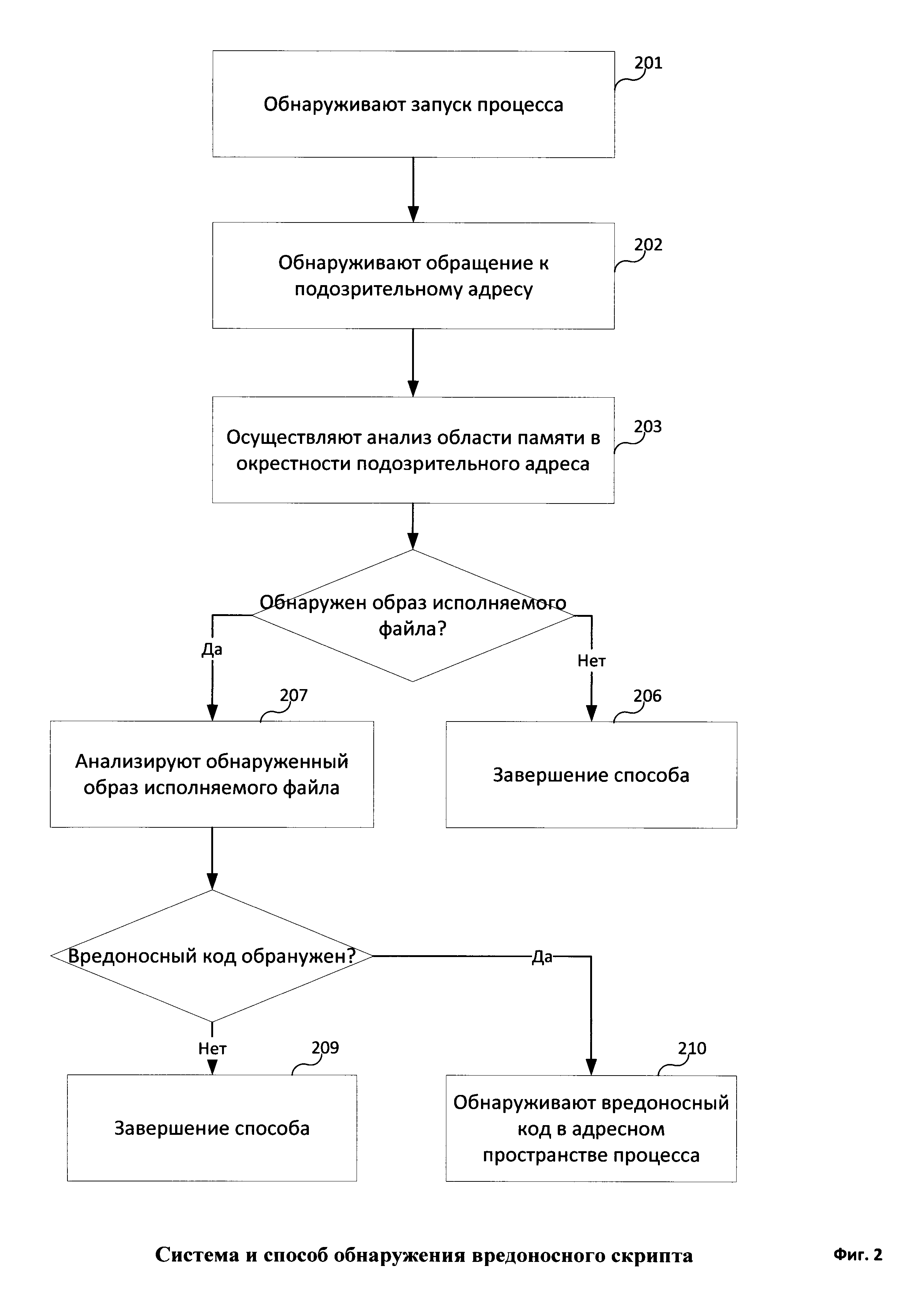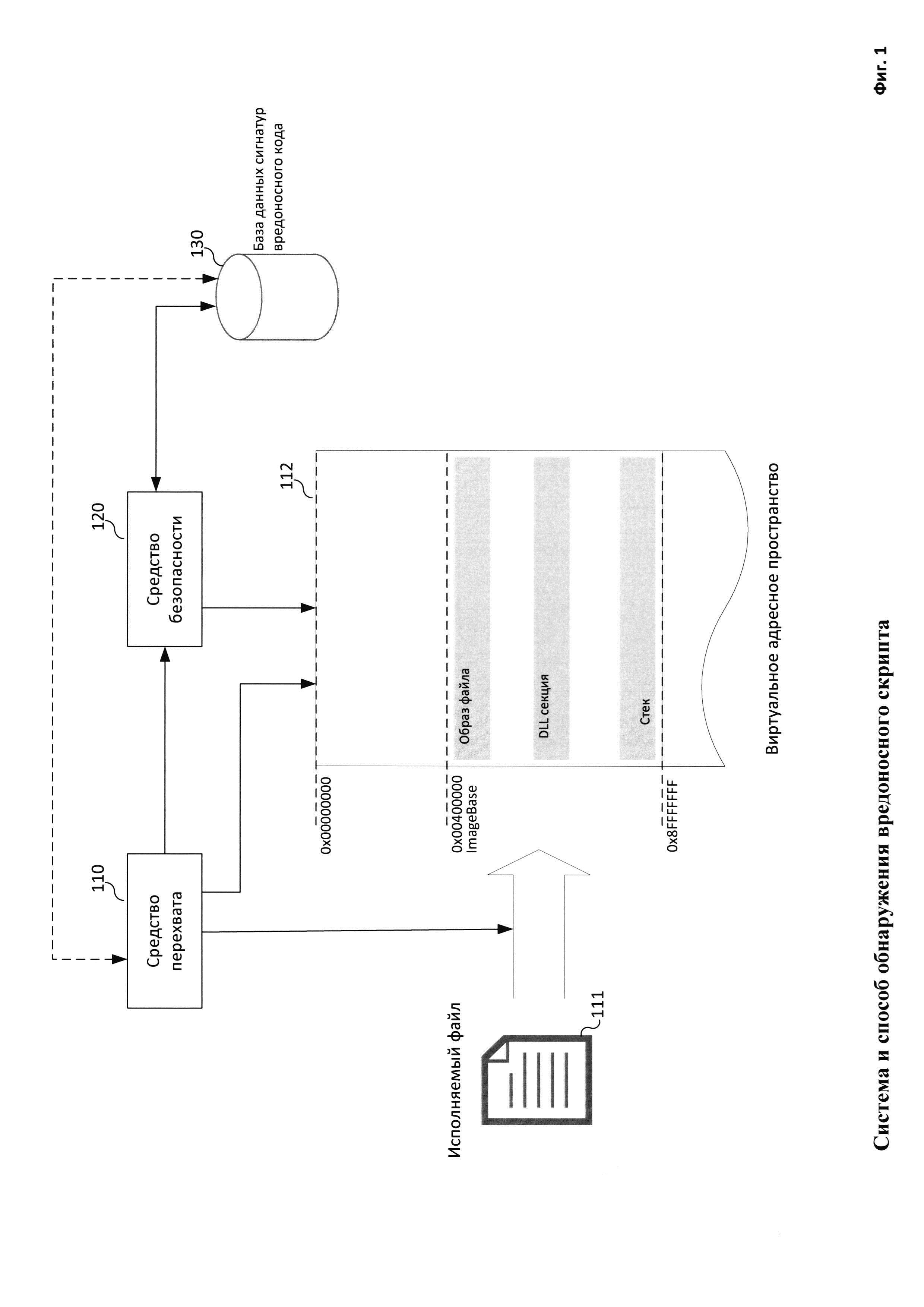 1. Способ обнаружения вредоносного скрипта, выполняемый при помощи компьютерной системы, в котором: a. обнаруживают при помощи средства перехвата запуск процесса из доверенного исполняемого файла скриптового интерпретатора; при этом в адресном пространстве процесса находится образ упомянутого исполняемого файла; b. обнаруживают при помощи средства перехвата обращение, осуществляемое при исполнении процесса, к подозрительному адресу памяти; при этом адрес памяти является подозрительным, если этот адрес памяти принадлежит подозрительной области памяти в адресном пространстве процесса; подозрительной областью памяти в адресном пространстве процесса, запущенного из исполняемого файла, является область памяти, которая находится за пределами образа исполняемого файла в упомянутом адресном пространстве и в то же время является исполняемой областью памяти; c. осуществляют при помощи средства безопасности анализ области памяти в адресном пространстве процесса в окрестности подозрительного адреса памяти, при этом во время анализа обнаруживают в адресном пространстве процесса образ исполняемого файла, загруженного из другого файла; d. обнаруживают при помощи средства безопасности вредоносный код в адресном пространстве процесса путем анализа обнаруженного образа исполняемого файла, загруженного из другого файла; при этом анализ осуществляется при помощи сигнатур вредоносного кода; e. признают при помощи средства безопасности вредоносным скрипт, инструкции которого выполнялись скриптовым интерпретатором до момента обнаружения вредоносного кода в адресном пространстве процесса, запущенного из доверенного исполняемого файла скриптового интерпретатора. 2. Способ по п. 1, в котором обращение к адресу памяти - операция записи адреса на стек или вызов функции для создания потока, аргументом которых является упомянутый адрес. 3. Способ по п. 1, в котором скриптовым интерпретатором является PowerShell. 4. Способ по п. 1, в котором окрестностью адреса памяти является область памяти, границы которой удалены от адреса памяти на фиксированные расстояния. 5. Способ по п. 1, в котором окрестностью адреса памяти является область памяти, соответствующая региону памяти, в котором находится упомянутый адрес памяти.