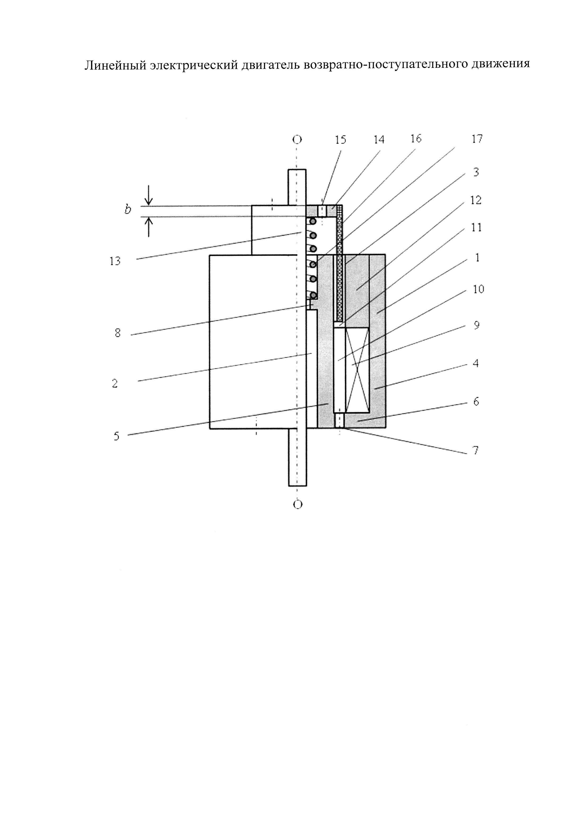 Линейный электрический двигатель возвратно-поступательного движения, содержащий сердечник с расположенной в нем обмоткой возбуждения, выполненной в виде катушки из электрического провода, и зафиксированной крышкой сердечника, которая выполнена в виде кольца с образованием у его внутренней поверхности рабочего зазора относительно сердечника, вал, установленный на продольной оси O сердечника, на внешнем конце которого со стороны крышки сердечника установлена крепежная арматура со сквозными технологическими отверстиями, обмотку подвижной части, зафиксированную на валу крепежной арматурой со стороны наружного торца, возвратную пружину, установленную по продольной оси O сердечника со стороны крышки сердечника, отличающийся тем, что сердечник выполнен в виде цилиндра со сквозным центральным осевым отверстием, расположенным на его продольной оси O, и аксиальным кольцевым пазом, при этом внешняя часть цилиндра, ограниченная кольцевым пазом, является внешней стенкой сердечника, внутренняя часть цилиндра между кольцевым пазом и центральным осевым отверстием является внутренней стенкой сердечника, а торцевая часть цилиндра, расположенная под кольцевым пазом, является торцевой стенкой сердечника, при этом в торцевой стенке сердечника на уровне внешней поверхности внутренней стенки сердечника выполнены шесть сквозных вентиляционных отверстий, равномерно распределенных по окружности, причем их диаметр составляет от 10% до 12% величины радиального размера кольцевого паза, на внутренней поверхности внутренней стенки сердечника выполнен опорный фланец в виде выступа в пространство центрального осевого отверстия, обмотка возбуждения расположена в кольцевом пазу сердечника вплотную к его внешней и торцевой стенкам, при этом со стороны внутренней стенки сердечника вдоль всей внутренней поверхности обмотки возбуждения выполнен вентиляционный зазор шириной от 10% до 15% величины радиального размера кольцевого паза, крышка сердечника установлена в кольцевой паз сердечника вплотную к его внешней стенке и обмотке возбуждения так, что внутренняя поверхность крышки сердечника расположена с рабочим зазором относительно внутренней стенки сердечника, при этом ширина рабочего зазора составляет от 50% до 100% ширины вентиляционного зазора, вал установлен внутри центрального осевого отверстия сердечника, крепежная арматура выполнена в виде диска, толщина b