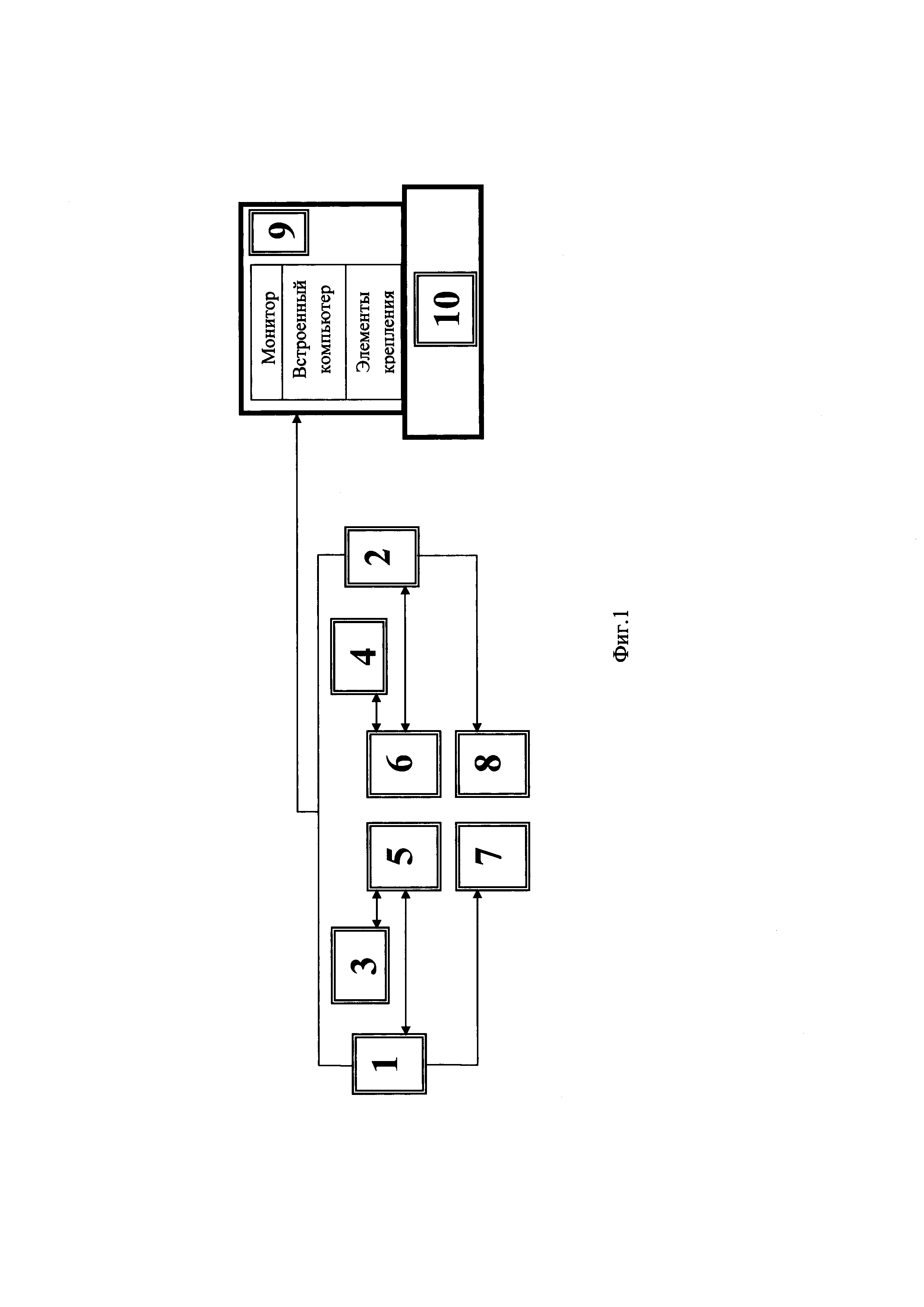 Изобретение относится к области авиационной техники и может быть использовано в составе бортового оборудования летательных аппаратов (ЛА), на которых в составе пилотажно-навигационного комплекса установлены электронные индикаторы отображения навигационной, пилотажной информации и выдачи информации о параметрах и состоянии силовой установки и общесамолетных систем. Известна система электронной индикации «СЭИ-85-2» (СЭИ), предназначенная для приема, преобразования и отображения на экранах электронных индикаторов пилотажно-навигационной информации, выбранная в качестве прототипа. Функционально СЭИ состоит из следующих блоков: - блоки электронного индикатора ИМ-8; - блоки вычисления и формирования БВФ-1-2; - пульты системы индикации ПУ СЭИ-2-1 (ПСИ-95М). Блоки электронного индикатора ИМ-8 предназначены для отображения пилотажно-навигационной информации и в зависимости от состава индицируемых параметров выполняют функции: - комплексного пилотажного индикатора (КПИ); - комплексного индикатора навигационной обстановки (КИНО). Блоки вычисления и формирования БВФ-1-2 предназначены для приема и обработки входных сигналов и параметров, формирования отображаемой на экранах индикаторов информации и выдачи информации в смежные системы. Пульты системы индикации ПСИ-95М предназначены для ручного управления конфигурацией и режимами системы. Каждый блок обеспечивает прием информации от систем пилотажно-навигационного комплекса по кодовым линиям связи разовых команд от самолетных систем (шасси, закрылки, кнопок на ручках управления двигателями (РУД)). Недостатком системы является отсутствие возможности экипажа проводить оценку пространственной информации (внекабинной обстановки - ландшафтов аэродромов) по строительной оси летательного аппарата в поле зрения командира при неблагоприятных погодных условиях видимости при выполнении режимов «ДВИЖЕНИЕ ПО АЭРОДРОМУ», «ВЗЛЕТ» или «ПОСАДКА». Недостаток влечет за собой повышенную психологическую напряженность экипажа, вероятность ошибочных действий, влияющих на безопасность выполнения режимов в соответствии с требованиями документов (РЛЭ Ту-204, Ту-214). Целью изобретения является повышение информационности системы в поле зрения командира экипажа при неблагоприятных погодных условиях видимости аэродромной обстановки и безопасности выполнения полетного задания. Поставленная цель достигается тем, что в устройство, содержащее блоки вычисления и формирования индикации, пульты системы индикации, блоки электронных индикаторов, дополнительно введен индикатор, выполненный в виде цифрового прозрачного монитора со встроенным компьютером и элементами крепления, при помощи которых индикатор крепится на козырек приборной доски пилотов, при этом индикатор электрически соединен с блоками вычисления и формирования индикации. Блок-схема устройства представлена на Фиг. 1. 1, 2 - блоки вычисления и формирования индикации БВФ-1-2, 3, 4 - пульты системы индикации ПУ СЭИ-2-1, 5, 6 - блоки электронных индикаторов ИМ-8 (формат КПИ), 7, 8 - блоки электронных индикаторов ИМ-8 (формат КИНО), 9 - индикатор синтезированного изображения (монитор, встроенный компьютер, элементы крепления индикатора), 10 - козырек приборной доски пилотов. Устройство работает следующим образом. Индикатор 9 элементами крепления неподвижн